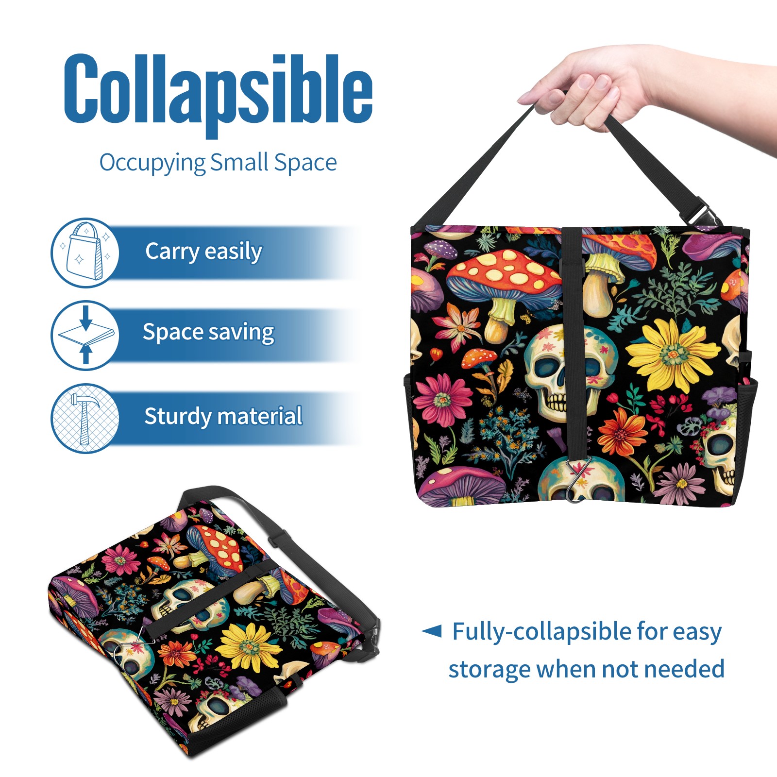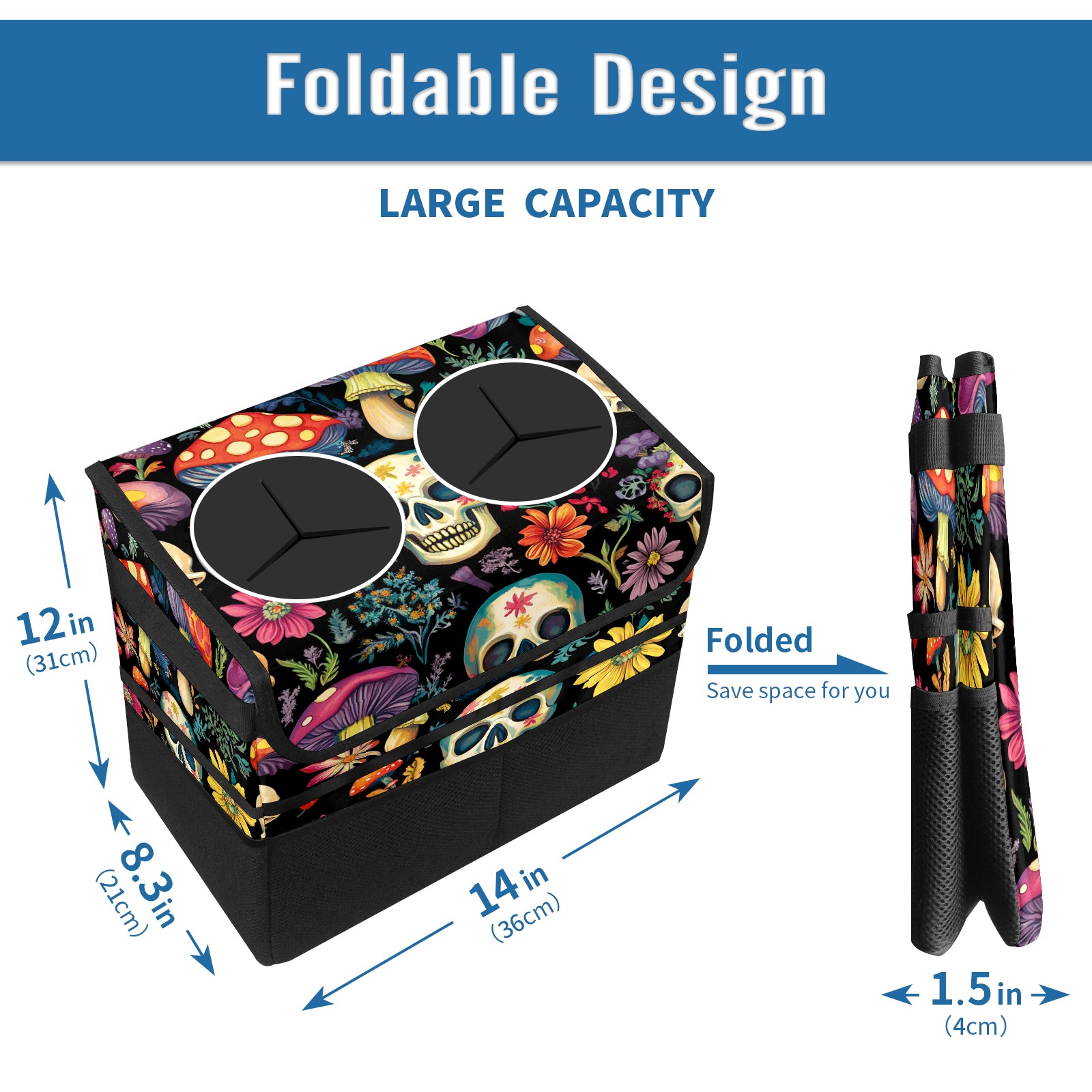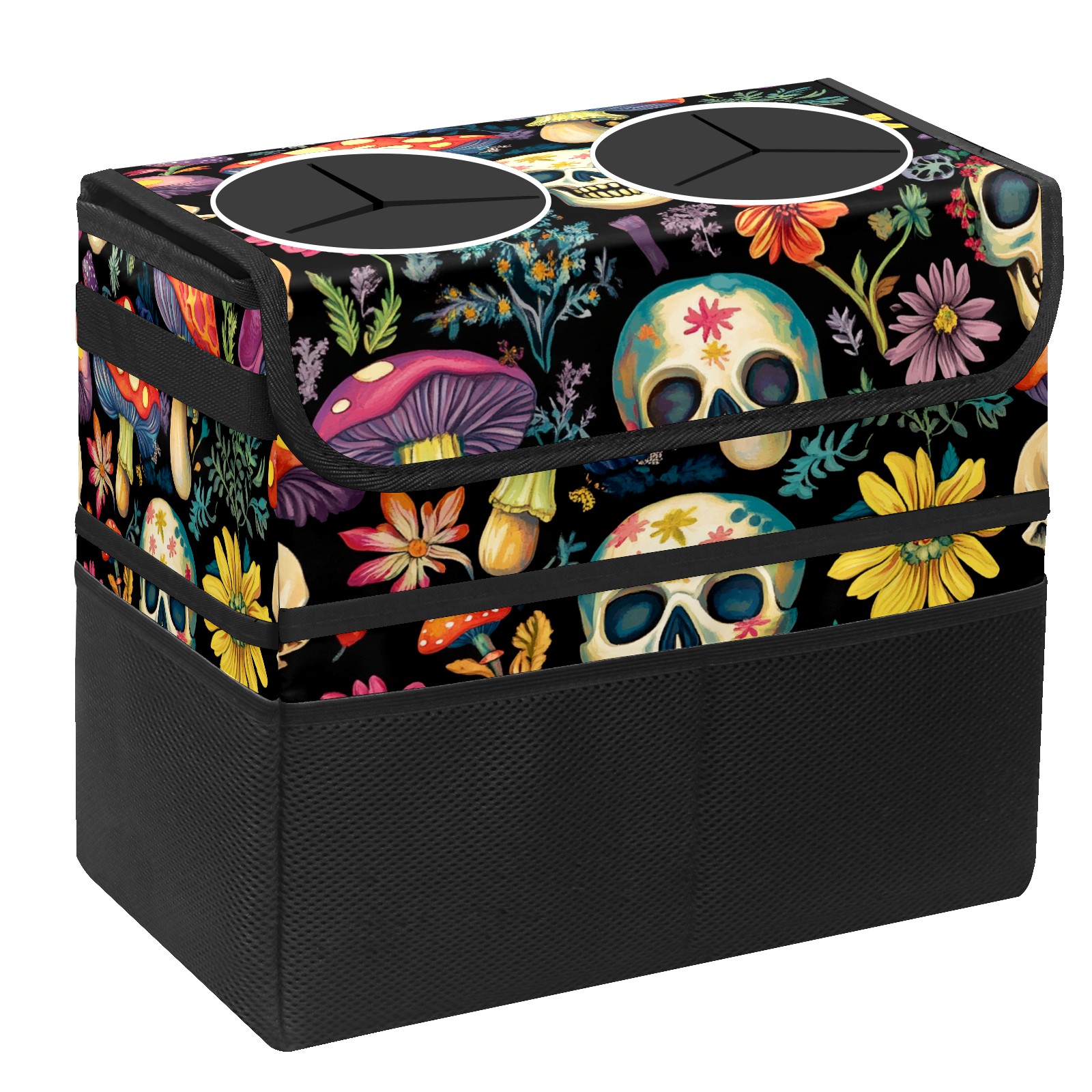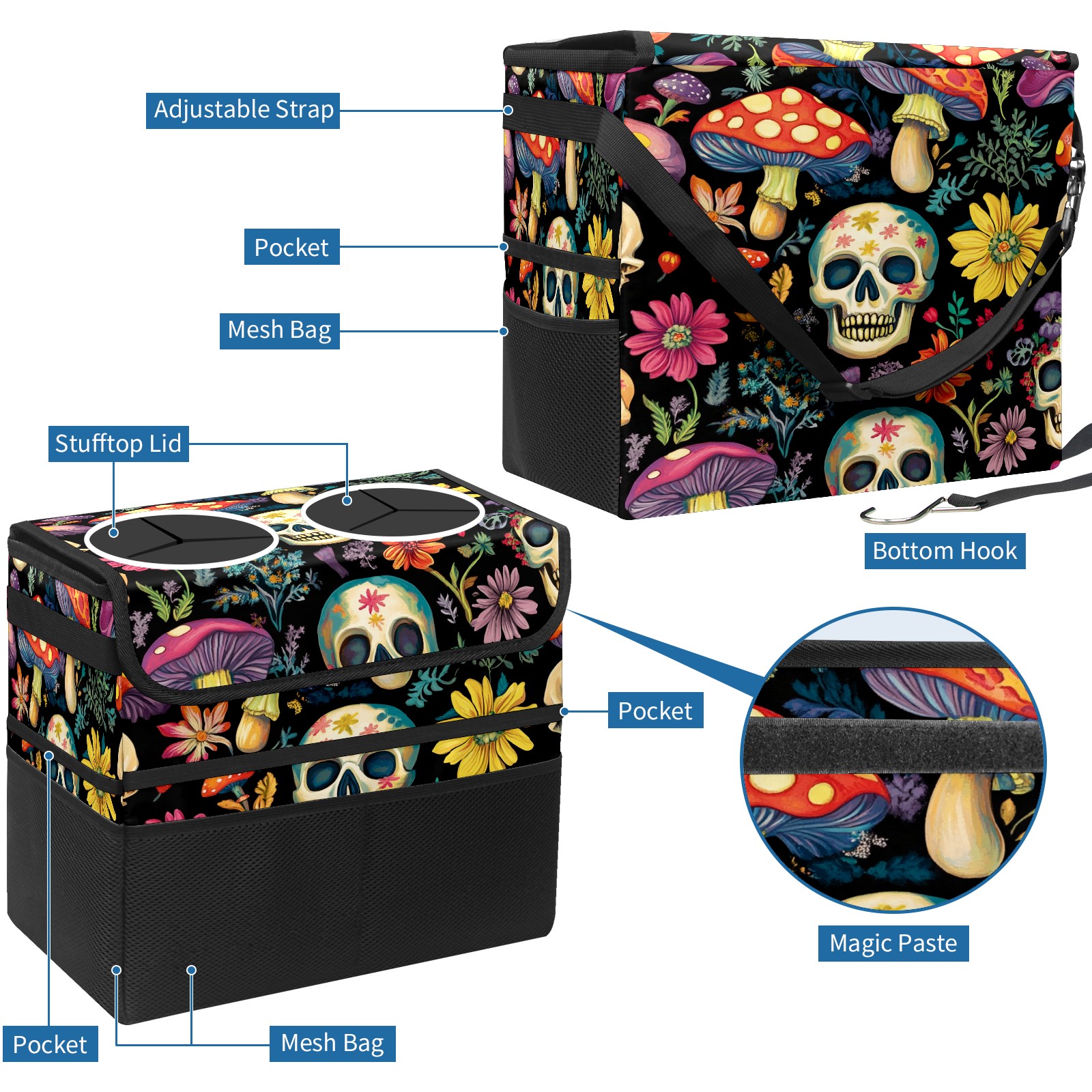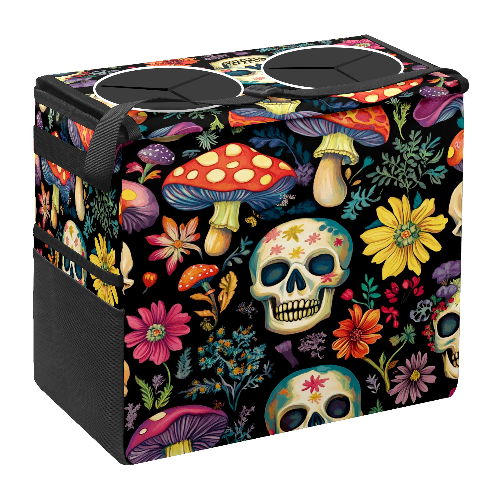 Car Trash Can with Lid, Portable Hanging Automotive Garbage Bin for Vehicles, Leakproof Waste Bag Container for SUV Truck Van Interior Auto Travel Road Trips(Skulls And Mushroom)