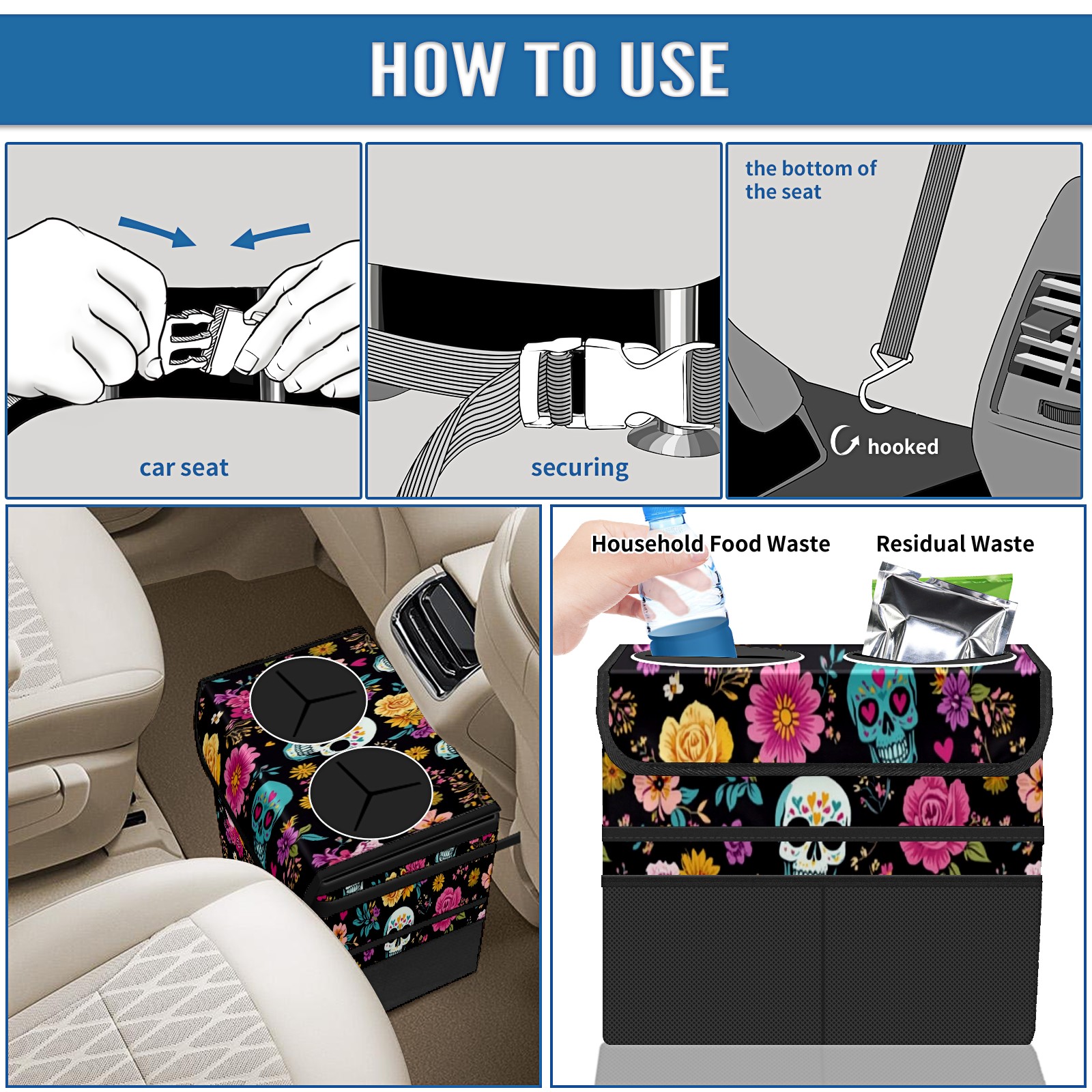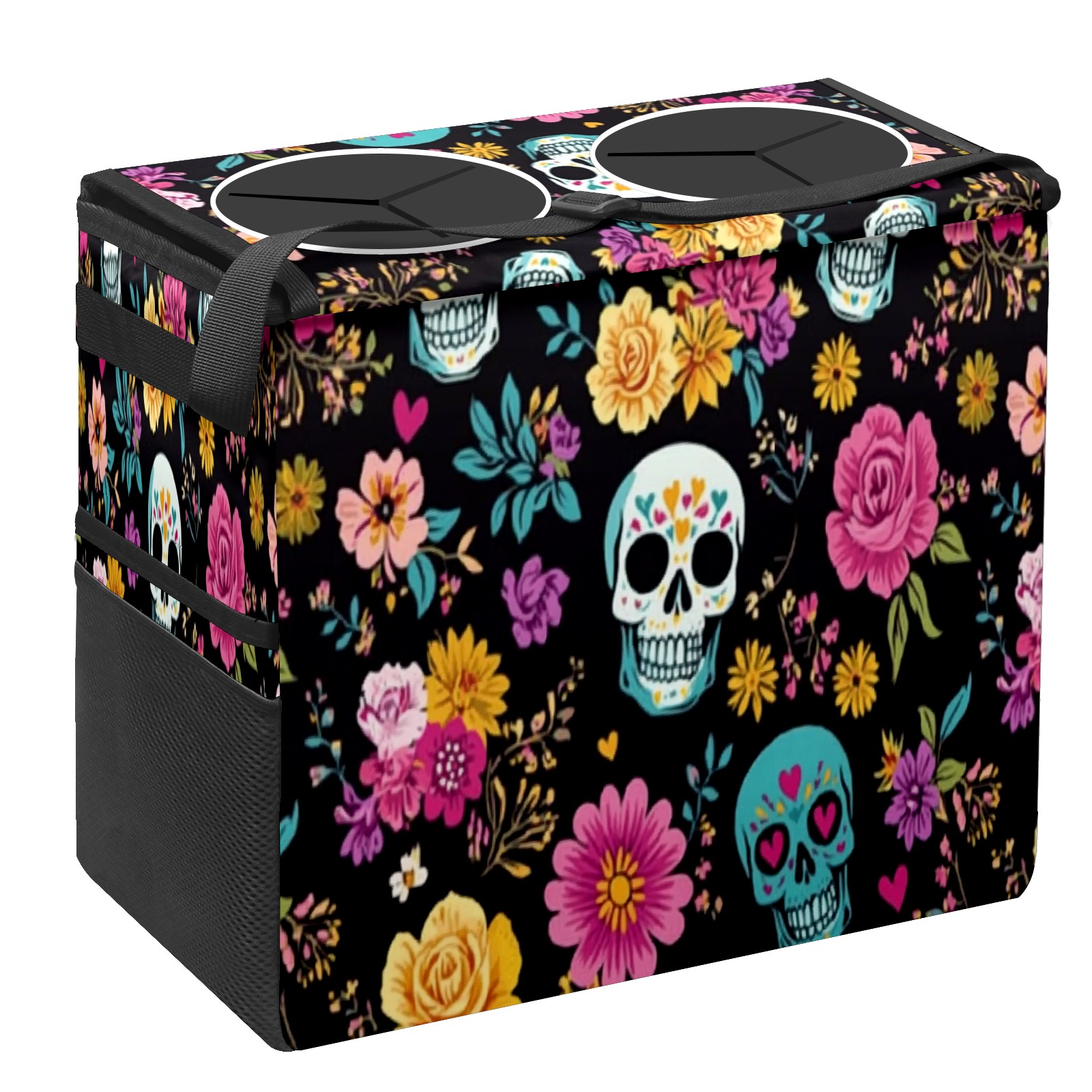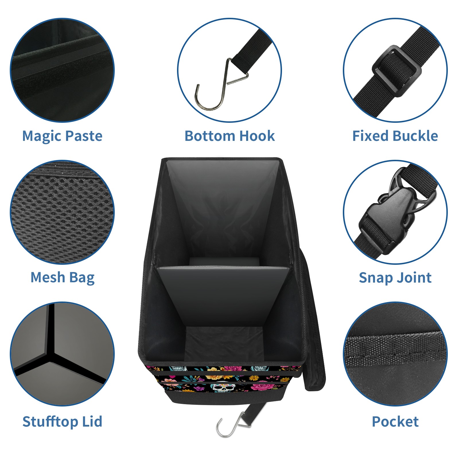 Car Trash Can with Lid, Portable Hanging Automotive Garbage Bin for Vehicles, Leakproof Waste Bag Container for SUV Truck Van Interior Auto Travel Road Trips(Skull And Colorful Floral)