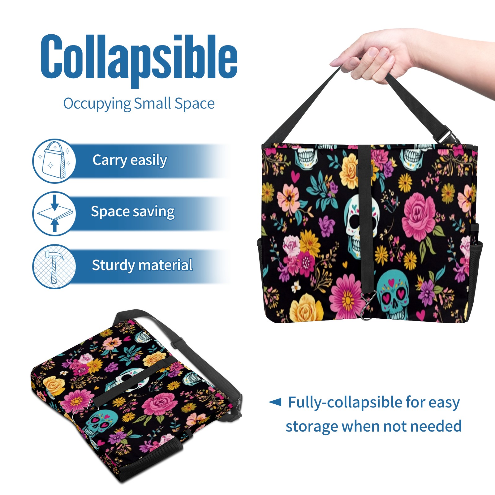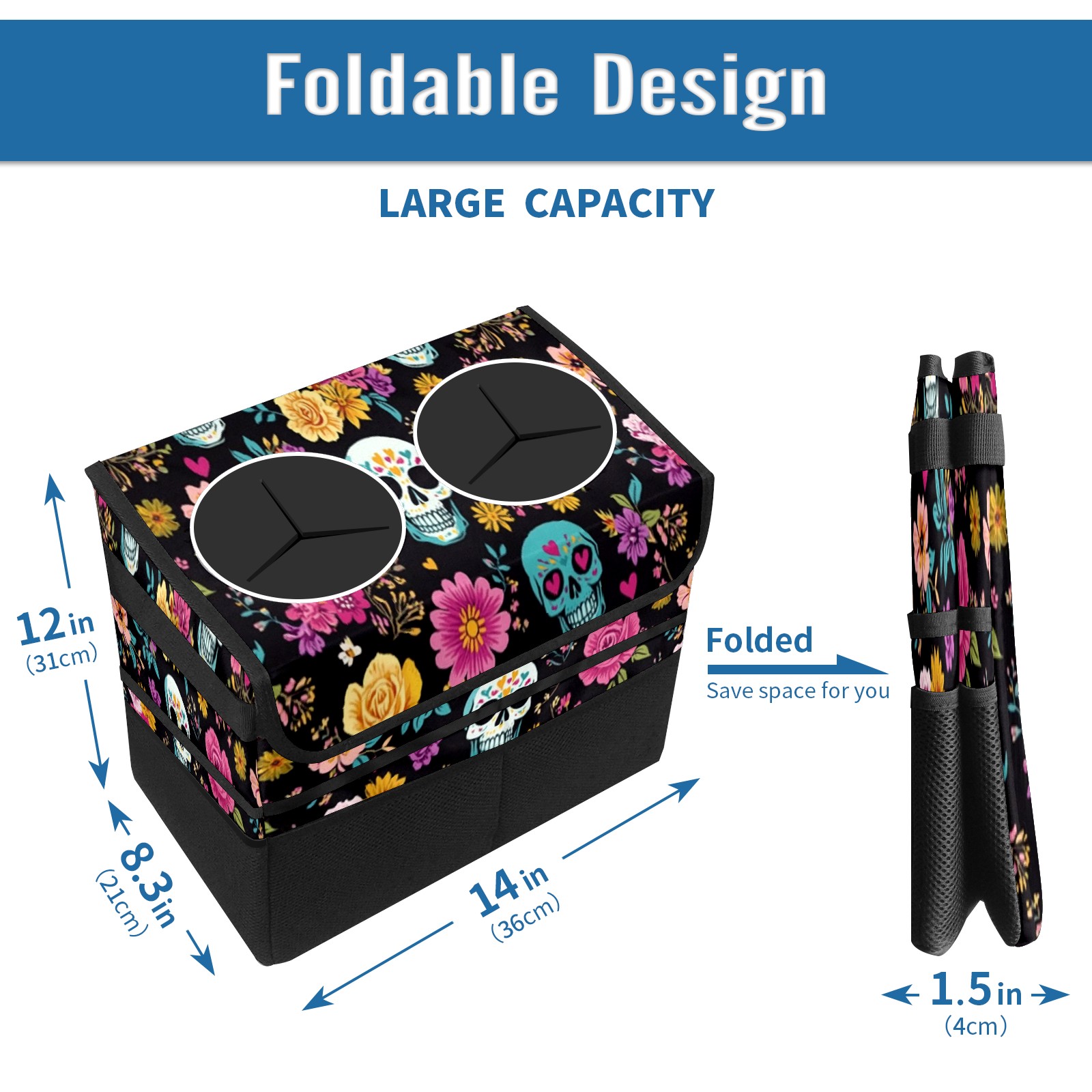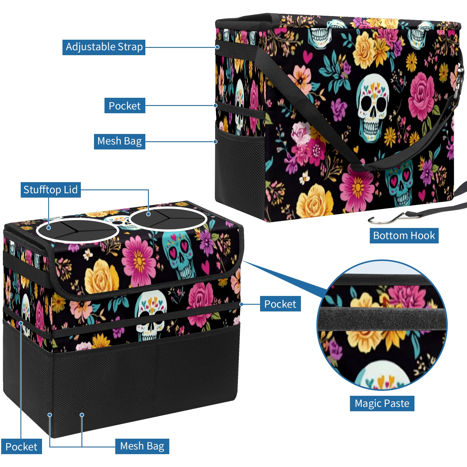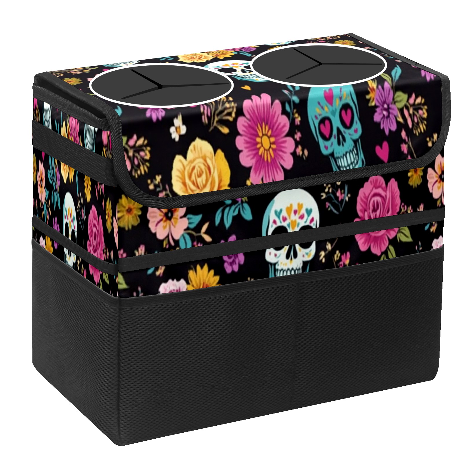 Car Trash Can with Lid, Portable Hanging Automotive Garbage Bin for Vehicles, Leakproof Waste Bag Container for SUV Truck Van Interior Auto Travel Road Trips(Skull And Colorful Floral)