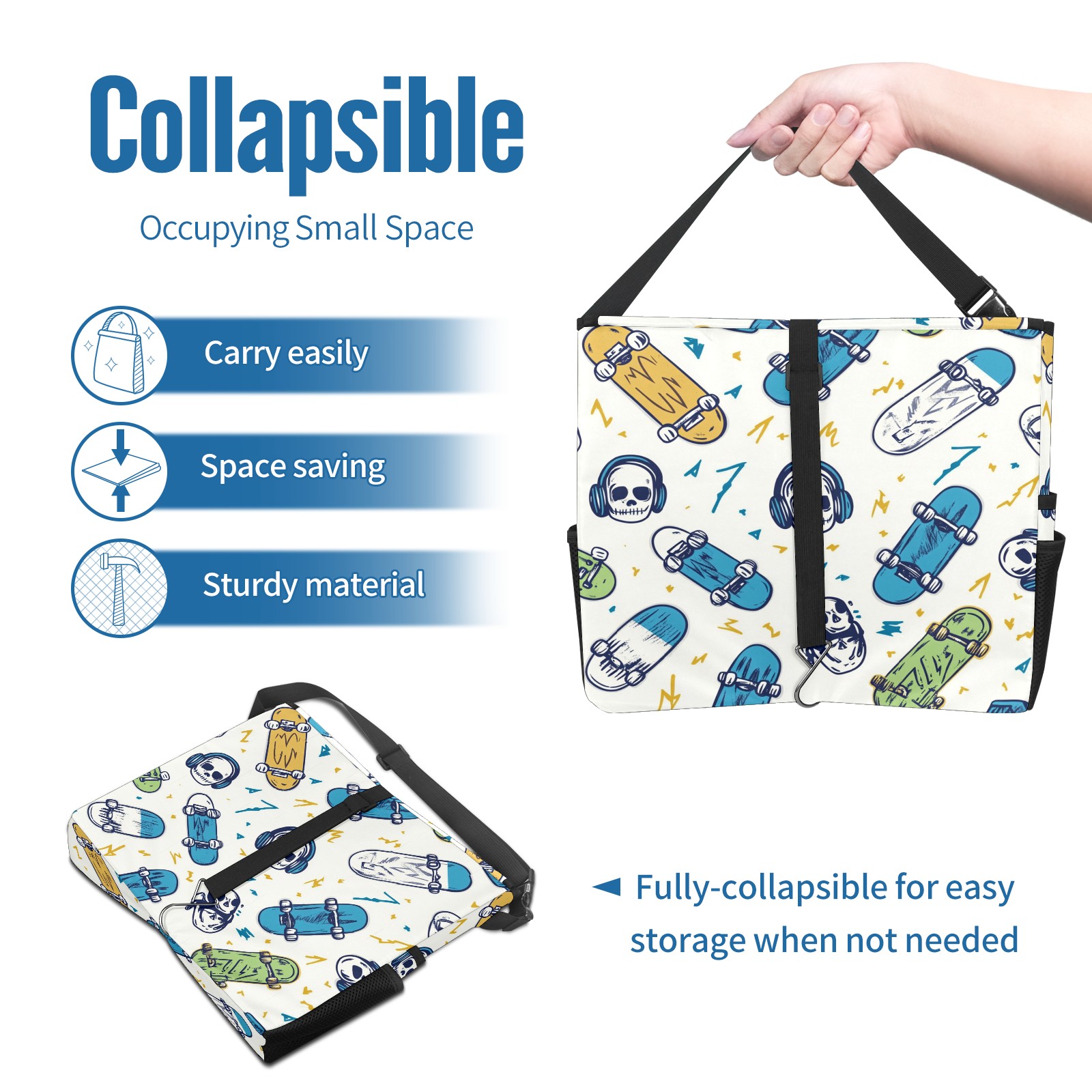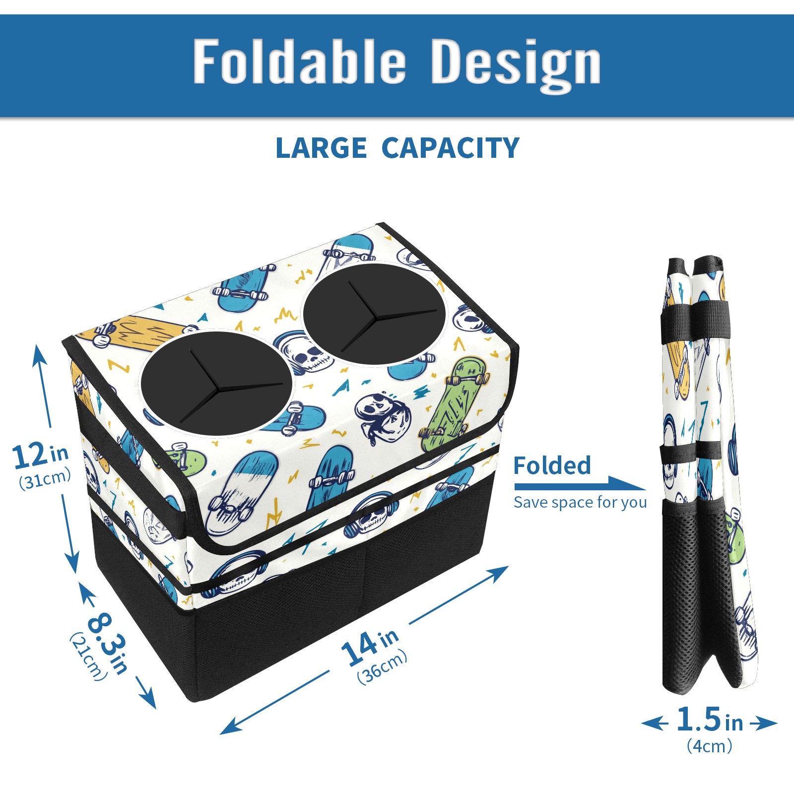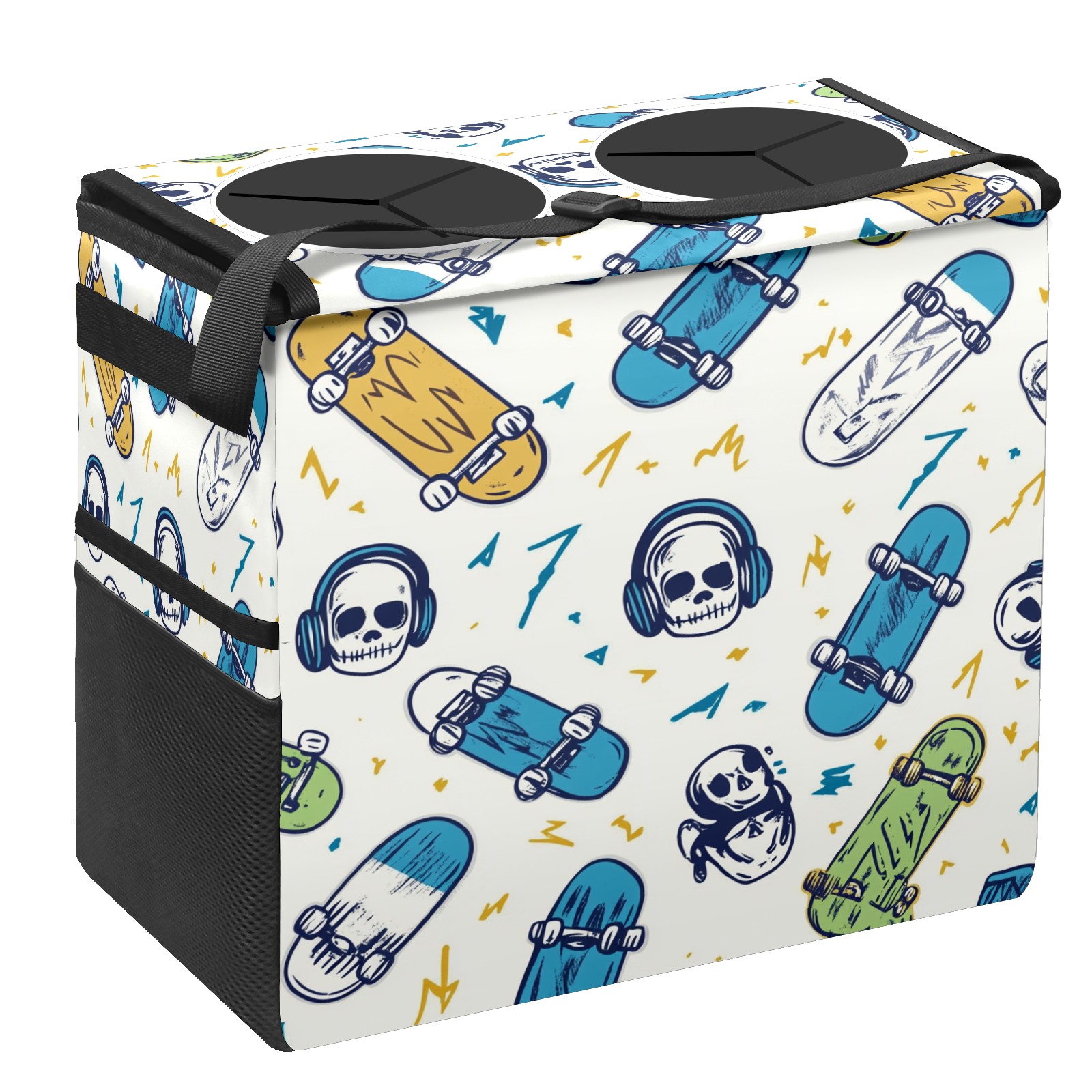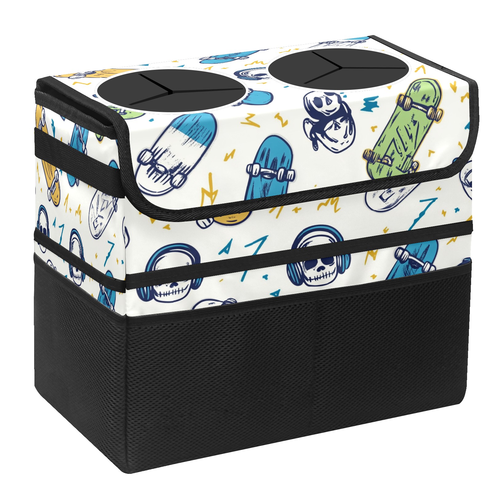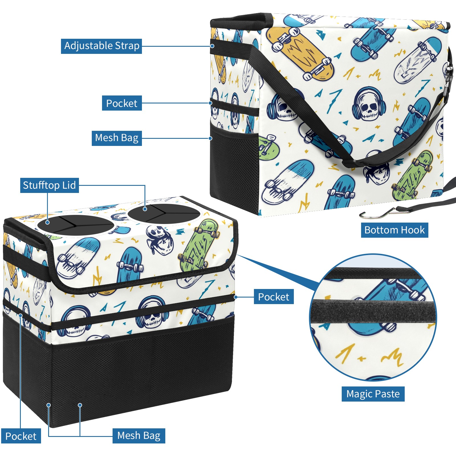 Car Trash Can with Lid, Portable Hanging Automotive Garbage Bin for Vehicles, Leakproof Waste Bag Container for SUV Truck Van Interior Auto Travel Road Trips(Skateboards And Skulls)