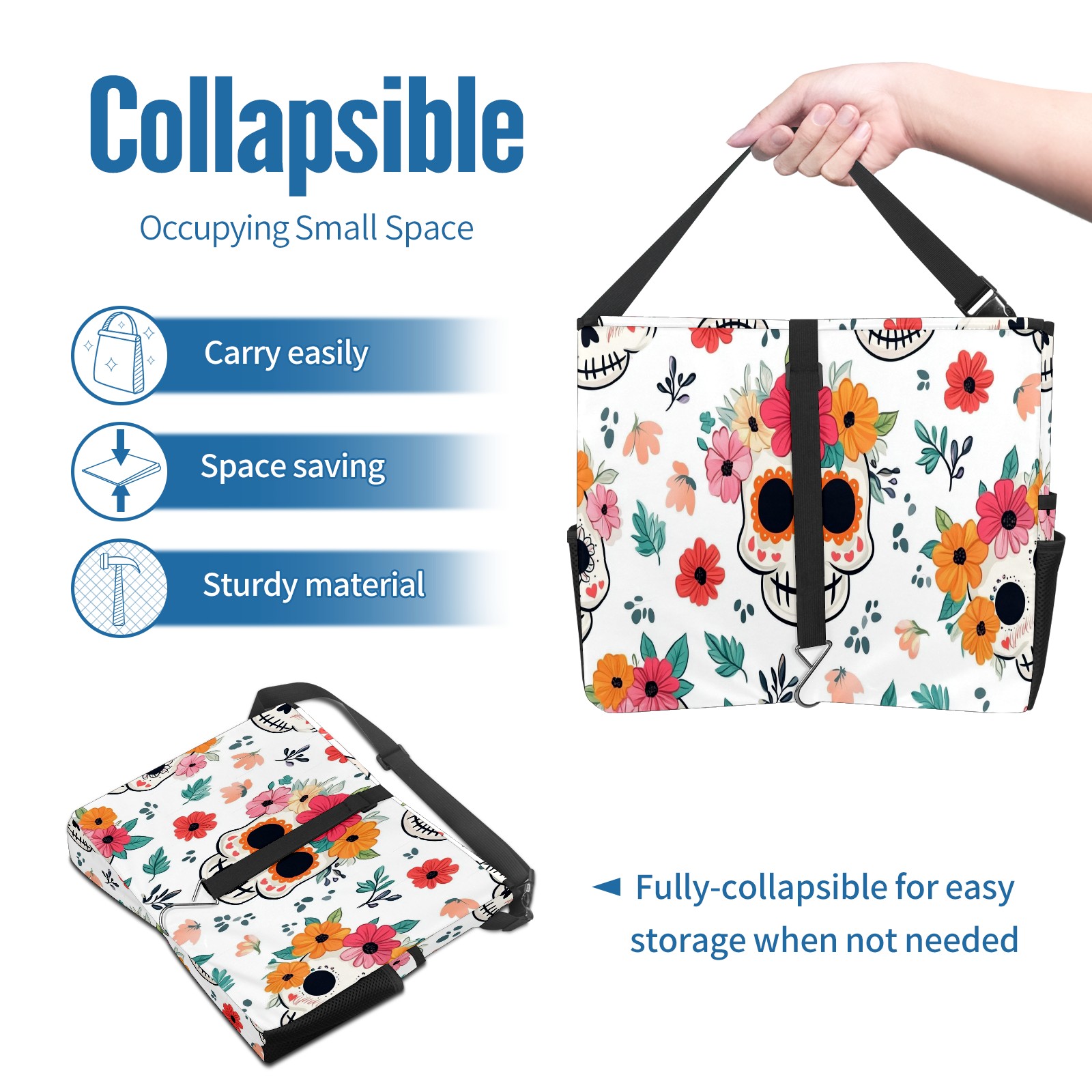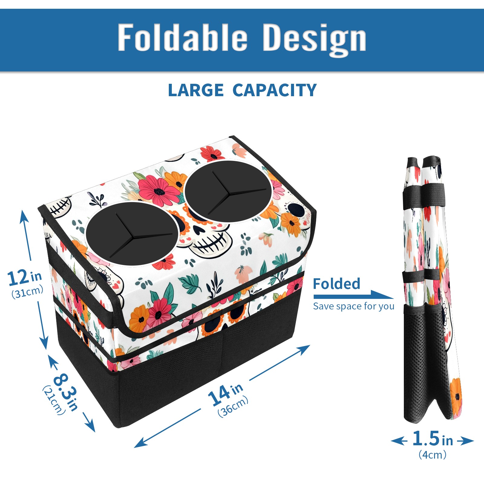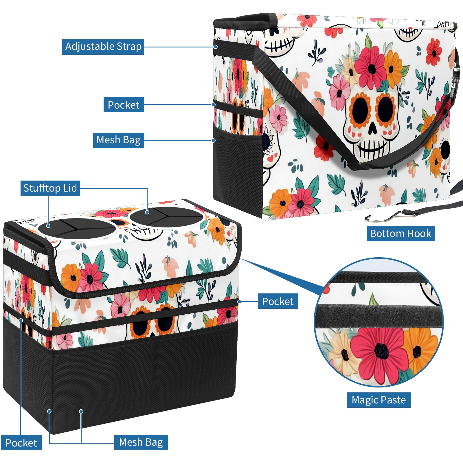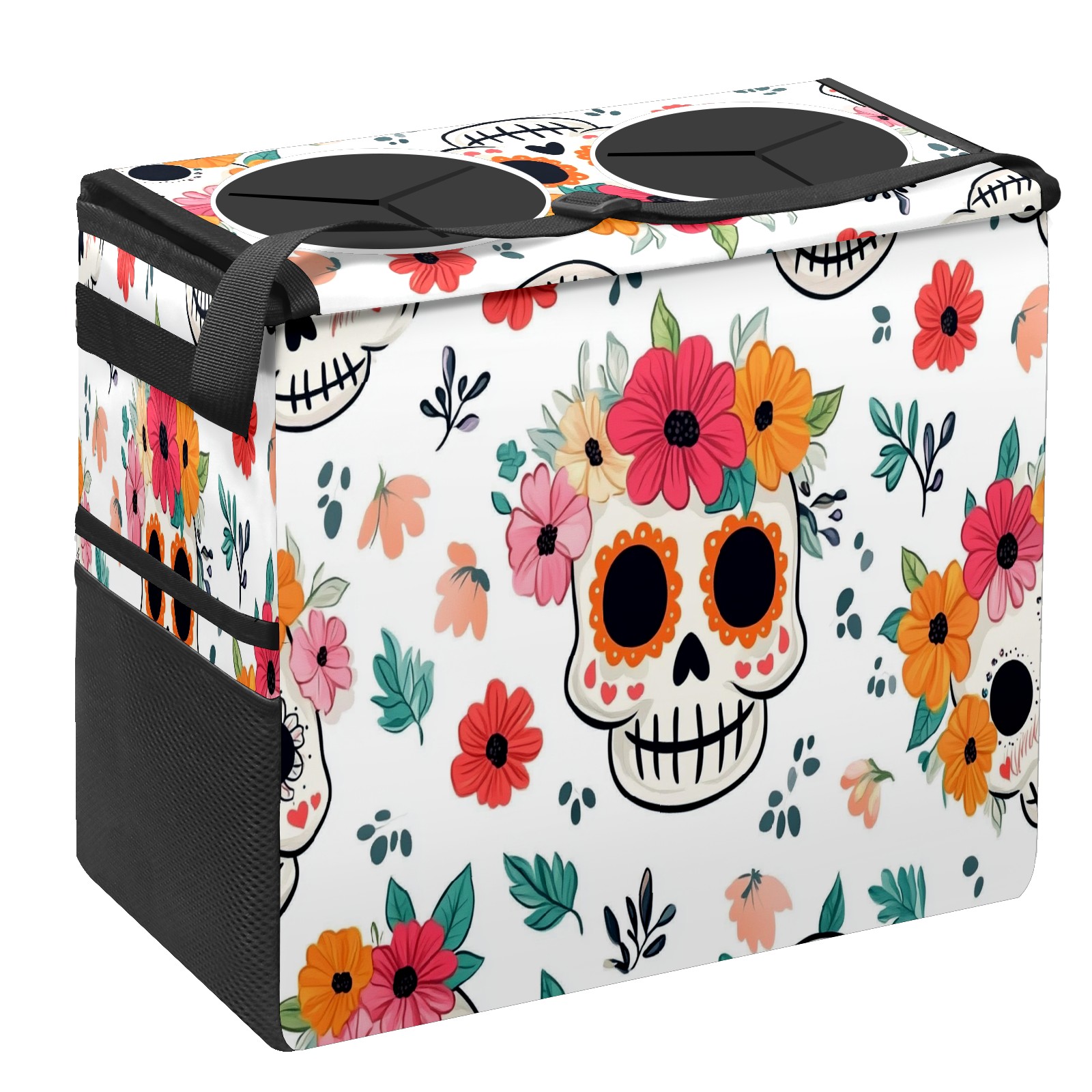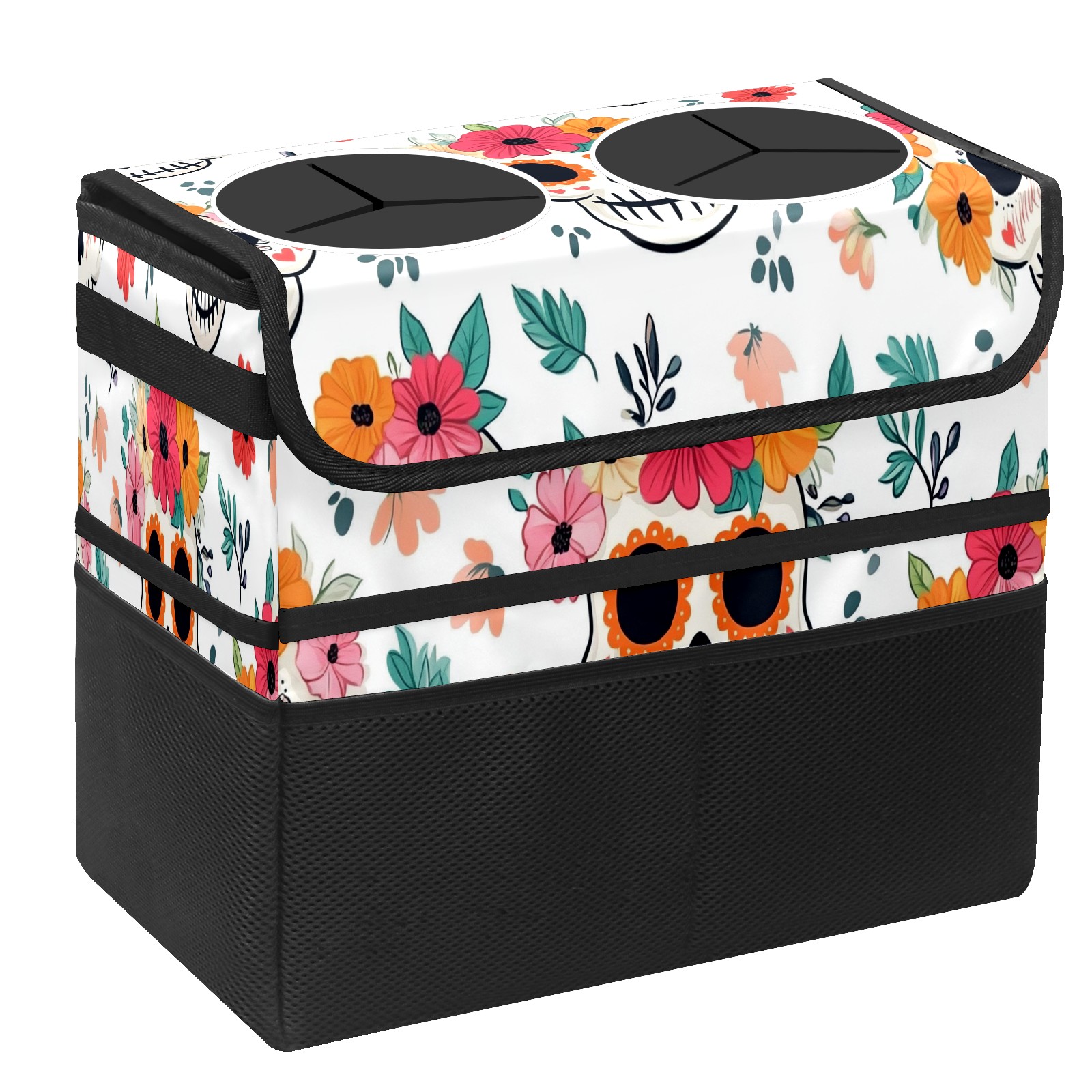 Car Trash Can with Lid, Portable Hanging Automotive Garbage Bin for Vehicles, Leakproof Waste Bag Container for SUV Truck Van Interior Auto Travel Road Trips(Cute Skull And Floral)