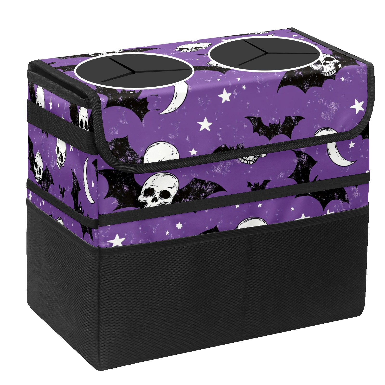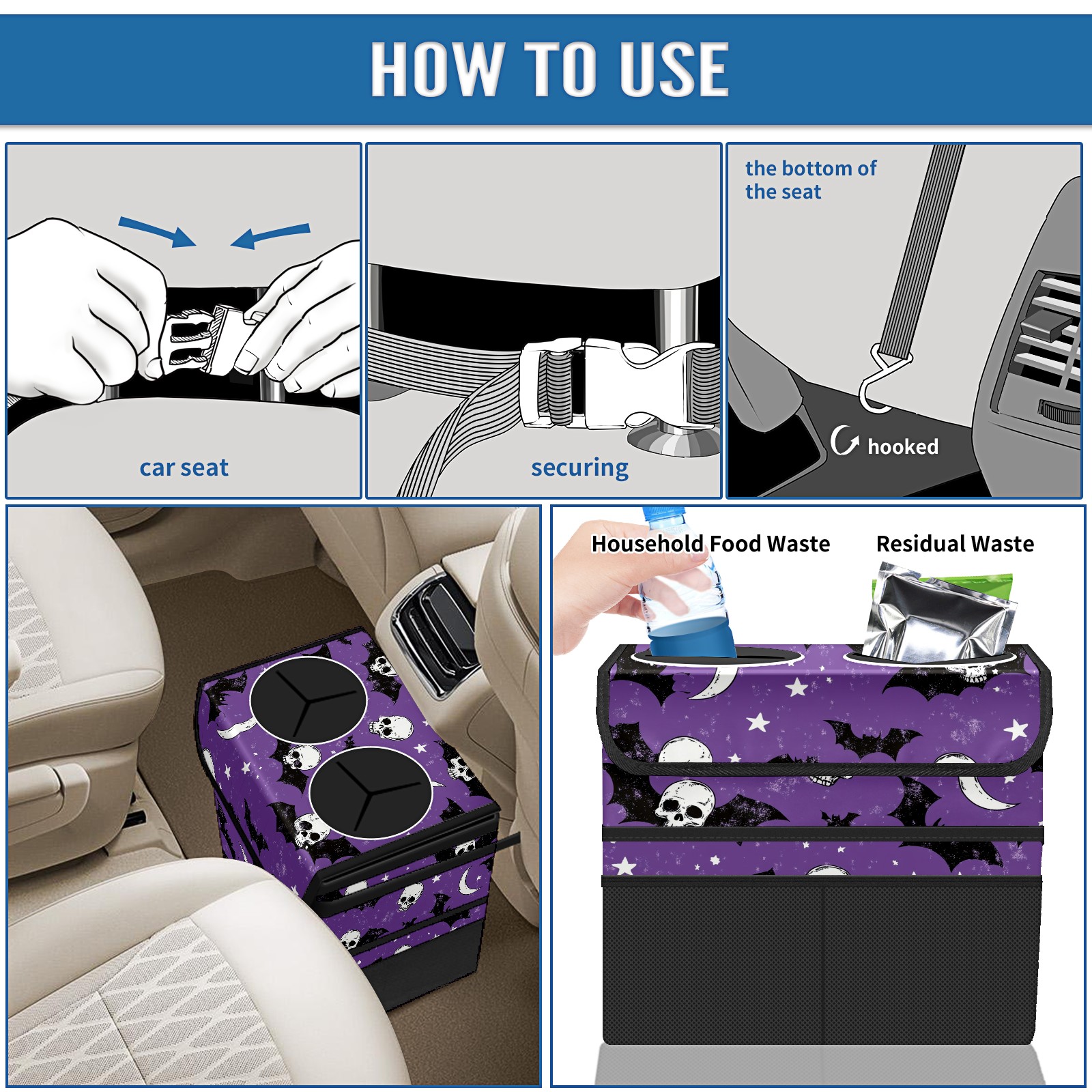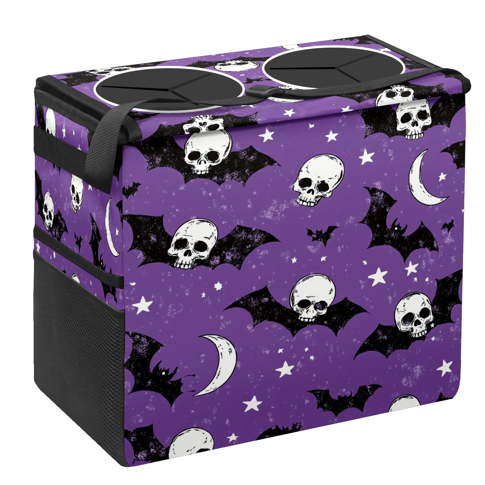 Car Trash Can with Lid, Portable Hanging Automotive Garbage Bin for Vehicles, Leakproof Waste Bag Container for SUV Truck Van Interior Auto Travel Road Trips(Bats And Skulls)