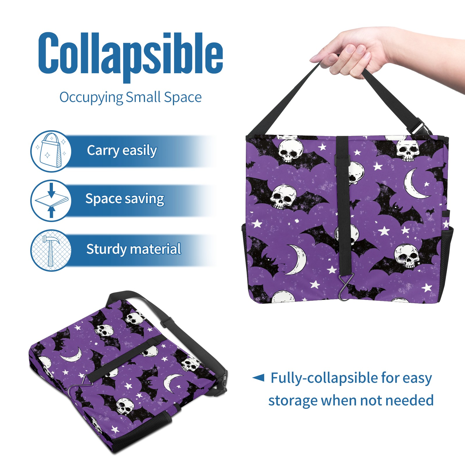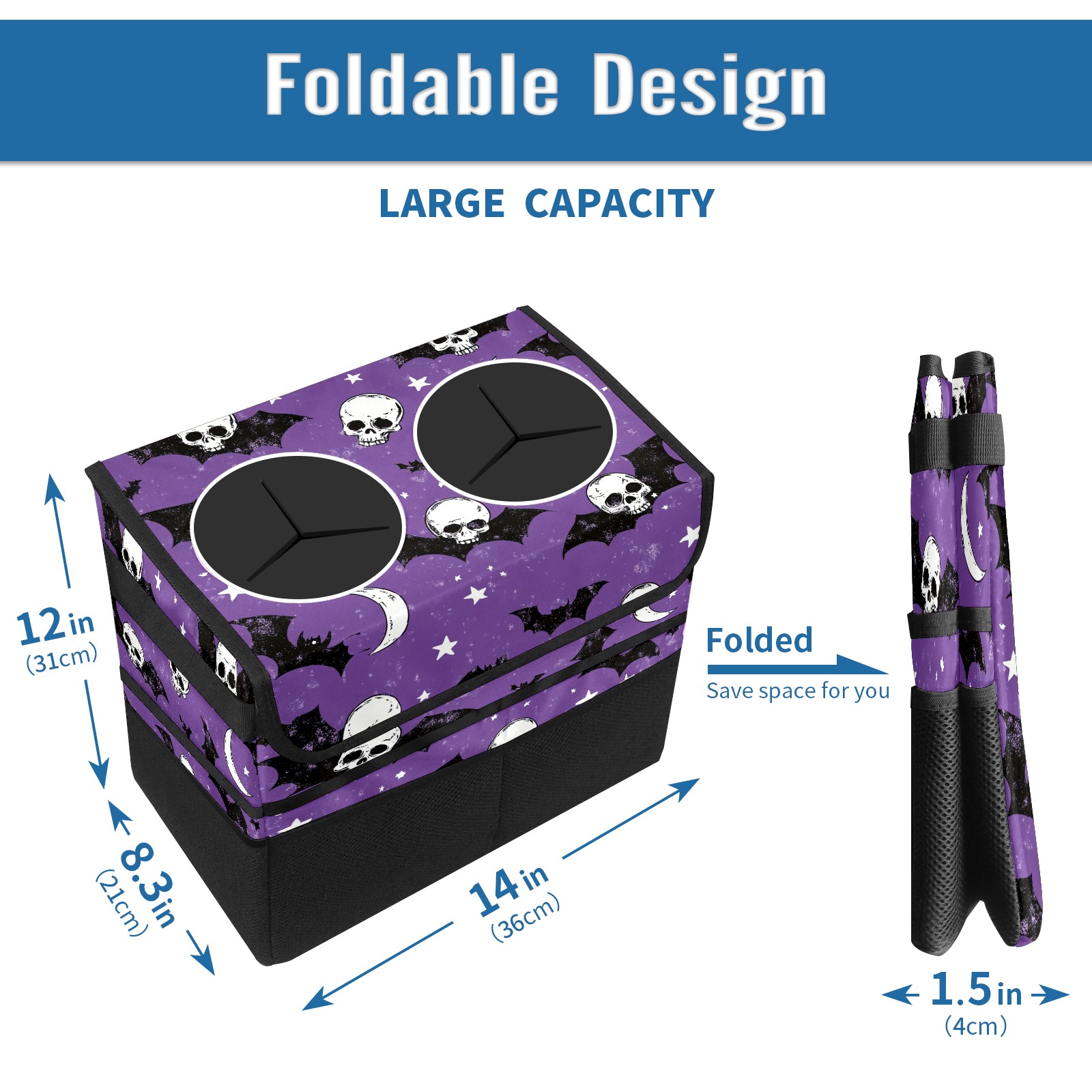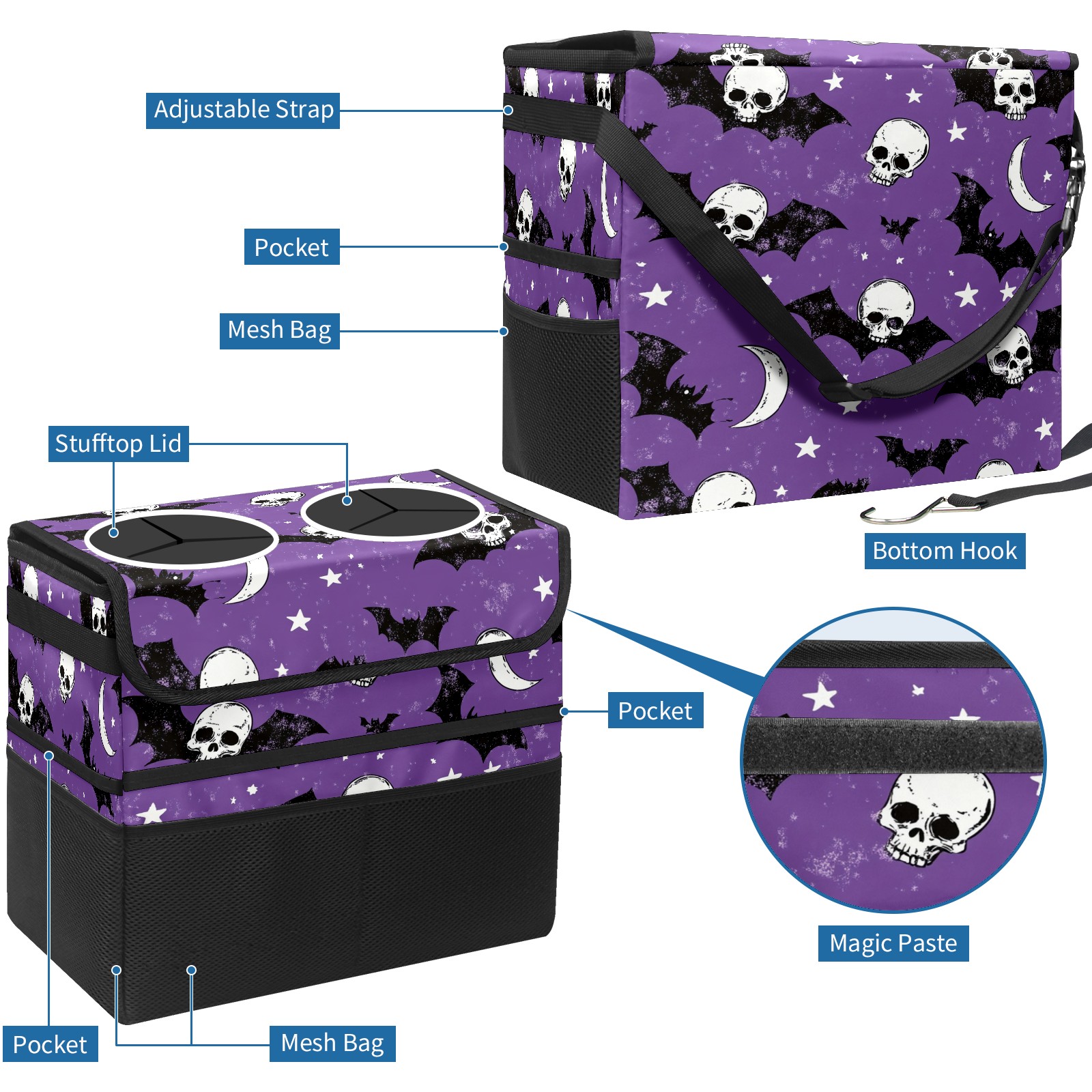 Car Trash Can with Lid, Portable Hanging Automotive Garbage Bin for Vehicles, Leakproof Waste Bag Container for SUV Truck Van Interior Auto Travel Road Trips(Bats And Skulls)