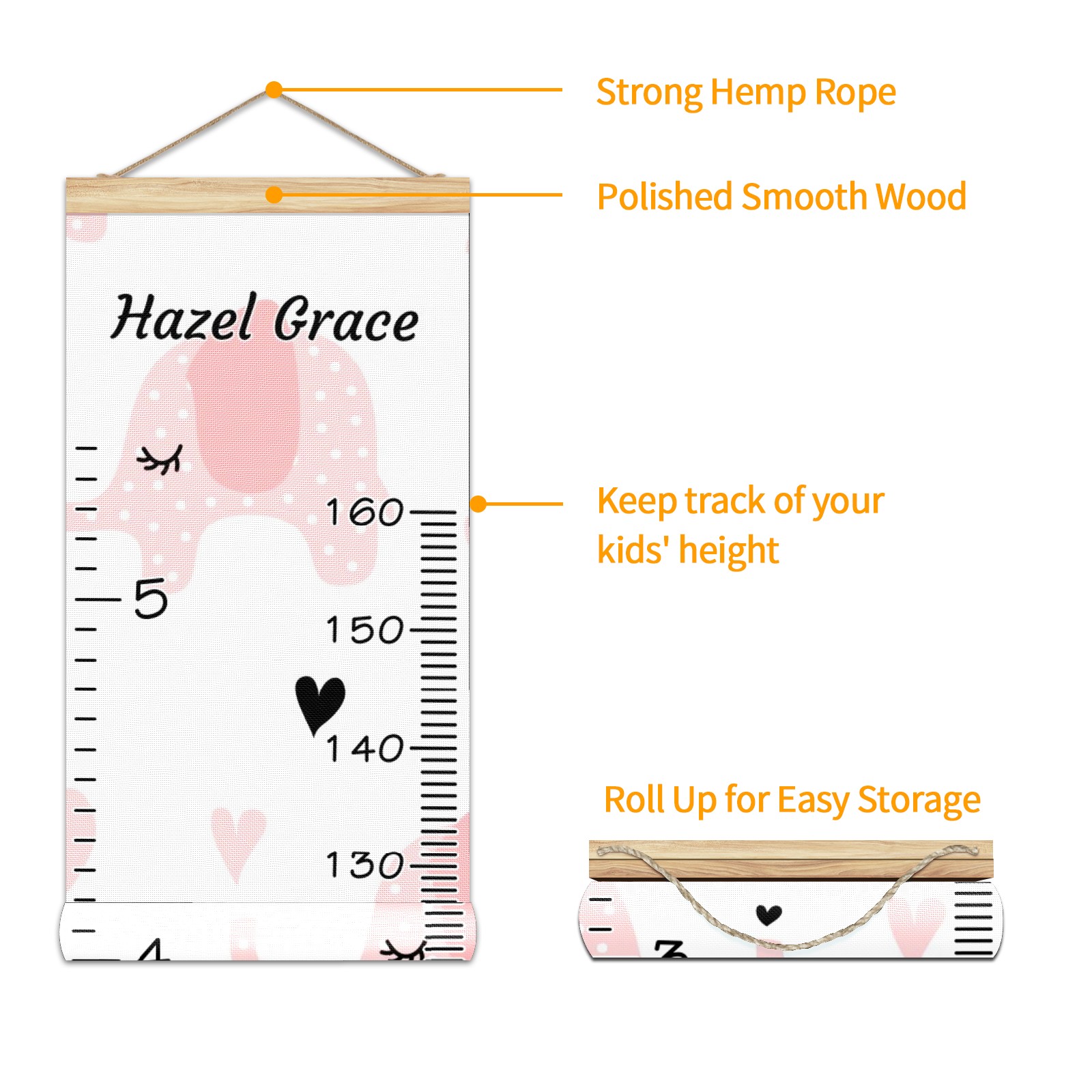Personalized Kids Name Growth Chart Ruler for Wall Wood Frame Canvas Height Measure Chart 13.4x56 in Hanging Growth Chart Pink Elephant10.23 Boys Girls Room Decor