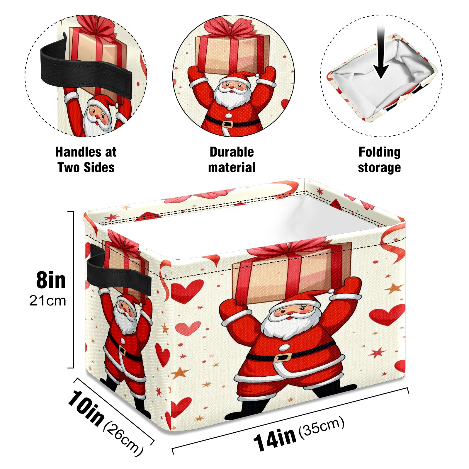 <p>This storage basket can be used for a variety of purposes, including bedroom organization baskets, laundry storage boxes, toy storage boxes, bathroom towel cube storage boxes, toilet storage containers, book and magazine storage boxes, holiday decoration storage cubes, living room storage, etc. The spacious size of 10×14×8 inches gives it ample storage capacity. This Christmas-themed storage basket is a great household item that combines practicality with a festive atmosphere! Made of easy-to-clean Oxford cloth, daily dirt can be cleaned by gently wiping with mild soapy water. With a sturdy metal frame and hard bottom support, it ensures a crisp shape when stored, but also needs to avoid machine washing to extend its service life. It is lightweight and flat after folding, taking up no space</p>