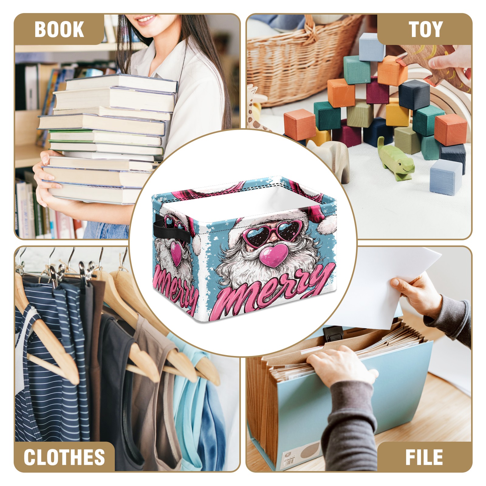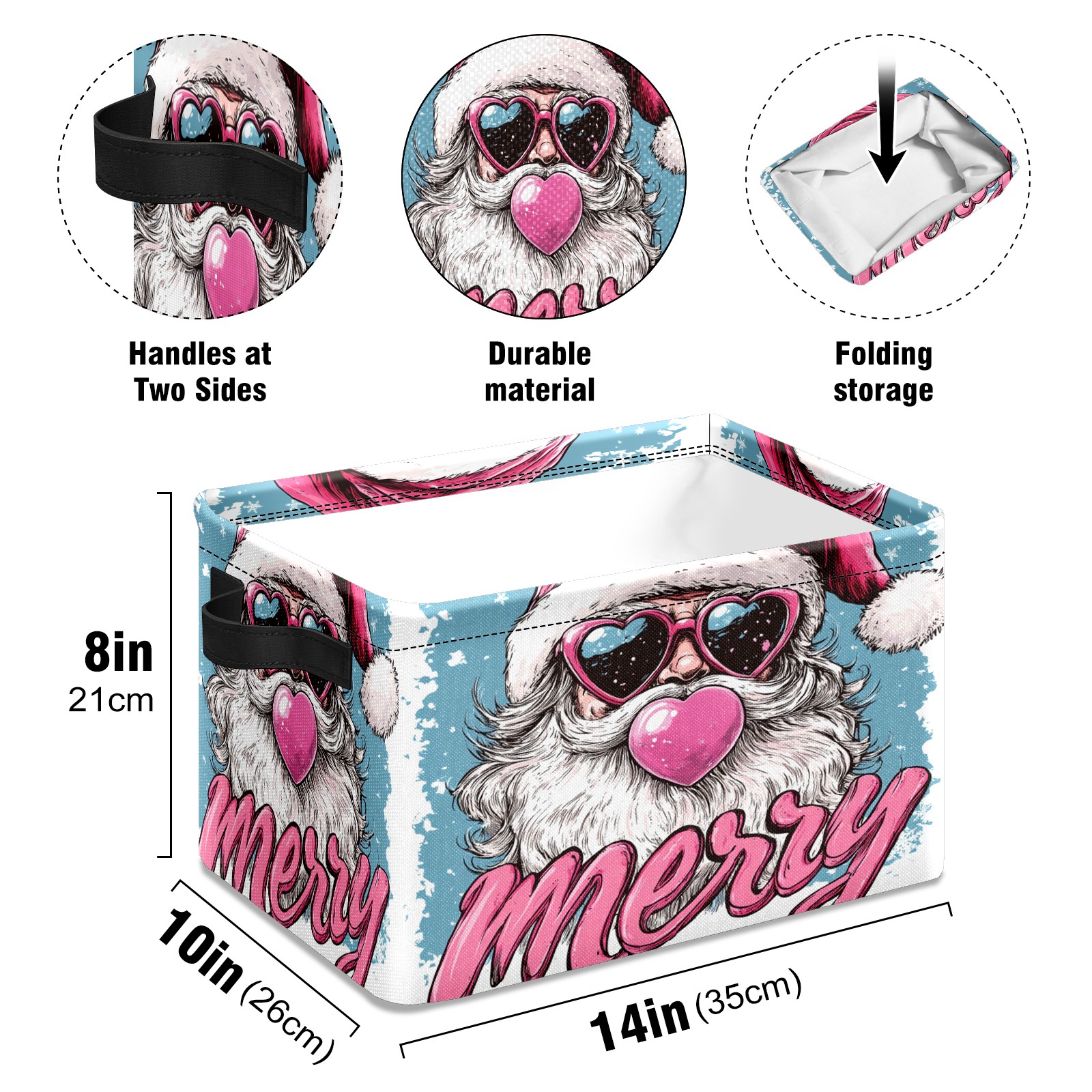 <p>This storage basket can be used for a variety of purposes, including bedroom organization baskets, laundry storage boxes, toy storage boxes, bathroom towel cube storage boxes, toilet storage containers, book and magazine storage boxes, holiday decoration storage cubes, living room storage, etc. The spacious size of 10×14×8 inches gives it ample storage capacity. This Christmas-themed storage basket is a great household item that combines practicality with a festive atmosphere! Made of easy-to-clean Oxford cloth, daily dirt can be cleaned by gently wiping with mild soapy water. With a sturdy metal frame and hard bottom support, it ensures a crisp shape when stored, but also needs to avoid machine washing to extend its service life. It is lightweight and flat after folding, taking up no space</p>