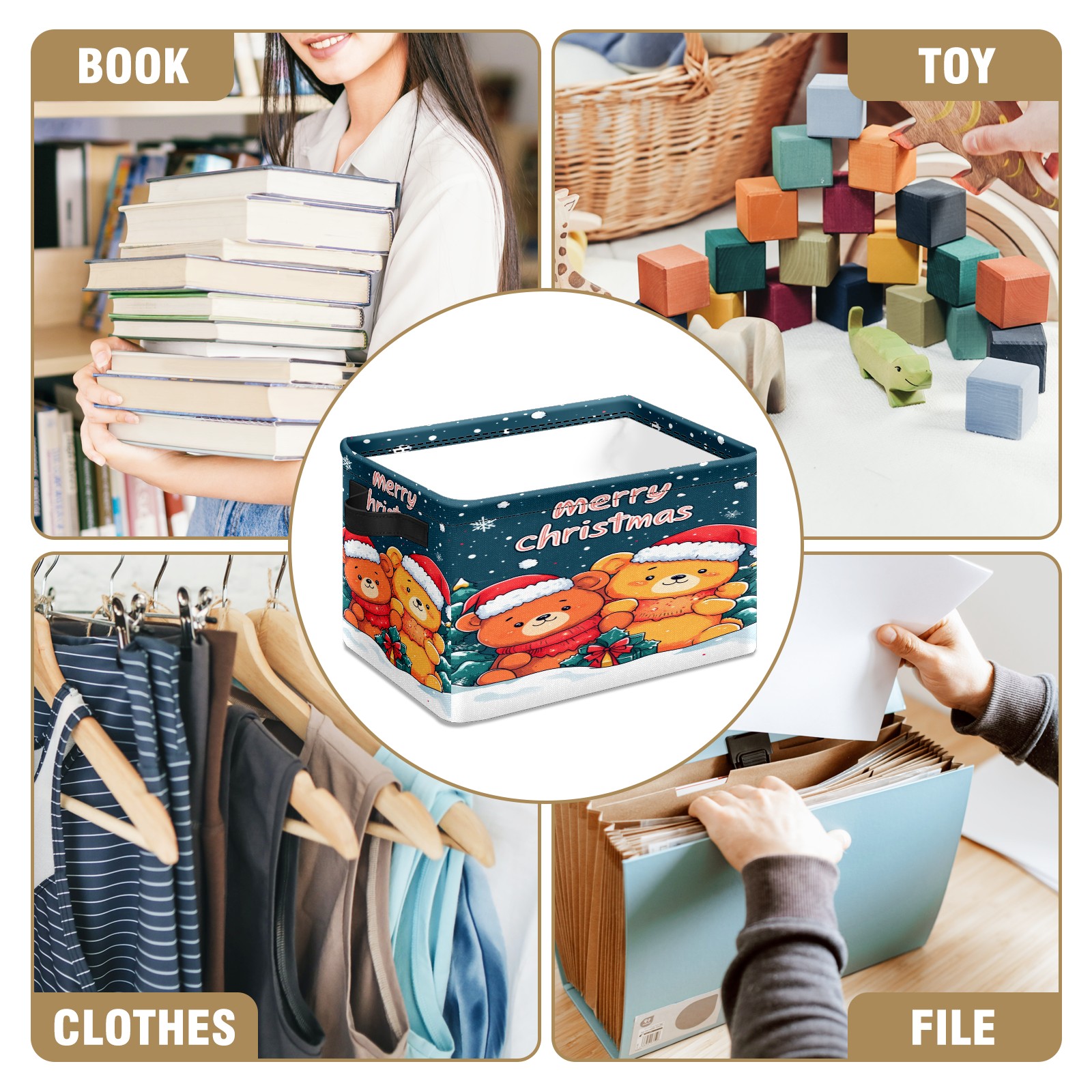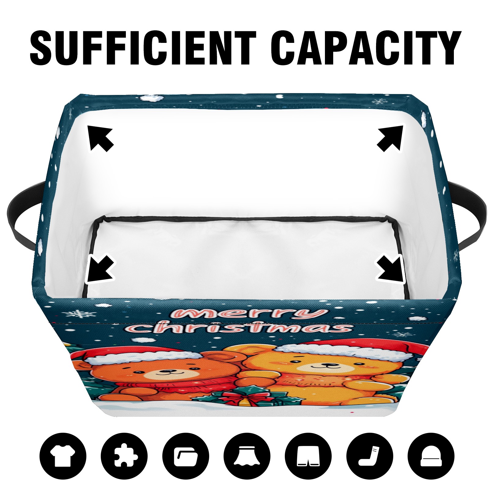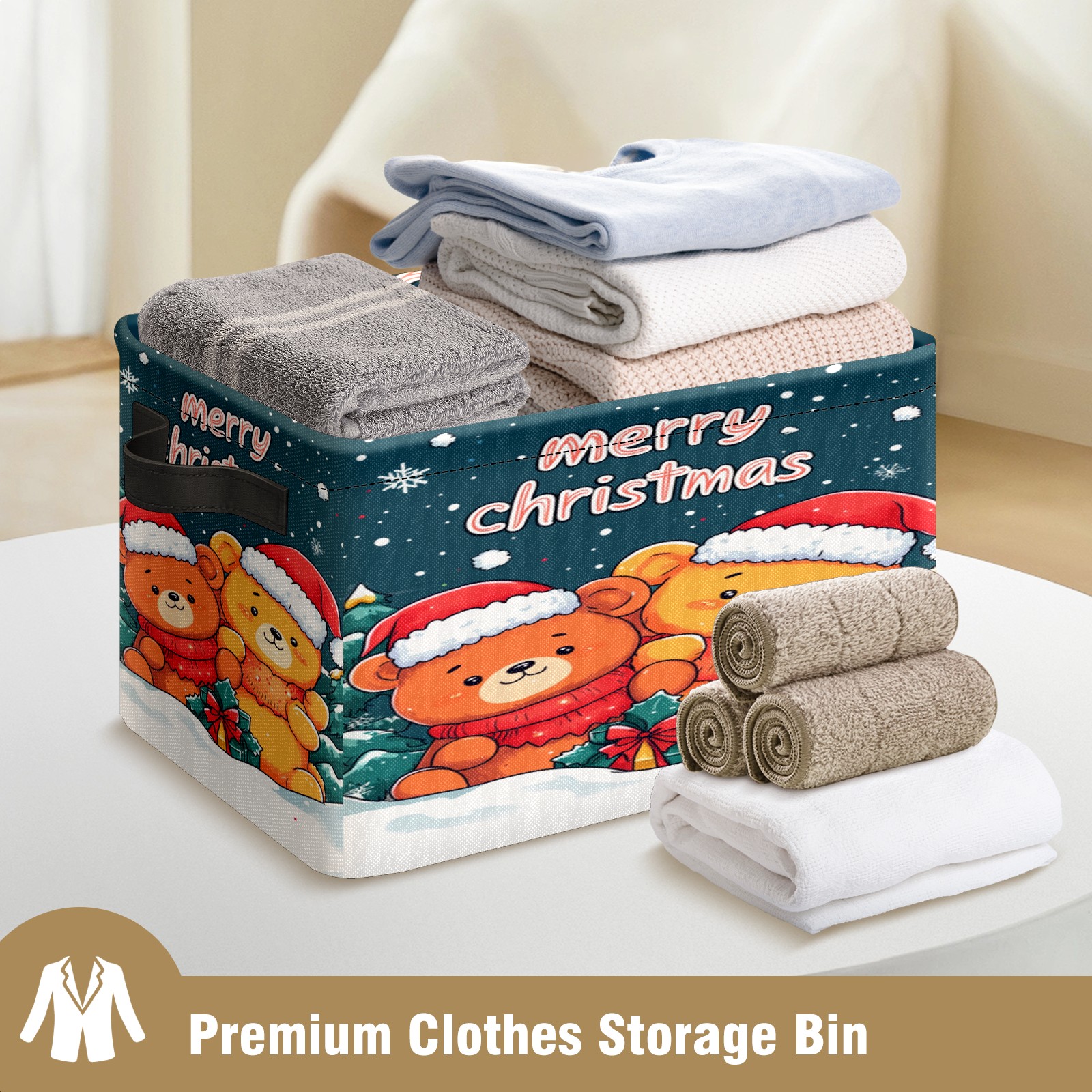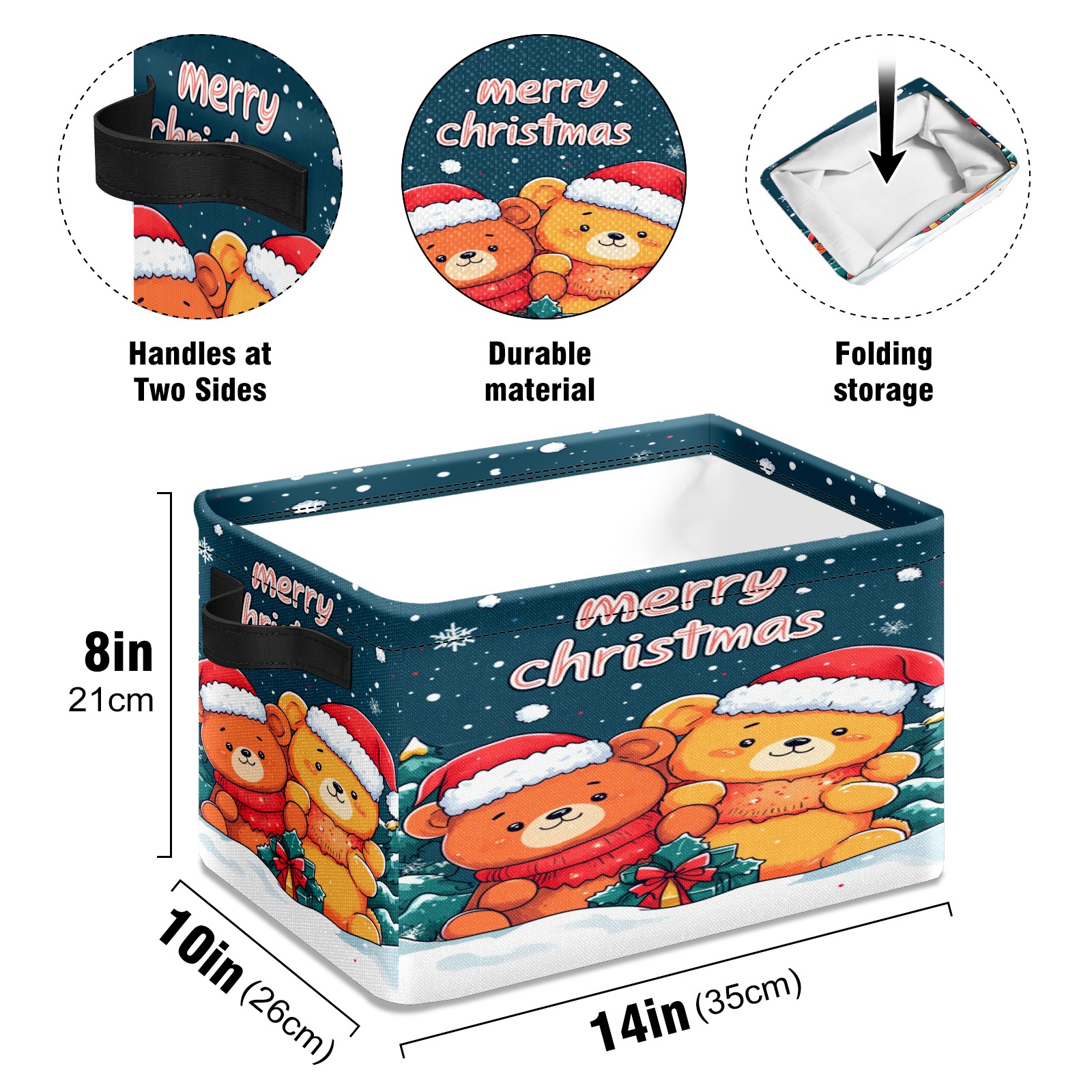 <p>This storage basket can be used for a variety of purposes, including bedroom organization baskets, laundry storage boxes, toy storage boxes, bathroom towel cube storage boxes, toilet storage containers, book and magazine storage boxes, holiday decoration storage cubes, living room storage, etc. The spacious size of 10×14×8 inches gives it ample storage capacity. This Christmas-themed storage basket is a great household item that combines practicality with a festive atmosphere! Made of easy-to-clean Oxford cloth, daily dirt can be cleaned by gently wiping with mild soapy water. With a sturdy metal frame and hard bottom support, it ensures a crisp shape when stored, but also needs to avoid machine washing to extend its service life. It is lightweight and flat after folding, taking up no space</p>