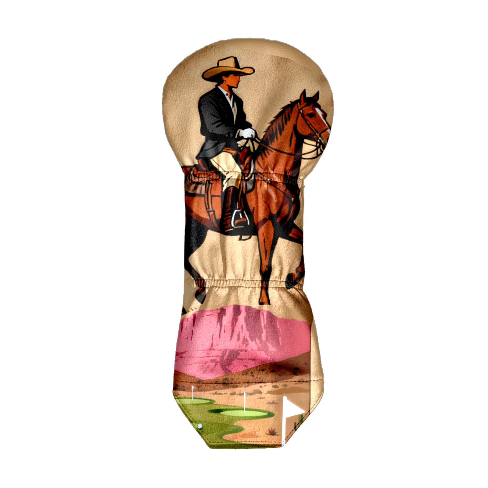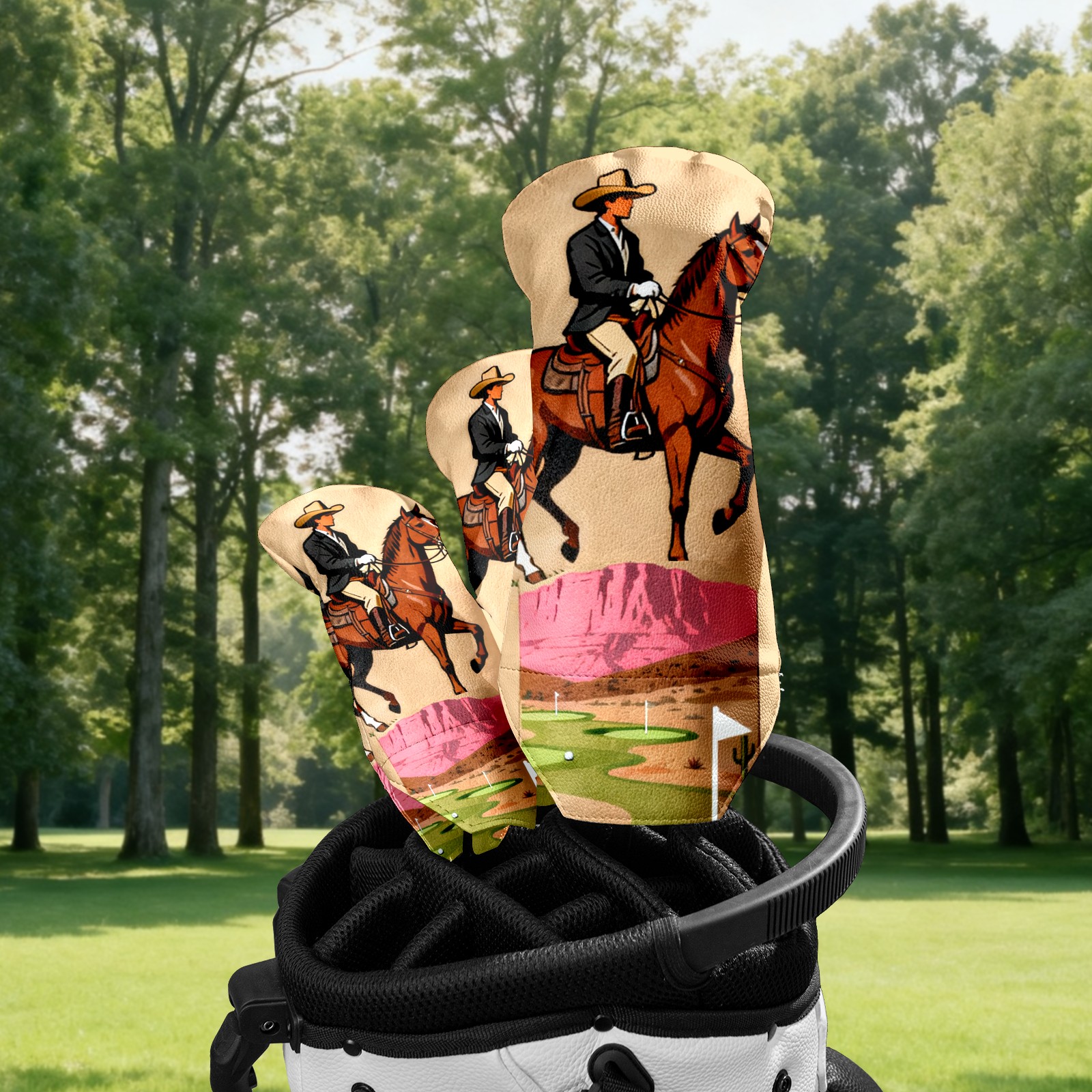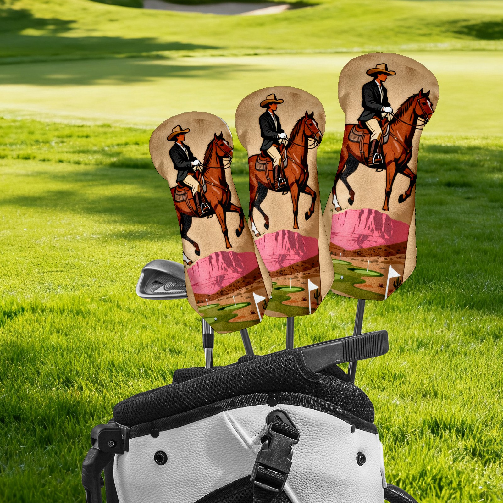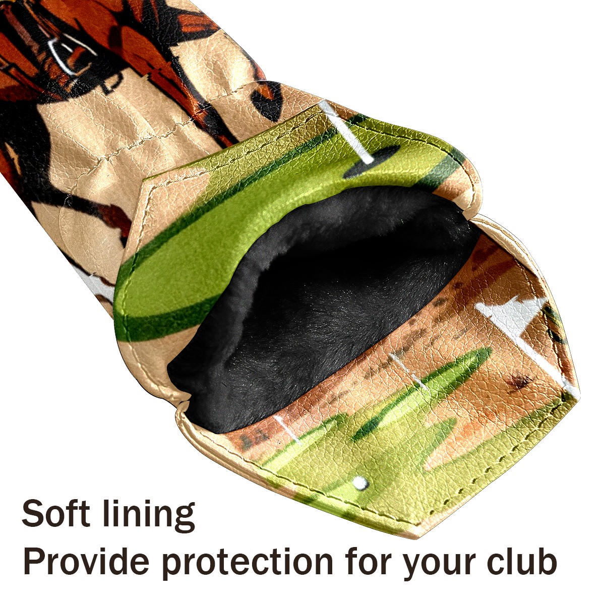 Jimeng-2025-10-20-8703-复古插画风格的高尔夫球杆套设计,主体是一个米色或浅棕色的高尔夫球杆套,表面印有精...