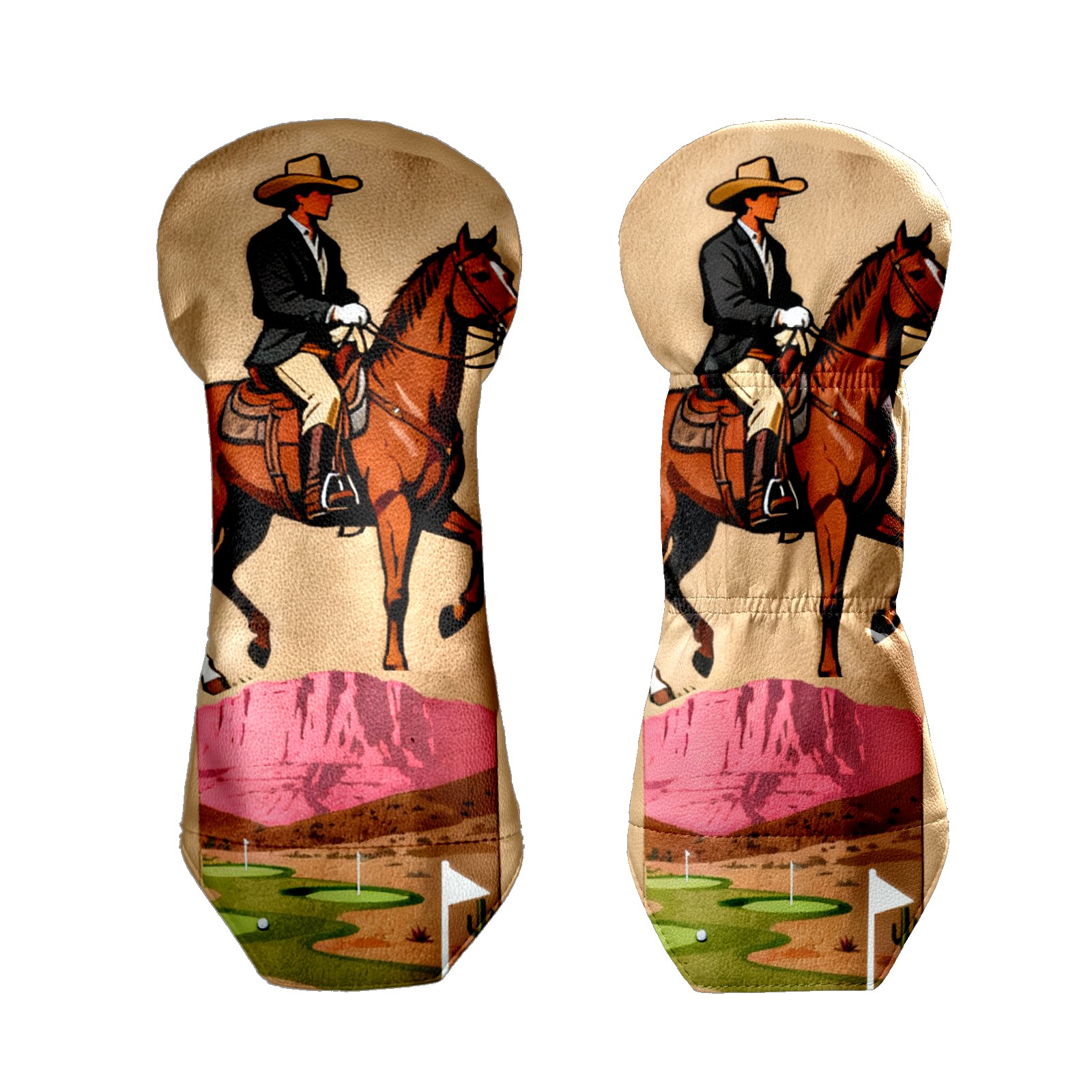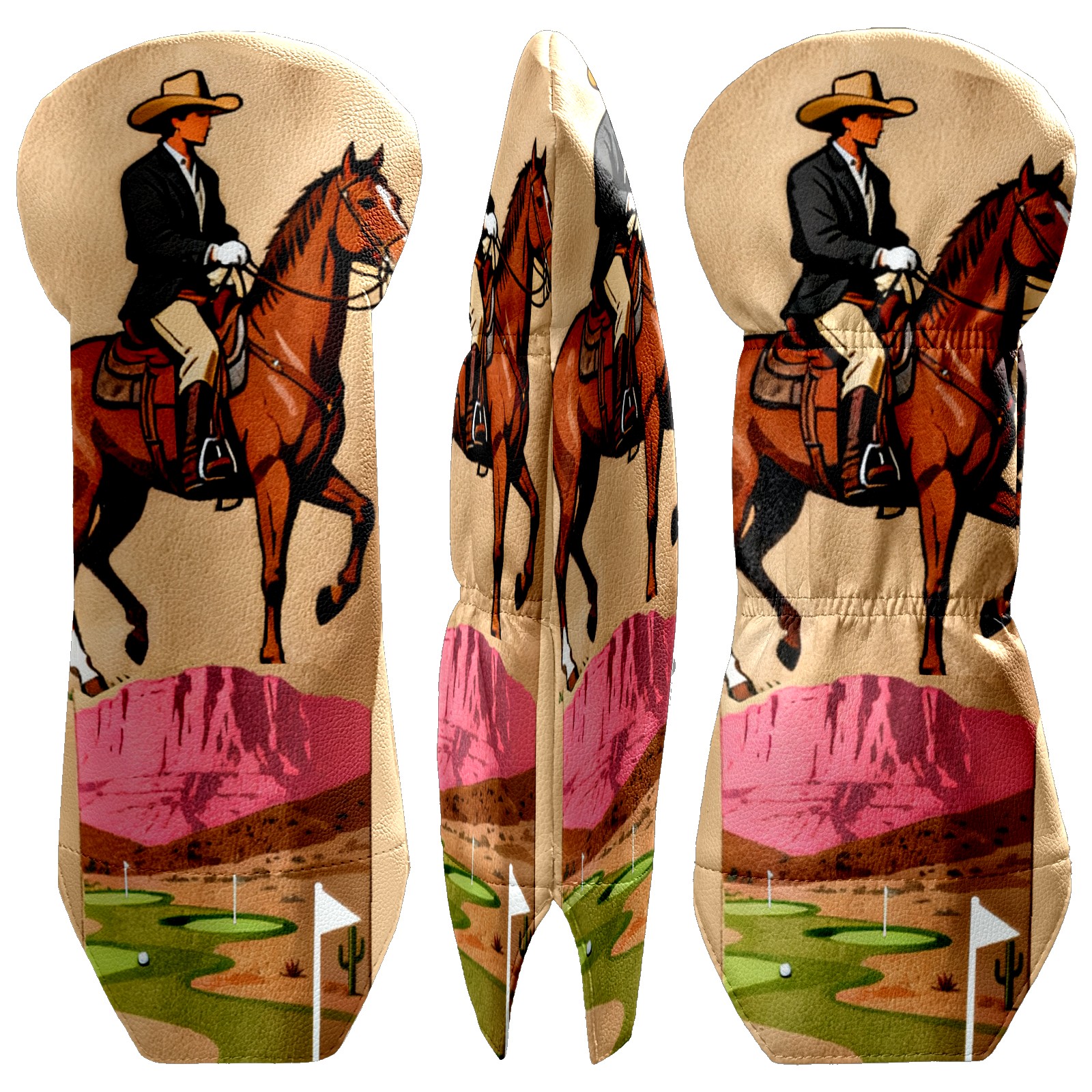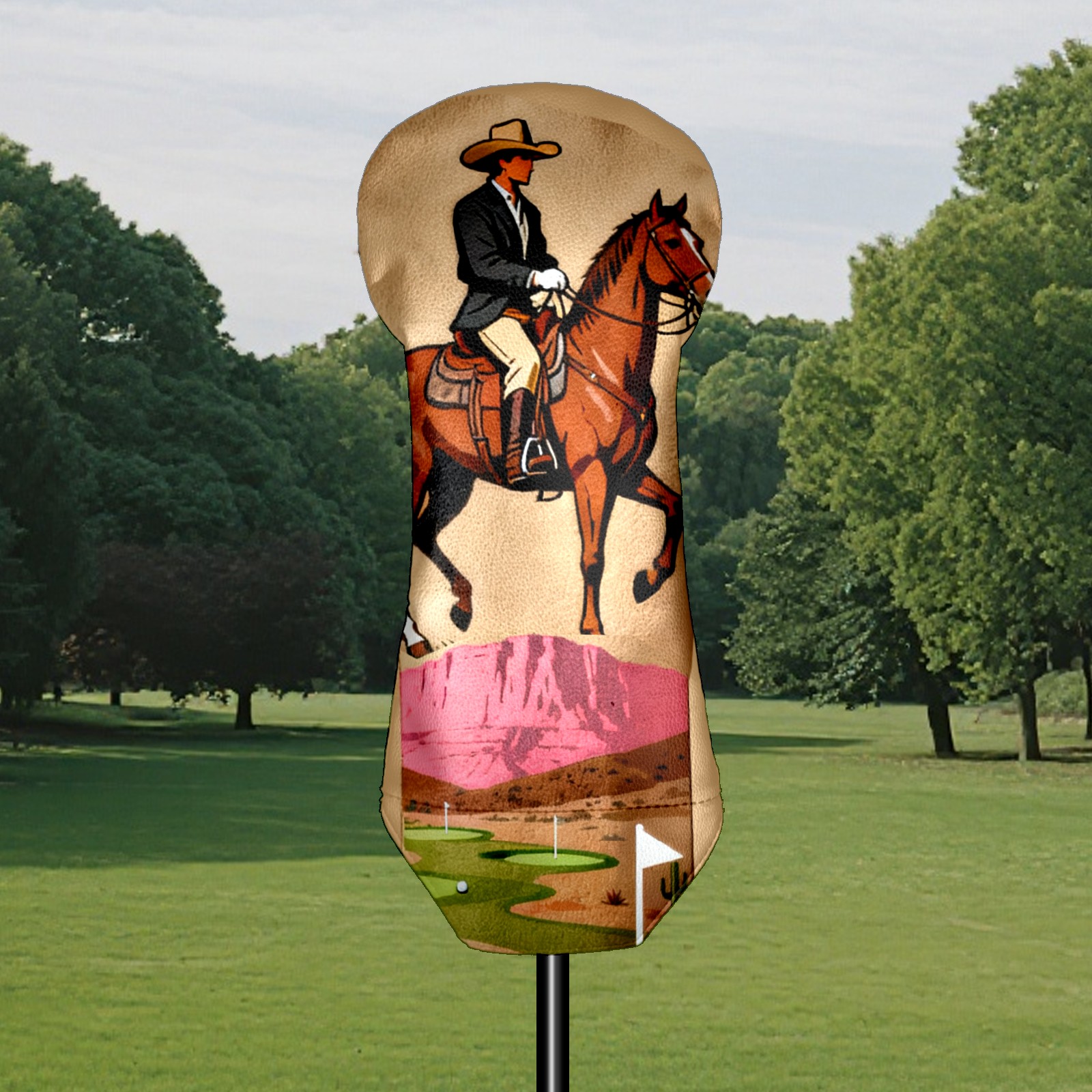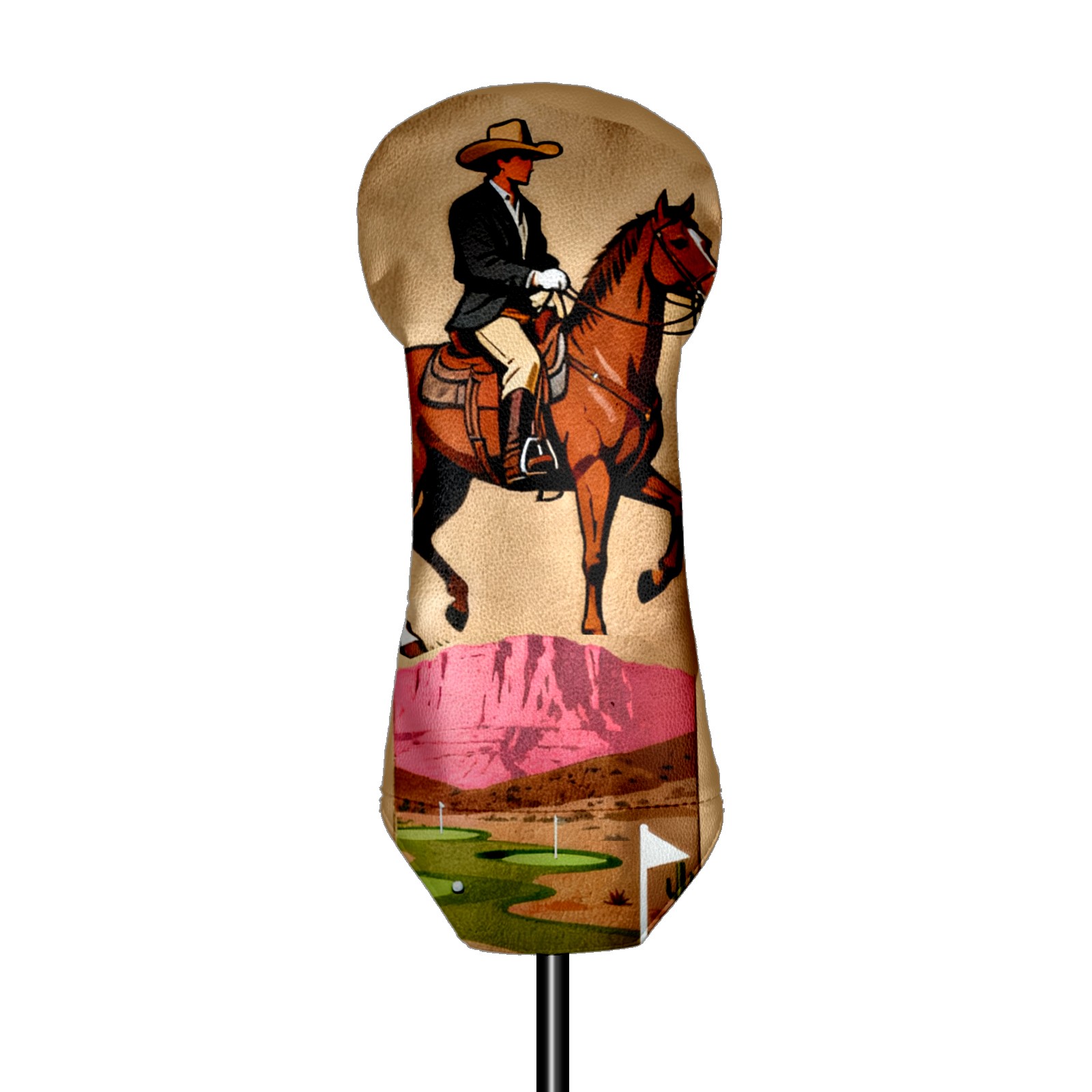 Jimeng-2025-10-20-8703-复古插画风格的高尔夫球杆套设计,主体是一个米色或浅棕色的高尔夫球杆套,表面印有精...
