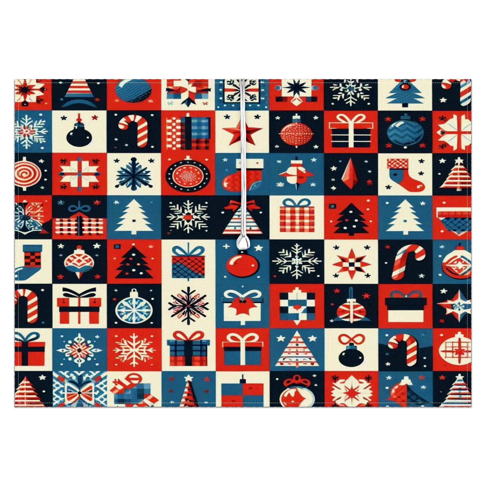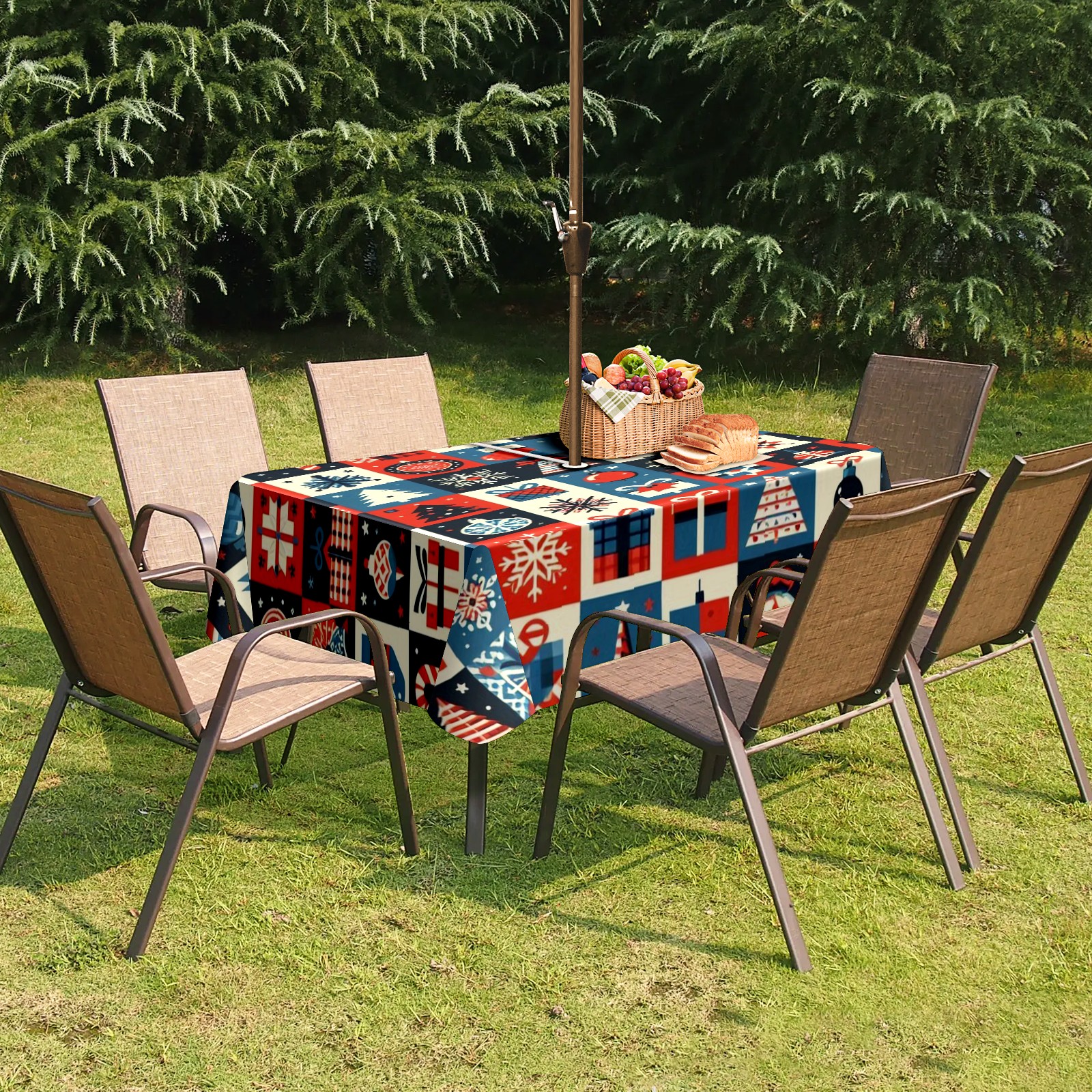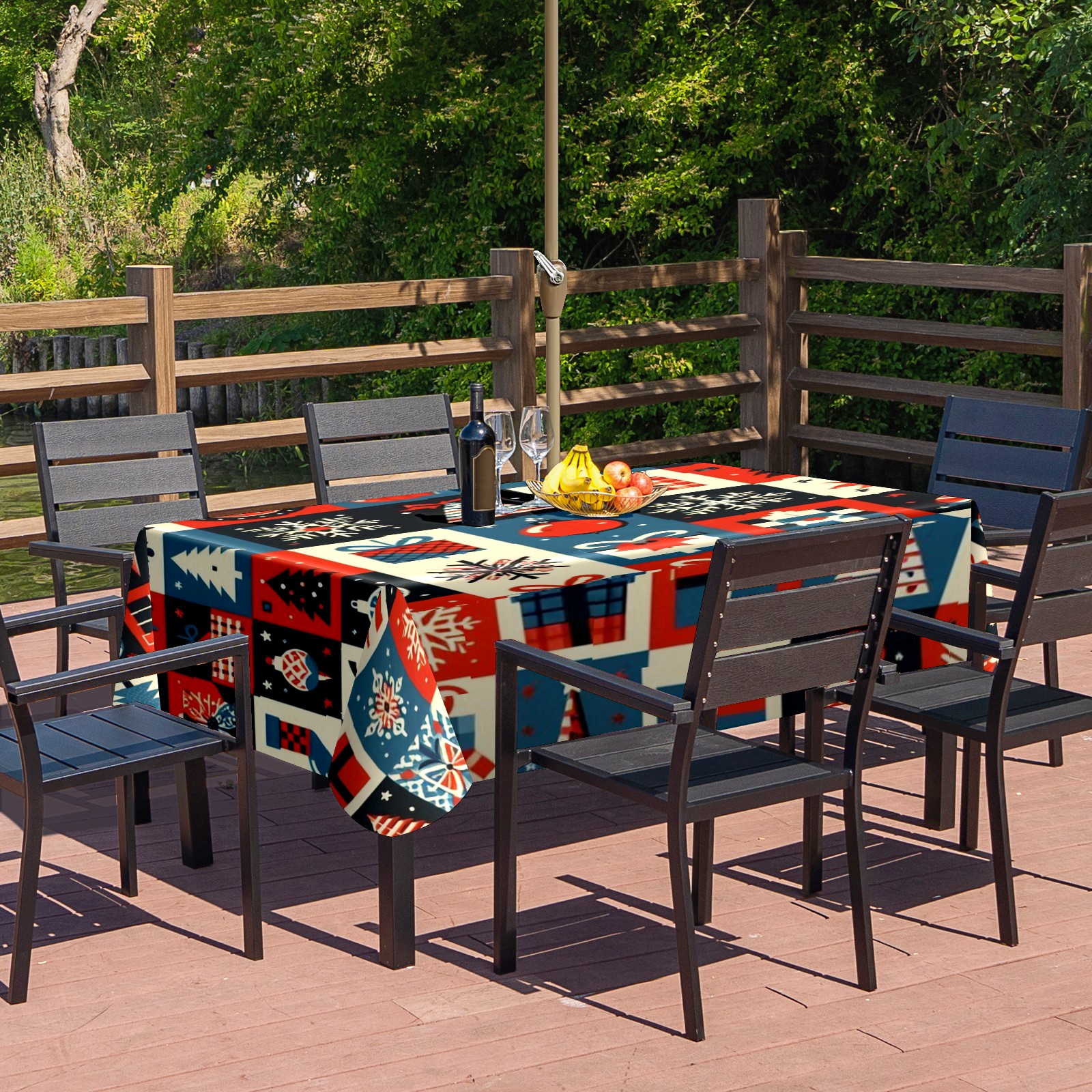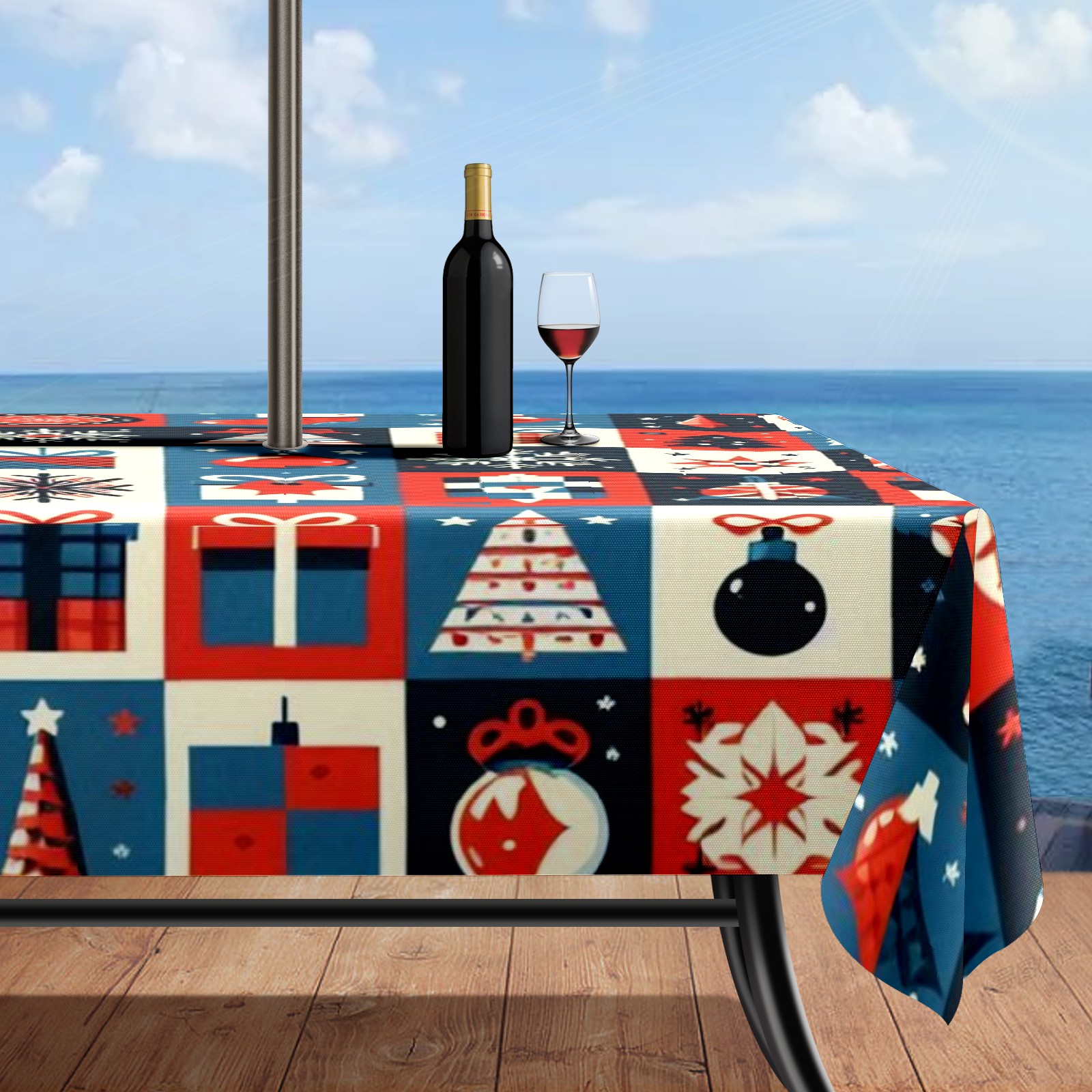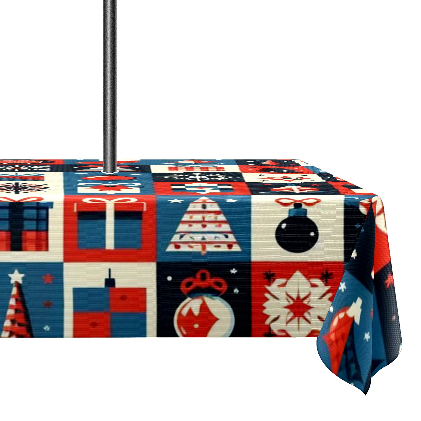 Square Umbrella Hole Tablecloth with Zipper, Red Blue Christmas Patterns Waterproof Outdoor Patio Table Cover for Rectangular Table, 52x70 Inch, Fits 6-8 Seater, Easy Setup Without Removing Umbrella