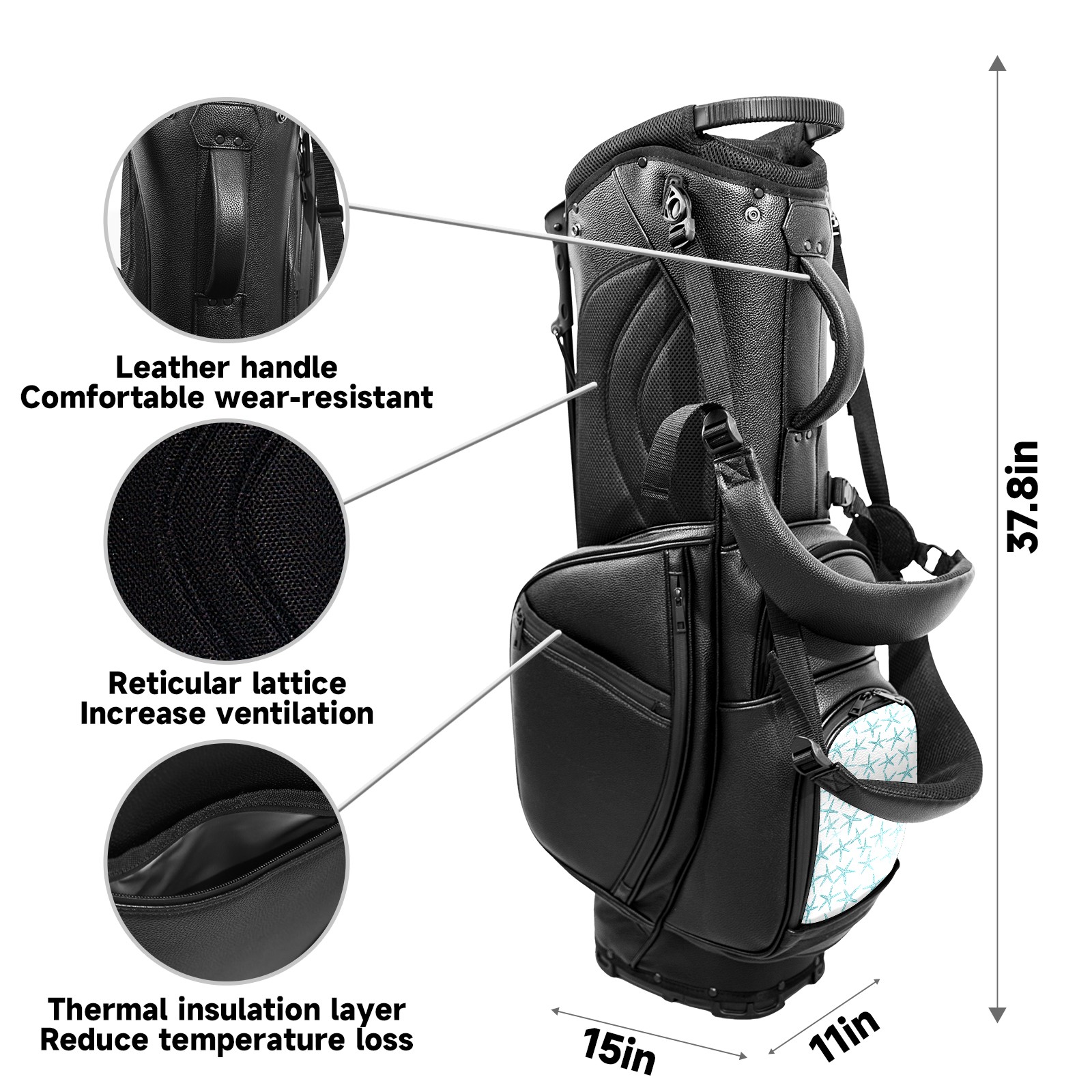 <p>This golf bag combines versatility, durability, and quality, providing comprehensive protection and easy access for your golf clubs. Its precise dimensions of 130 x 37 x 31 cm (with rain cover) and 90 x 31 x 37 cm (without rain cover) strike the perfect balance between portability and storage capacity.The five-way head frame (with five-way top compartments) allows for strategic compartmentalization, allowing you to neatly organize your various clubs and separate them to protect them from bumps, scratches, and scuffs. Its versatile compartmental design features a spacious five-compartment structure, including a separate, full-size club compartment, to fully accommodate your clubs while protecting their integrity.This bag features a versatile storage system with multiple waterproof zippered pockets for securely storing golf accessories, as well as a dedicated insulated cooler pocket with excellent insulation to keep your drinks cold. The built-in rain cover effectively repels moisture, ensuring your clubs remain dry and protected even in wet weather. For enhanced carrying comfort, this bag features ergonomically designed, padded, breathable, adjustable shoulder straps and an adjustable chest strap to distribute shoulder pressure for easier and more comfortable carrying. A portable rear handle makes lifting and carrying easier.Quality is evident in every detail: double-stitched reinforced edges enhance structural stability, smooth and durable zippers ensure long-lasting reliability, and wear-resistant bottom rivets ensure secure placement on all terrains, effectively preventing wear and tear. Crafted from classic pebbled matte PU fabric, it perfectly complements both business and casual occasions. Available in black and white, it exudes understated elegance and sophistication.This golf bag, with its sturdy plastic base, combines premium quality and durability, making it the ideal companion for every golfer, whether heading to the course for a casual round or attending a business golf event.</p>