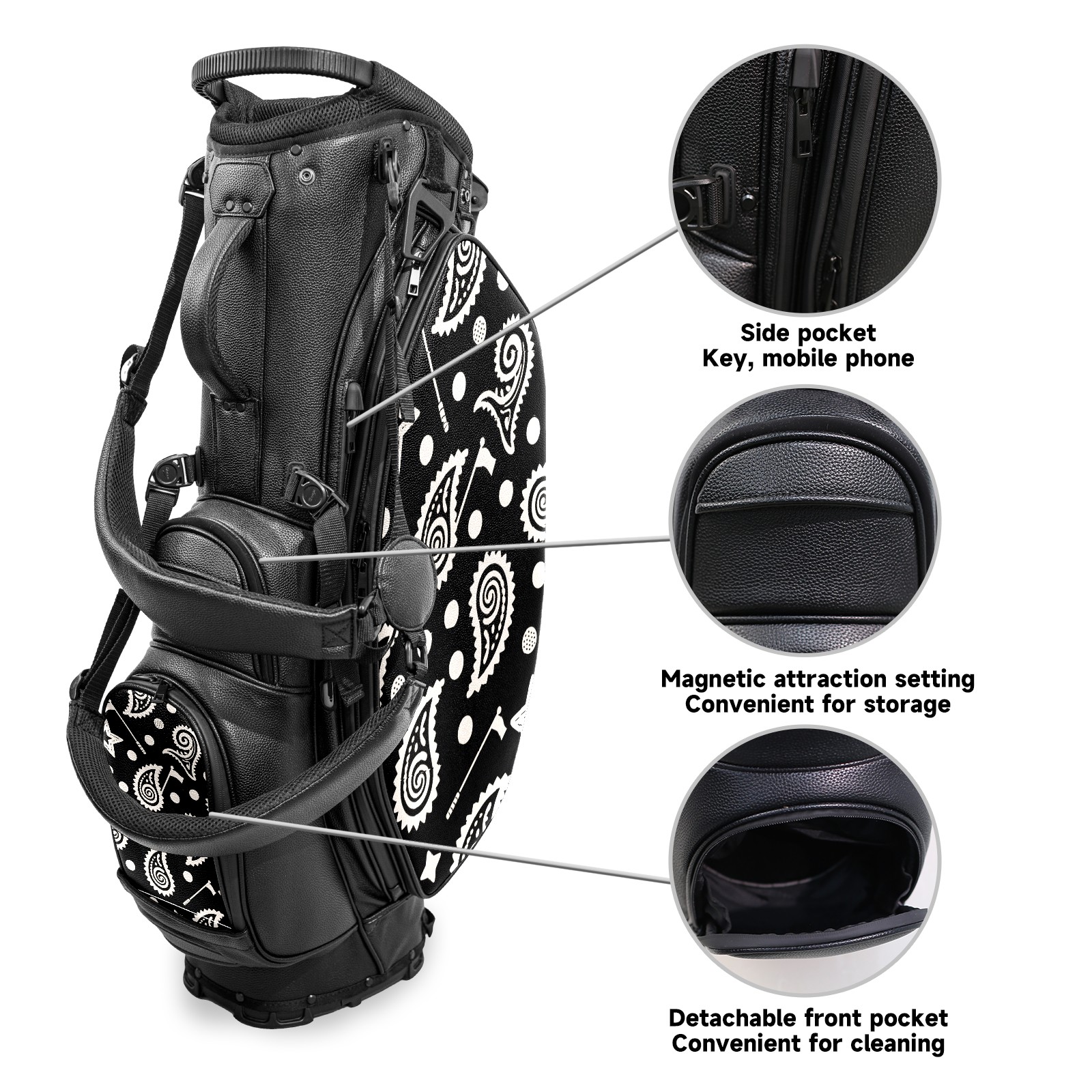• <p>This golf bag combines versatility, durability, and quality, providing comprehensive protection and easy access for your golf clubs. Its precise dimensions of 130 x 37 x 31 cm (with rain cover) and 90 x 31 x 37 cm (without rain cover) strike the perfect balance between portability and storage capacity.The five-way head frame (with five-way top compartments) allows for strategic compartmentalization, allowing you to neatly organize your various clubs and separate them to protect them from bumps, scratches, and scuffs. Its versatile compartmental design features a spacious five-compartment structure, including a separate, full-size club compartment, to fully accommodate your clubs while protecting their integrity.This bag features a versatile storage system with multiple waterproof zippered pockets for securely storing golf accessories, as well as a dedicated insulated cooler pocket with excellent insulation to keep your drinks cold. The built-in rain cover effectively repels moisture, ensuring your clubs remain dry and protected even in wet weather. For enhanced carrying comfort, this bag features ergonomically designed, padded, breathable, adjustable shoulder straps and an adjustable chest strap to distribute shoulder pressure for easier and more comfortable carrying. A portable rear handle makes lifting and carrying easier.Quality is evident in every detail: double-stitched reinforced edges enhance structural stability, smooth and durable zippers ensure long-lasting reliability, and wear-resistant bottom rivets ensure secure placement on all terrains, effectively preventing wear and tear. Crafted from classic pebbled matte PU fabric, it perfectly complements both business and casual occasions. Available in black and white, it exudes understated elegance and sophistication.This golf bag, with its sturdy plastic base, combines premium quality and durability, making it the ideal companion for every golfer, whether heading to the course for a casual round or attending a business golf event.</p>