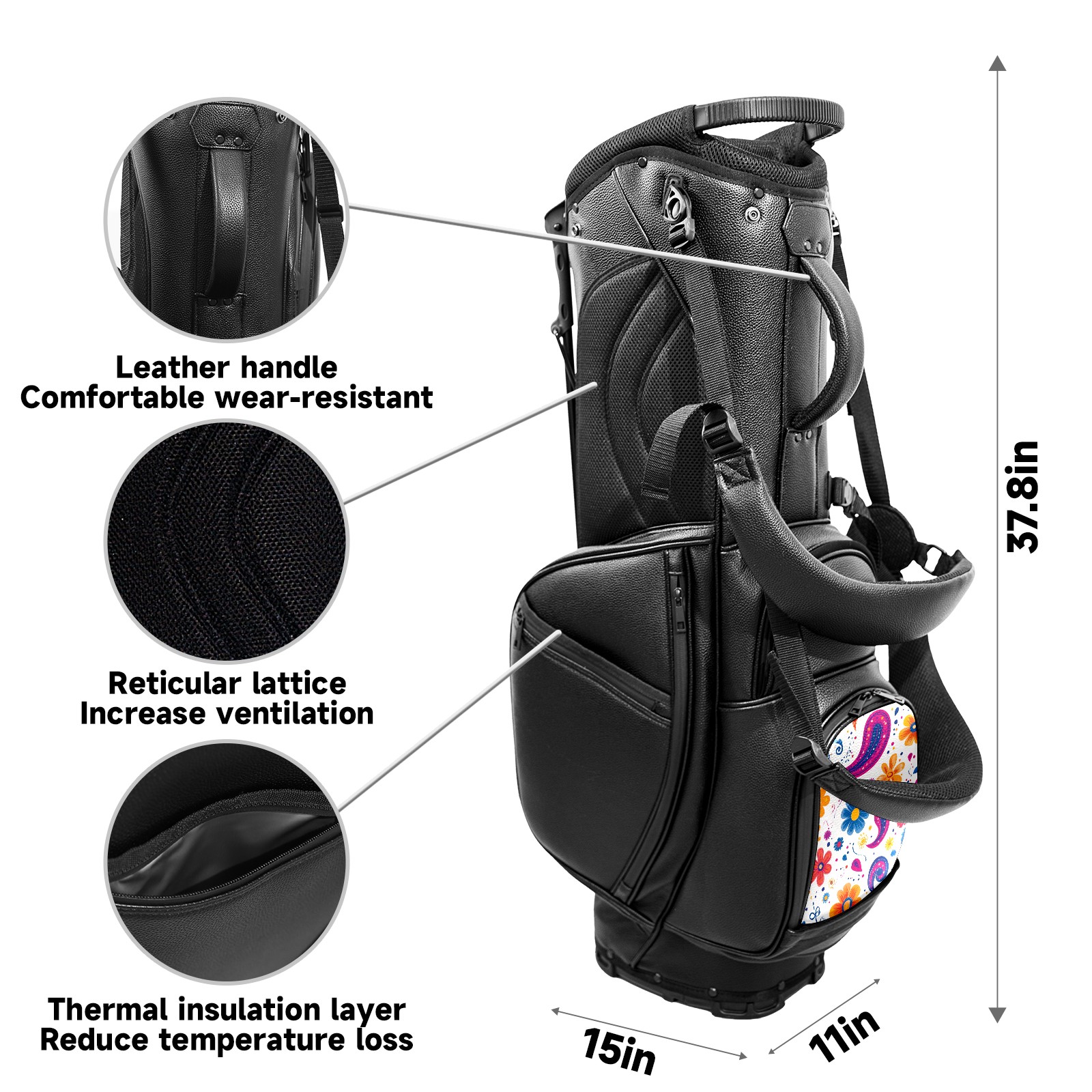 • <p>This golf bag combines versatility, durability, and quality, providing comprehensive protection and easy access for your golf clubs. Its precise dimensions of 130 x 37 x 31 cm (with rain cover) and 90 x 31 x 37 cm (without rain cover) strike the perfect balance between portability and storage capacity.The five-way head frame (with five-way top compartments) allows for strategic compartmentalization, allowing you to neatly organize your various clubs and separate them to protect them from bumps, scratches, and scuffs. Its versatile compartmental design features a spacious five-compartment structure, including a separate, full-size club compartment, to fully accommodate your clubs while protecting their integrity.This bag features a versatile storage system with multiple waterproof zippered pockets for securely storing golf accessories, as well as a dedicated insulated cooler pocket with excellent insulation to keep your drinks cold. The built-in rain cover effectively repels moisture, ensuring your clubs remain dry and protected even in wet weather. For enhanced carrying comfort, this bag features ergonomically designed, padded, breathable, adjustable shoulder straps and an adjustable chest strap to distribute shoulder pressure for easier and more comfortable carrying. A portable rear handle makes lifting and carrying easier.Quality is evident in every detail: double-stitched reinforced edges enhance structural stability, smooth and durable zippers ensure long-lasting reliability, and wear-resistant bottom rivets ensure secure placement on all terrains, effectively preventing wear and tear. Crafted from classic pebbled matte PU fabric, it perfectly complements both business and casual occasions. Available in black and white, it exudes understated elegance and sophistication.This golf bag, with its sturdy plastic base, combines premium quality and durability, making it the ideal companion for every golfer, whether heading to the course for a casual round or attending a business golf event.</p>