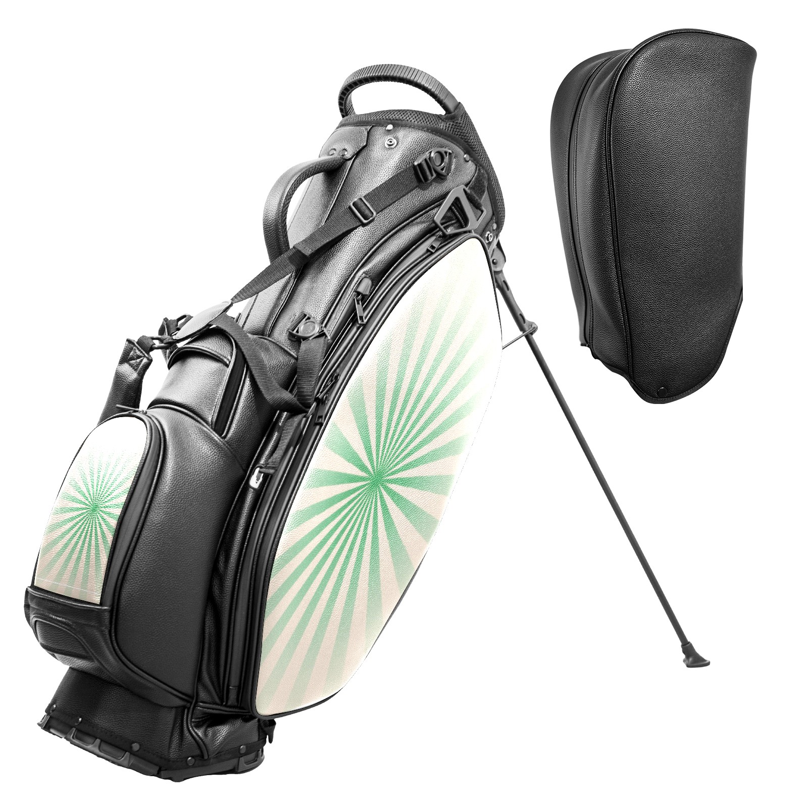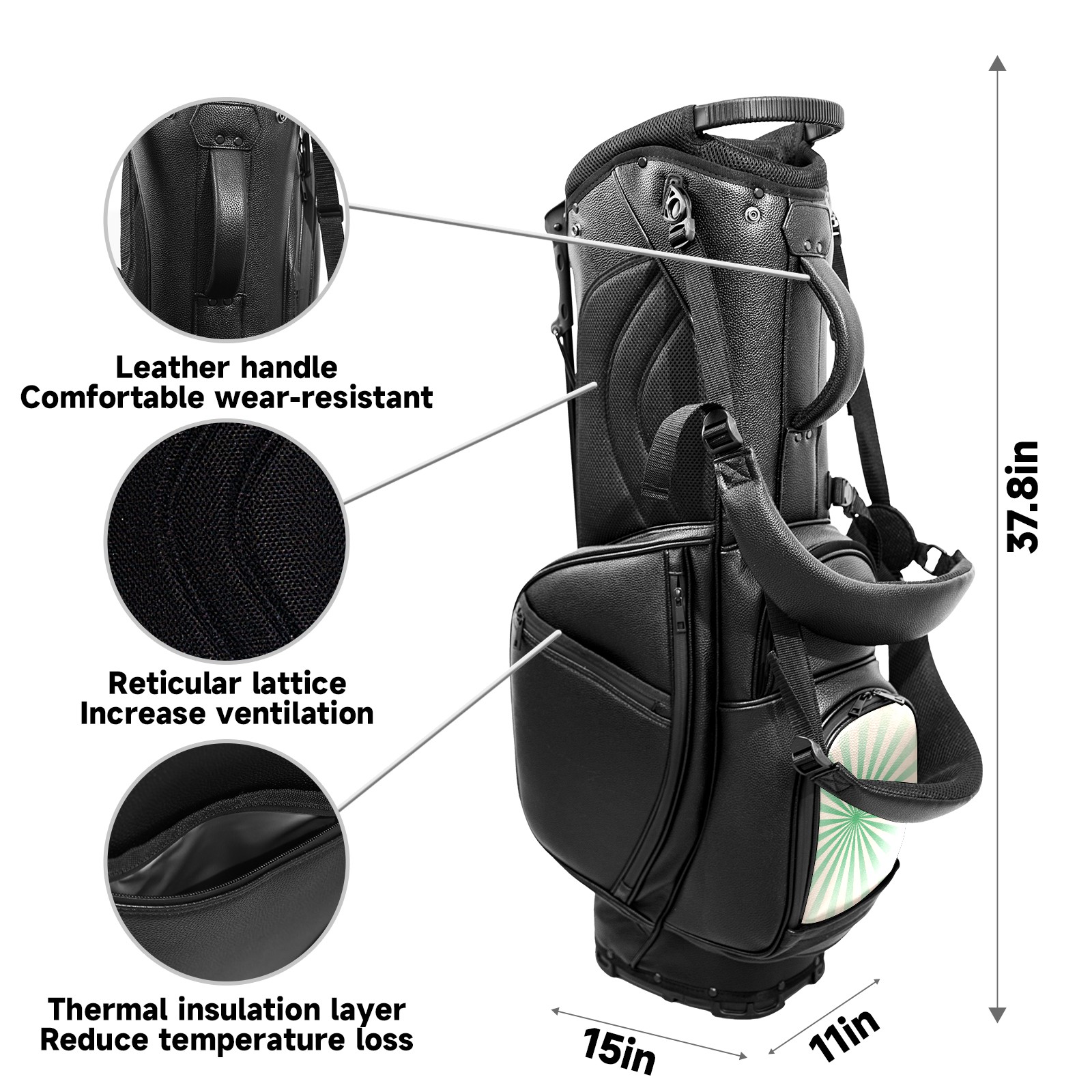• <p>This golf bag combines versatility, durability, and quality, providing comprehensive protection and easy access for your golf clubs. Its precise dimensions of 130 x 37 x 31 cm (with rain cover) and 90 x 31 x 37 cm (without rain cover) strike the perfect balance between portability and storage capacity.The five-way head frame (with five-way top compartments) allows for strategic compartmentalization, allowing you to neatly organize your various clubs and separate them to protect them from bumps, scratches, and scuffs. Its versatile compartmental design features a spacious five-compartment structure, including a separate, full-size club compartment, to fully accommodate your clubs while protecting their integrity.This bag features a versatile storage system with multiple waterproof zippered pockets for securely storing golf accessories, as well as a dedicated insulated cooler pocket with excellent insulation to keep your drinks cold. The built-in rain cover effectively repels moisture, ensuring your clubs remain dry and protected even in wet weather. For enhanced carrying comfort, this bag features ergonomically designed, padded, breathable, adjustable shoulder straps and an adjustable chest strap to distribute shoulder pressure for easier and more comfortable carrying. A portable rear handle makes lifting and carrying easier.Quality is evident in every detail: double-stitched reinforced edges enhance structural stability, smooth and durable zippers ensure long-lasting reliability, and wear-resistant bottom rivets ensure secure placement on all terrains, effectively preventing wear and tear. Crafted from classic pebbled matte PU fabric, it perfectly complements both business and casual occasions. Available in black and white, it exudes understated elegance and sophistication.This golf bag, with its sturdy plastic base, combines premium quality and durability, making it the ideal companion for every golfer, whether heading to the course for a casual round or attending a business golf event.</p>