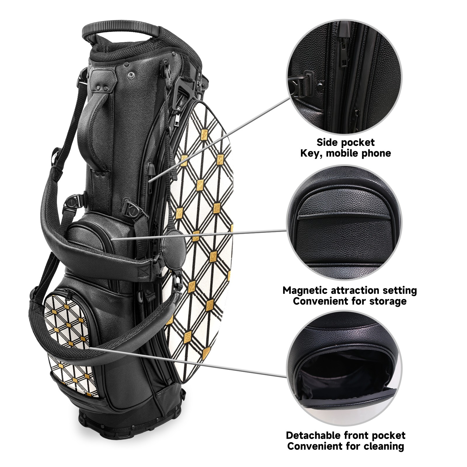 <p>This golf bag combines versatility, durability, and quality, providing comprehensive protection and easy access for your golf clubs. Its precise dimensions of 130 x 37 x 31 cm (with rain cover) and 90 x 31 x 37 cm (without rain cover) strike the perfect balance between portability and storage capacity.The five-way head frame (with five-way top compartments) allows for strategic compartmentalization, allowing you to neatly organize your various clubs and separate them to protect them from bumps, scratches, and scuffs. Its versatile compartmental design features a spacious five-compartment structure, including a separate, full-size club compartment, to fully accommodate your clubs while protecting their integrity.This bag features a versatile storage system with multiple waterproof zippered pockets for securely storing golf accessories, as well as a dedicated insulated cooler pocket with excellent insulation to keep your drinks cold. The built-in rain cover effectively repels moisture, ensuring your clubs remain dry and protected even in wet weather. For enhanced carrying comfort, this bag features ergonomically designed, padded, breathable, adjustable shoulder straps and an adjustable chest strap to distribute shoulder pressure for easier and more comfortable carrying. A portable rear handle makes lifting and carrying easier.Quality is evident in every detail: double-stitched reinforced edges enhance structural stability, smooth and durable zippers ensure long-lasting reliability, and wear-resistant bottom rivets ensure secure placement on all terrains, effectively preventing wear and tear. Crafted from classic pebbled matte PU fabric, it perfectly complements both business and casual occasions. Available in black and white, it exudes understated elegance and sophistication.This golf bag, with its sturdy plastic base, combines premium quality and durability, making it the ideal companion for every golfer, whether heading to the course for a casual round or attending a business golf event.</p>