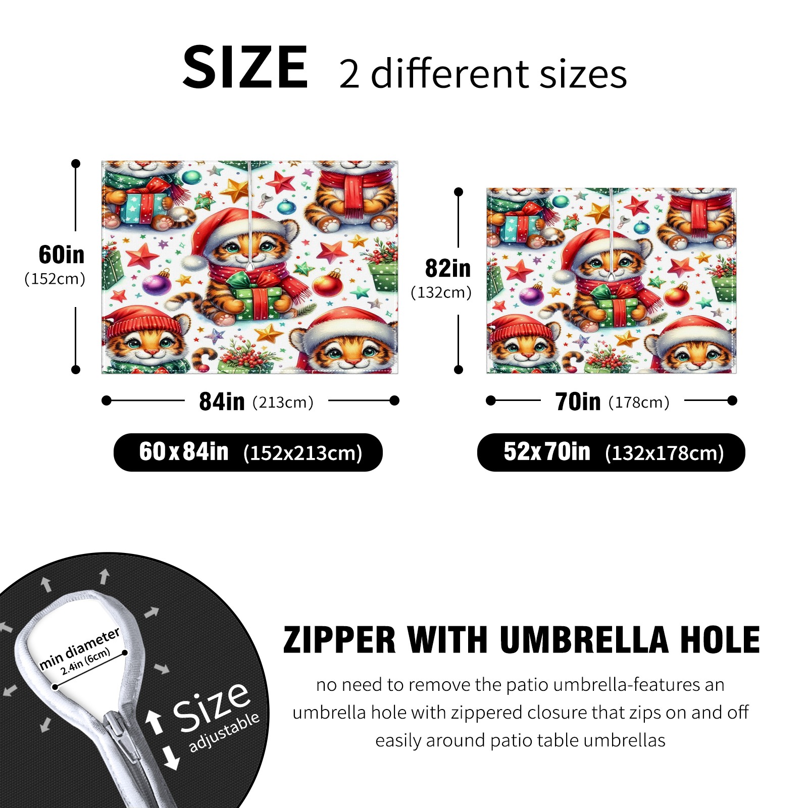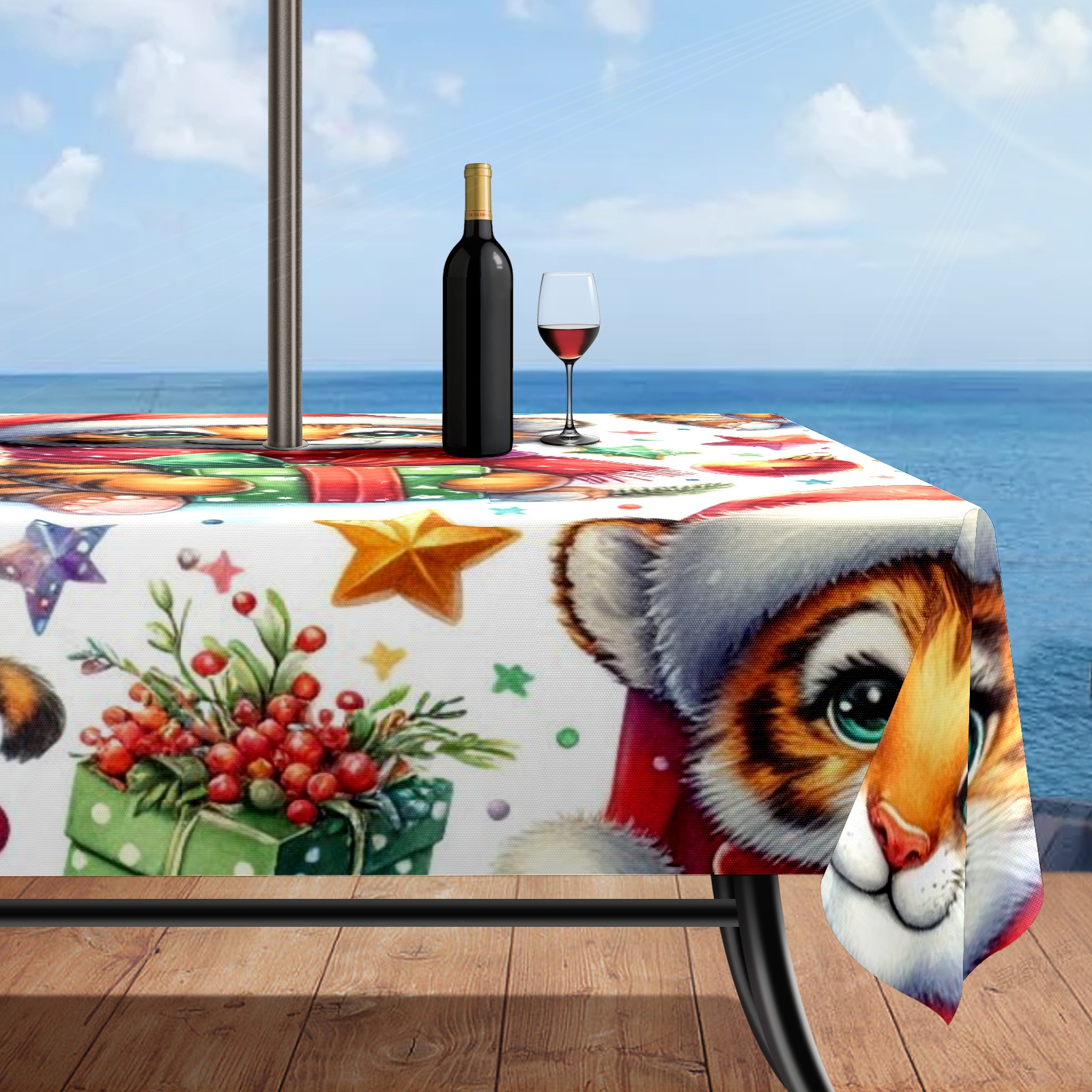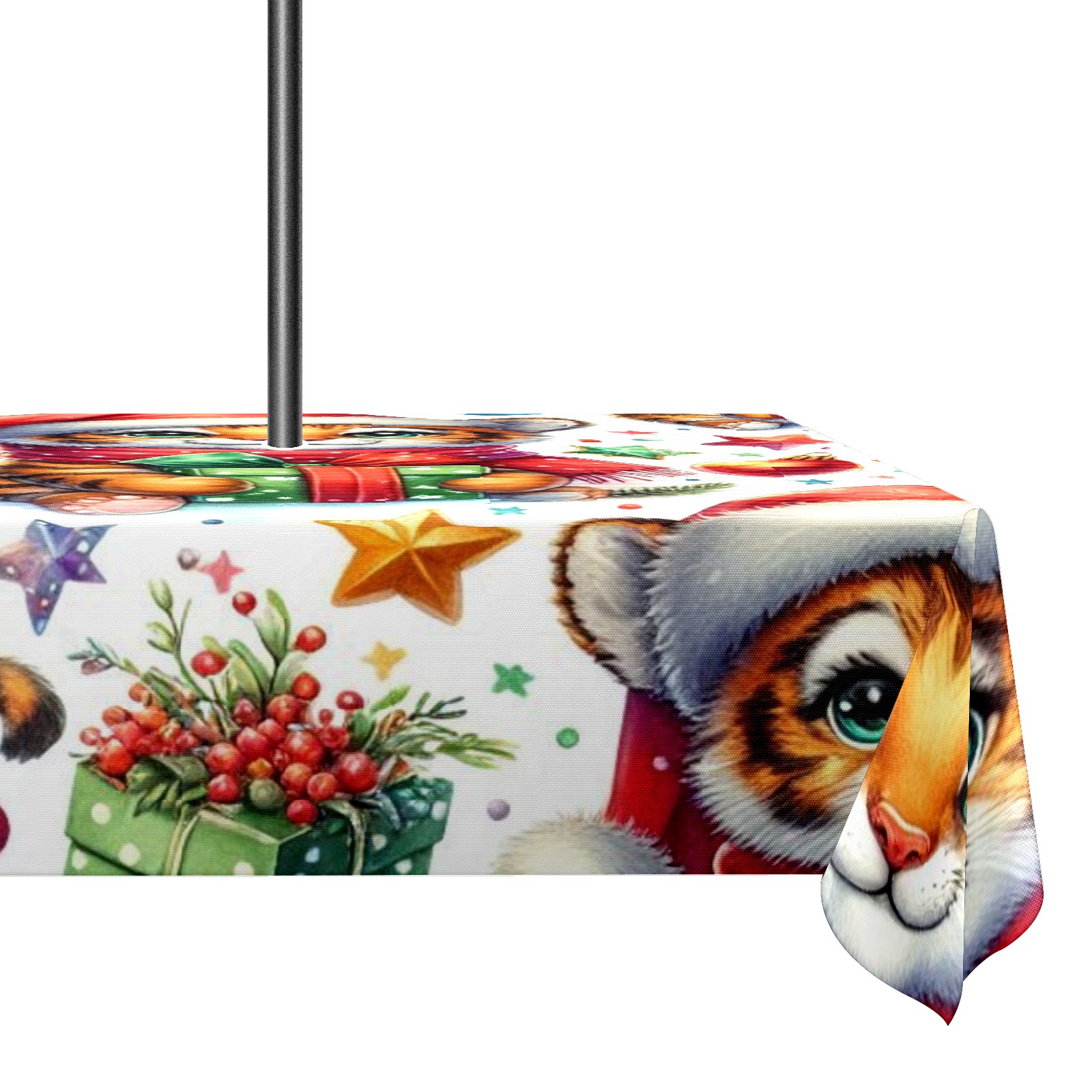 Square Umbrella Hole Tablecloth with Zipper, Red Christmas Tigers Waterproof Outdoor Patio Table Cover for Rectangular Table, 52x70 Inch, Fits 6-8 Seater, Easy Setup Without Removing Umbrella
