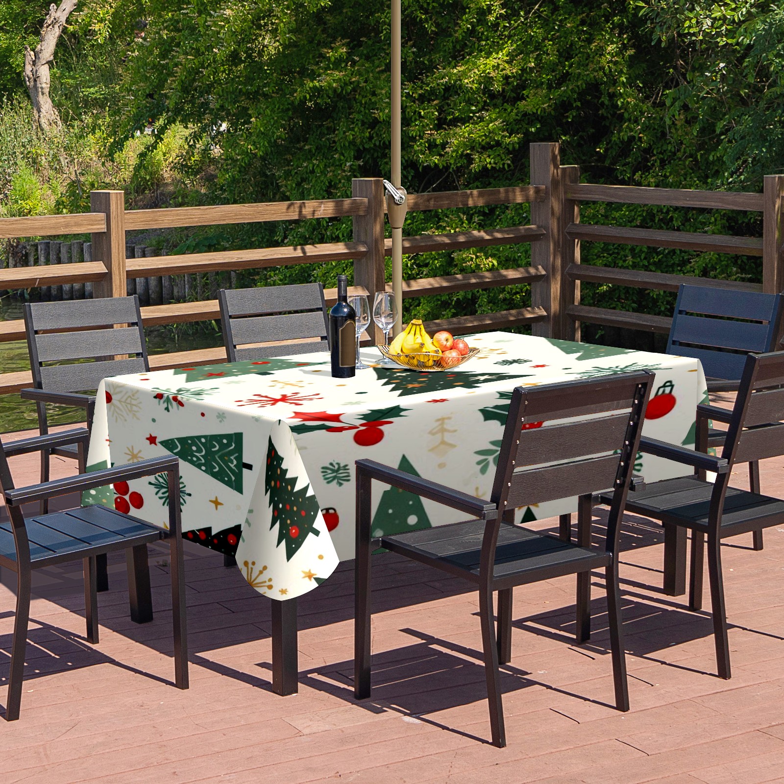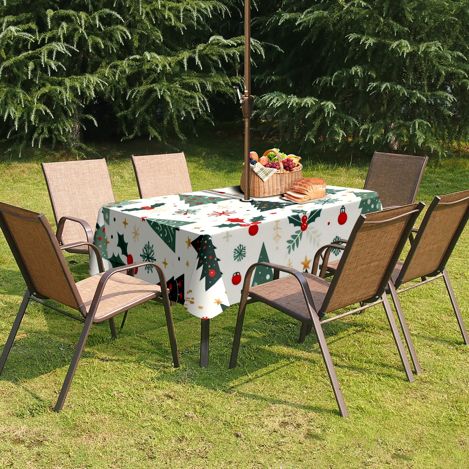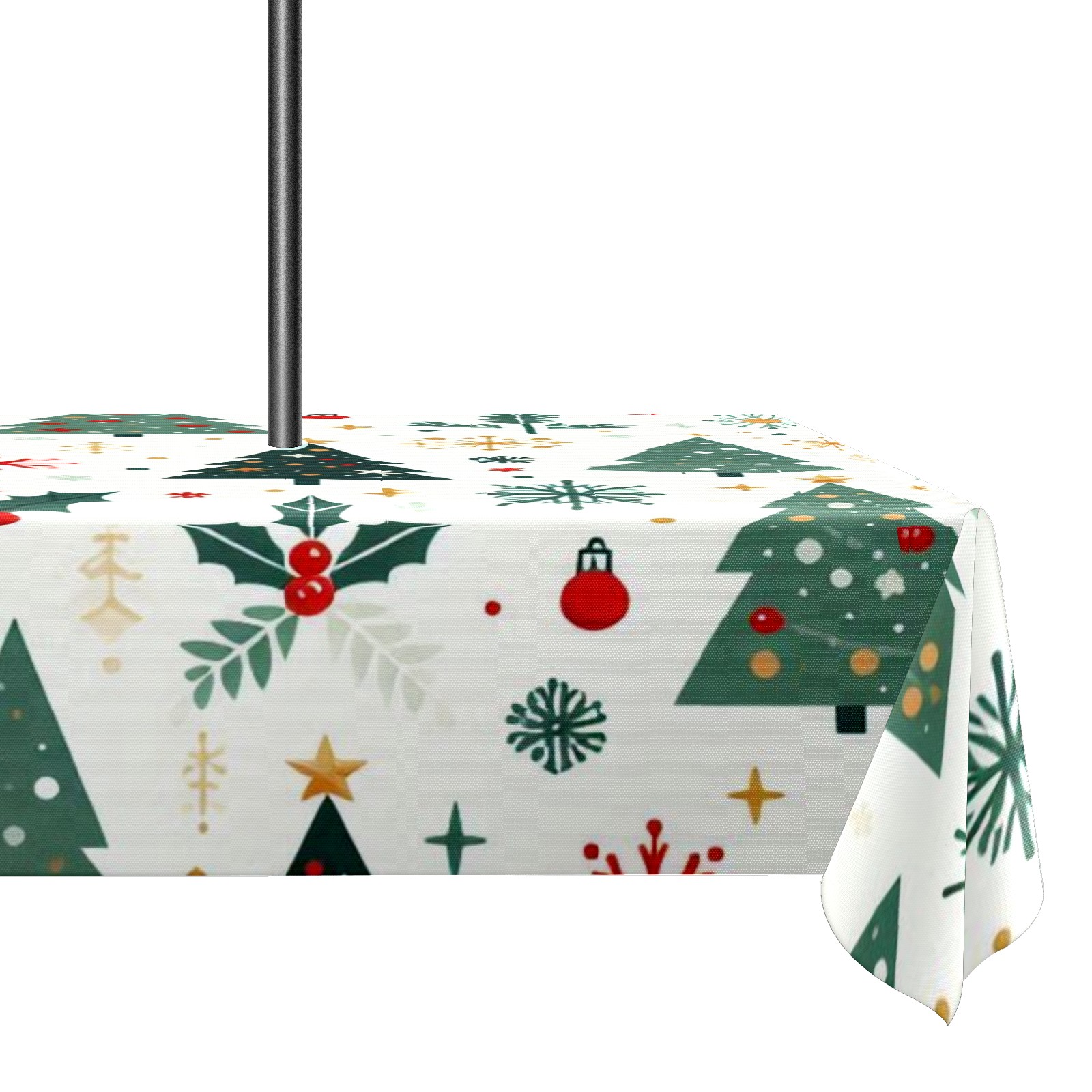 Square Umbrella Hole Tablecloth with Zipper, Green Christmas Trees Waterproof Outdoor Patio Table Cover for Rectangular Table, 52x70 Inch, Fits 6-8 Seater, Easy Setup Without Removing Umbrella