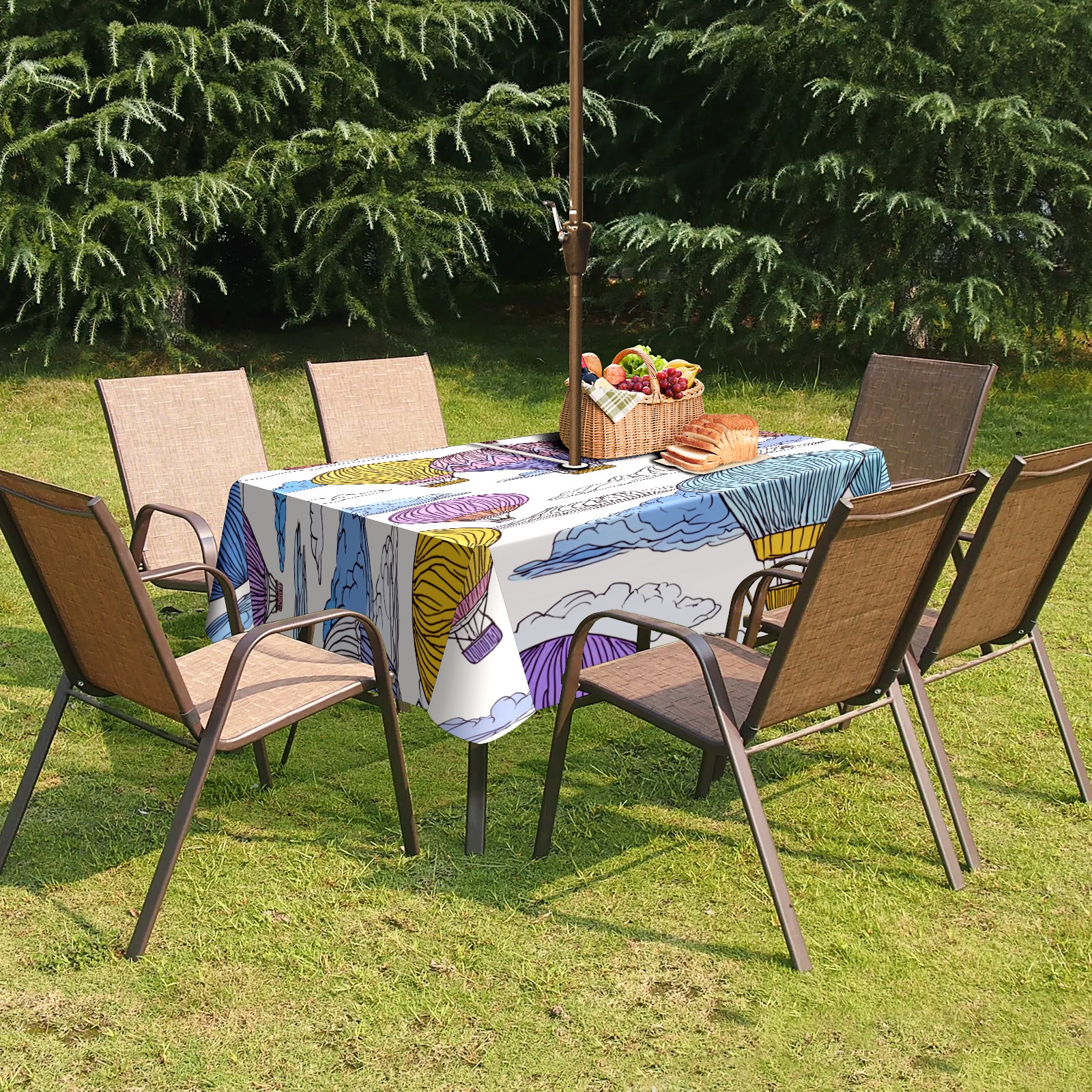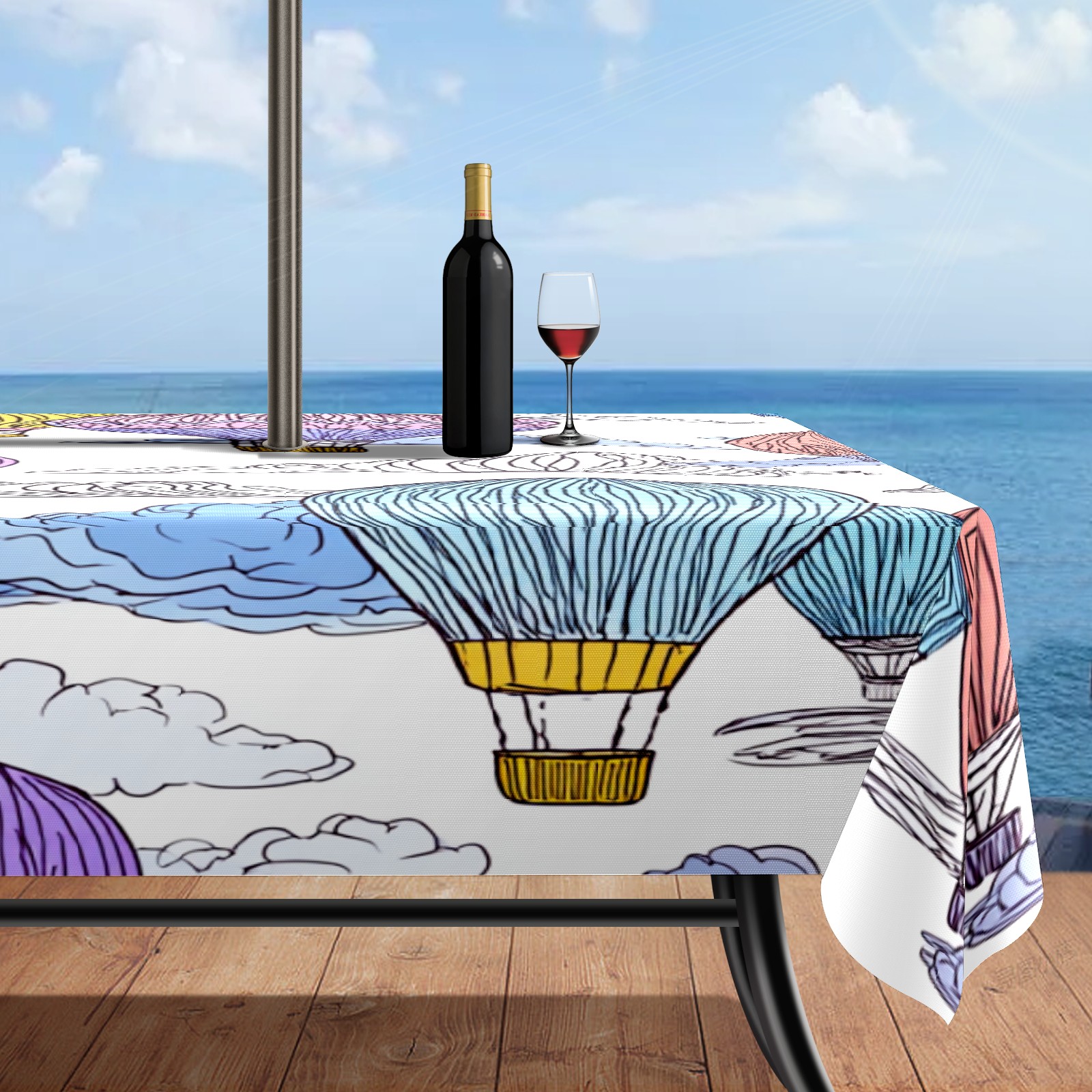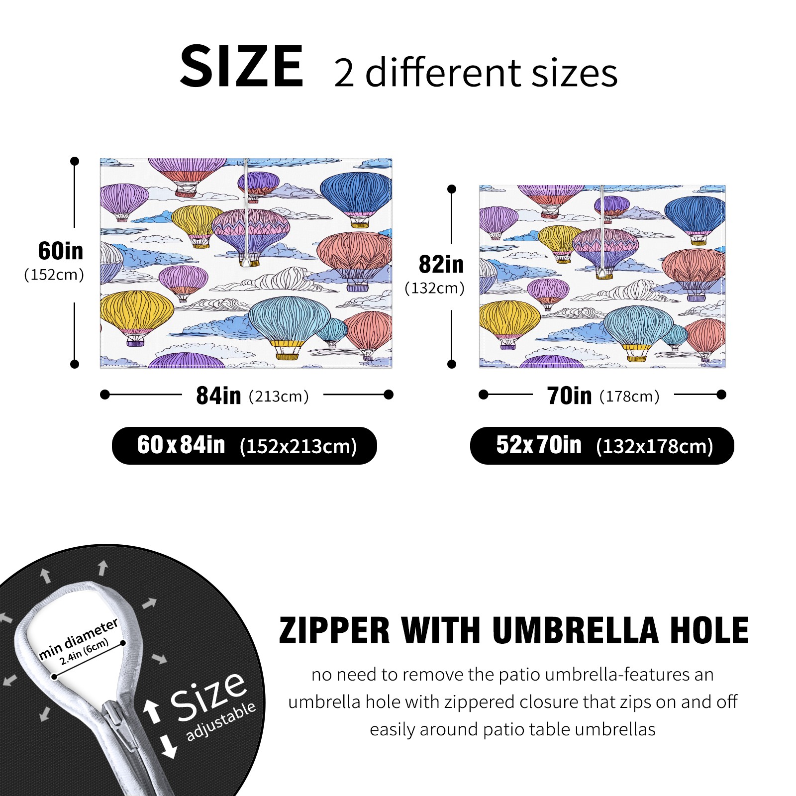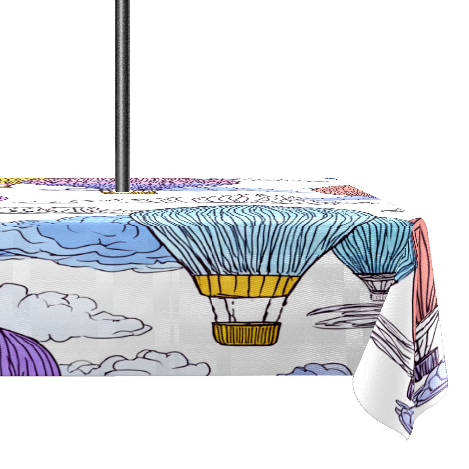 Square Umbrella Hole Tablecloth with Zipper, Colorful Hot Air Balloons Sky Waterproof Outdoor Patio Table Cover for Rectangular Table, 52x70 Inch, Fits 6-8 Seater, Easy Setup Without Removing Umbrella