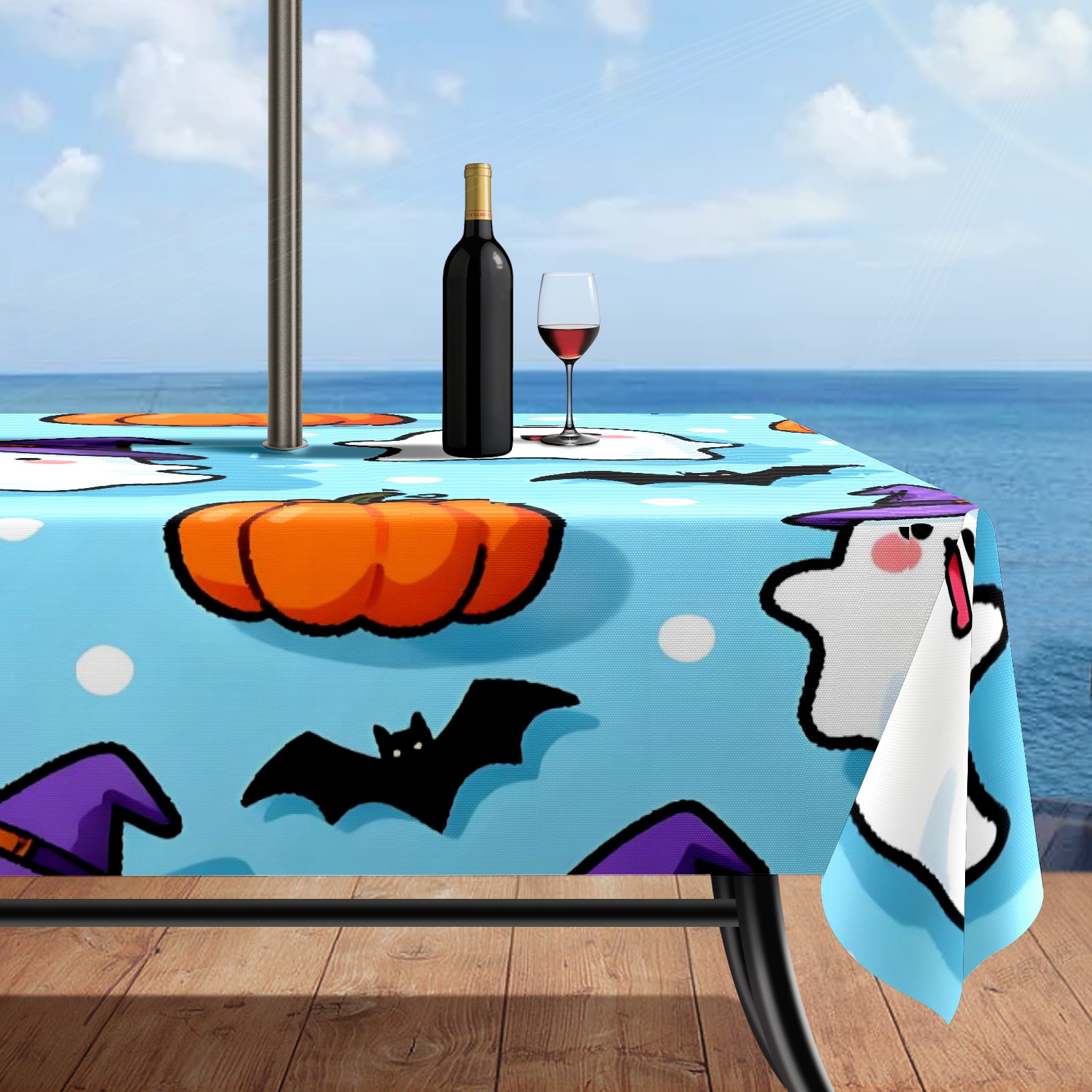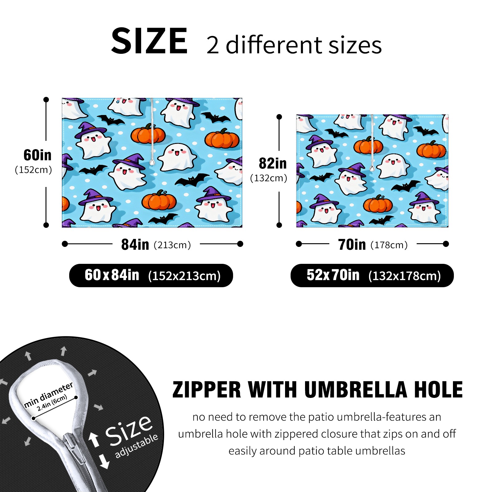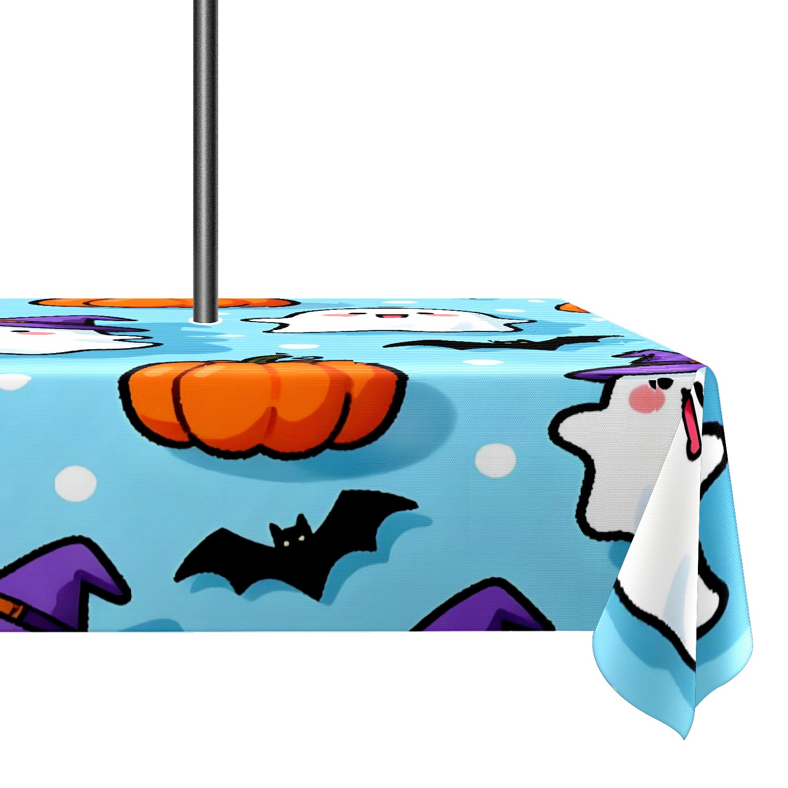 Square Umbrella Hole Tablecloth with Zipper, Light Blue Halloween Ghosts Pumpkins Waterproof Outdoor Patio Table Cover for Rectangular Table, 52x70 Inch, Fits 6-8 Seater, Easy Setup Without Removing Umbrella