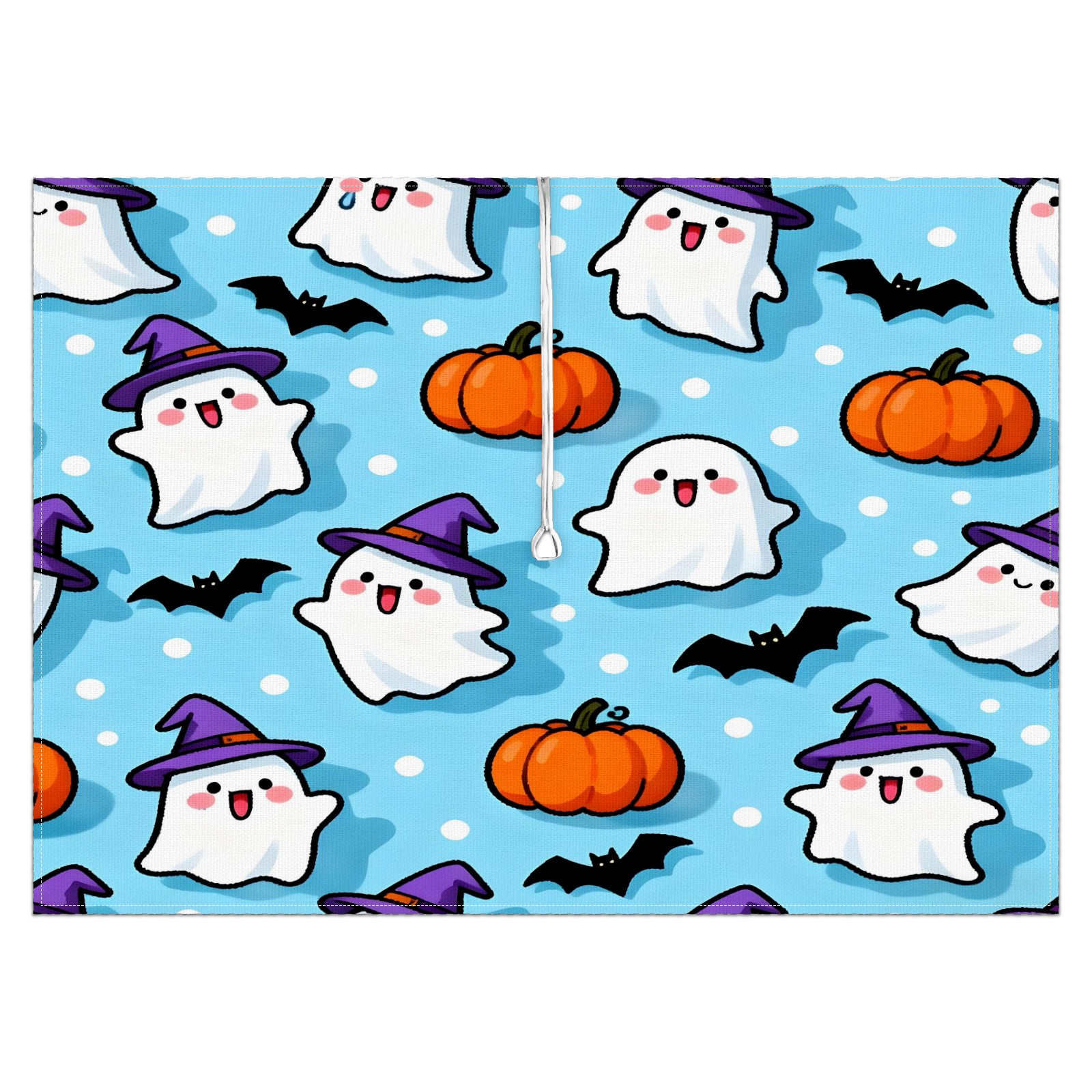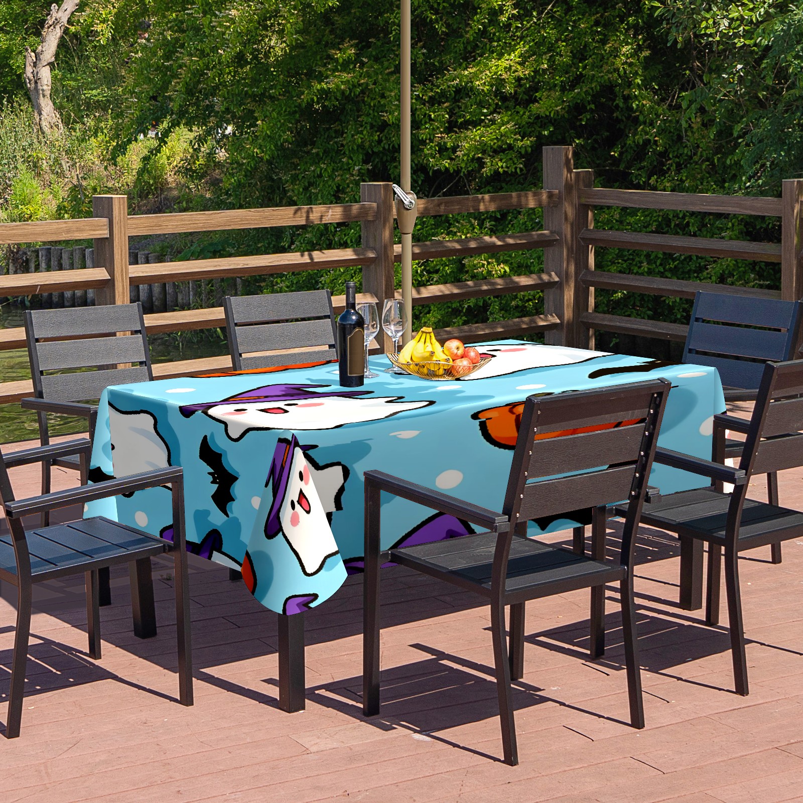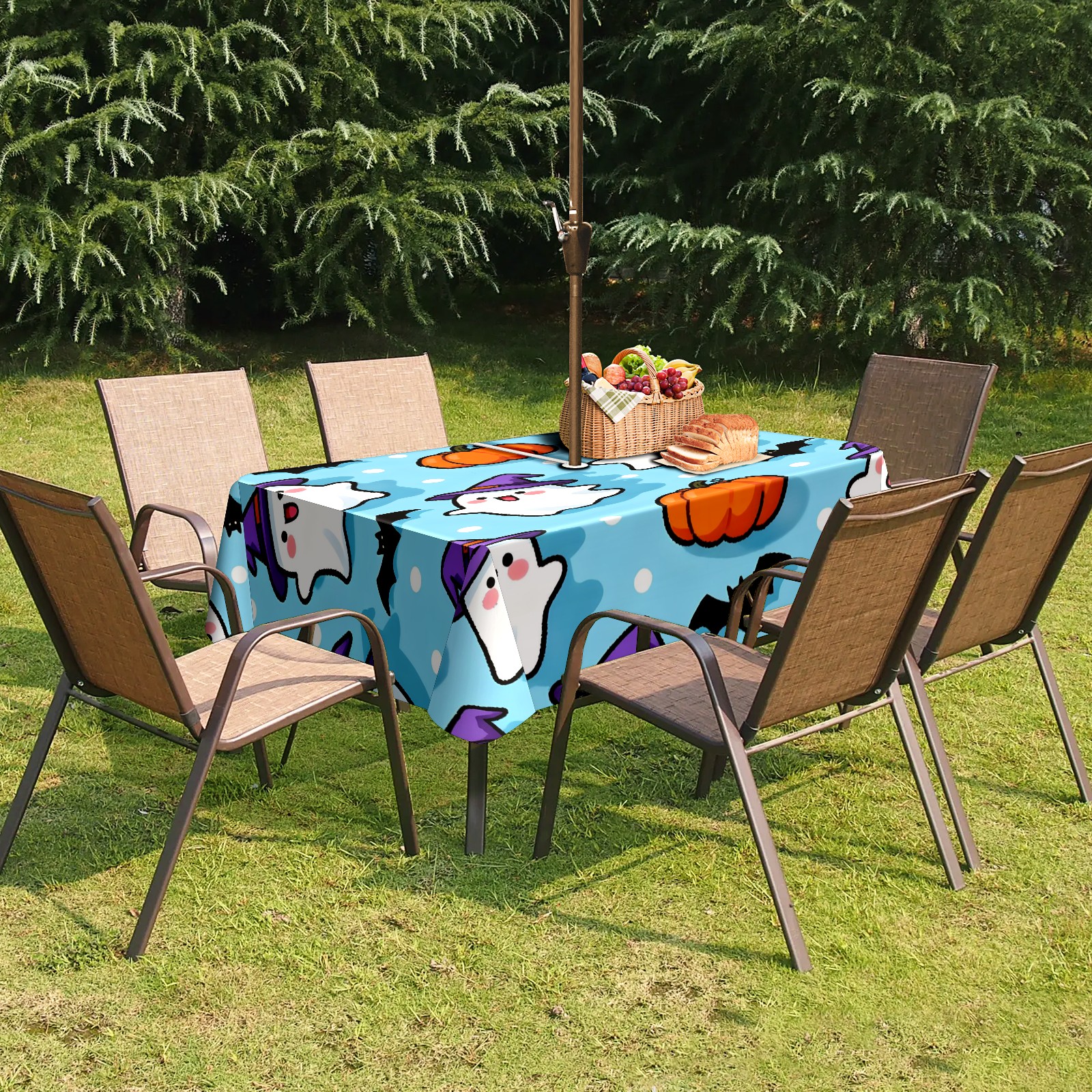 Square Umbrella Hole Tablecloth with Zipper, Light Blue Halloween Ghosts Pumpkins Waterproof Outdoor Patio Table Cover for Rectangular Table, 52x70 Inch, Fits 6-8 Seater, Easy Setup Without Removing Umbrella