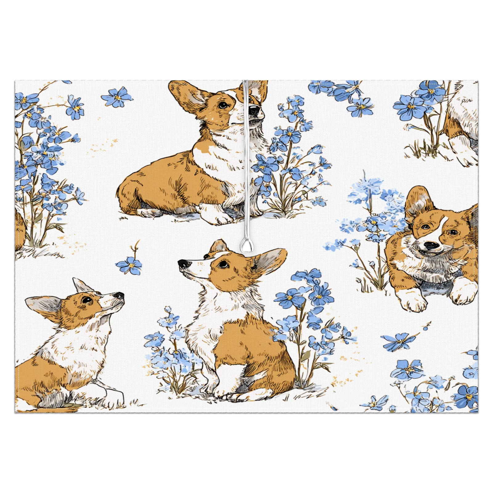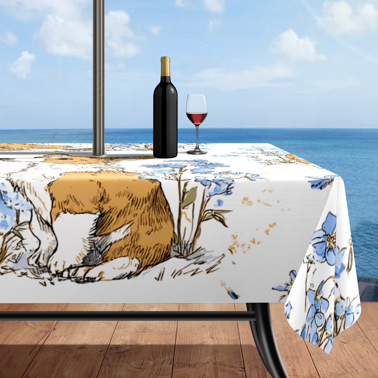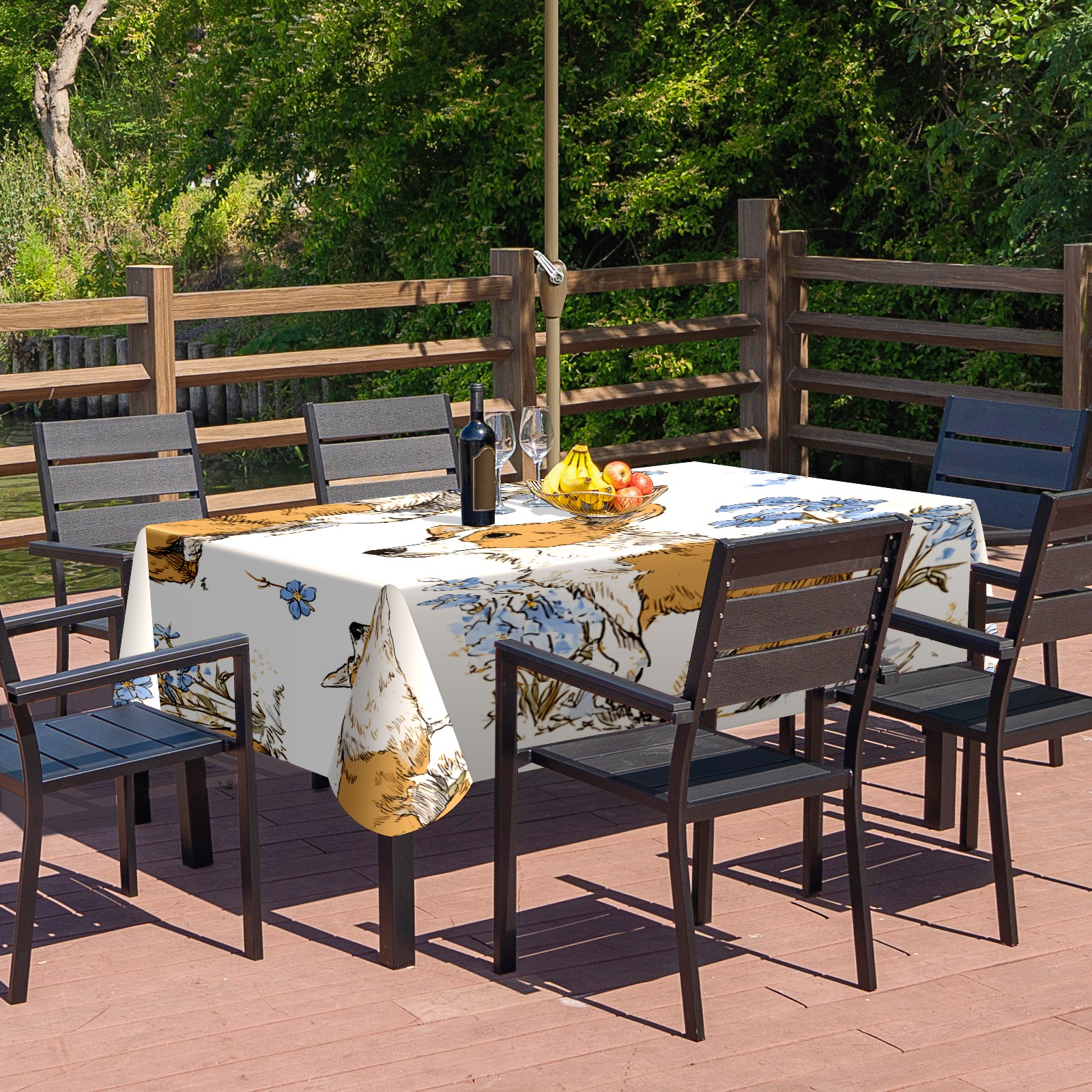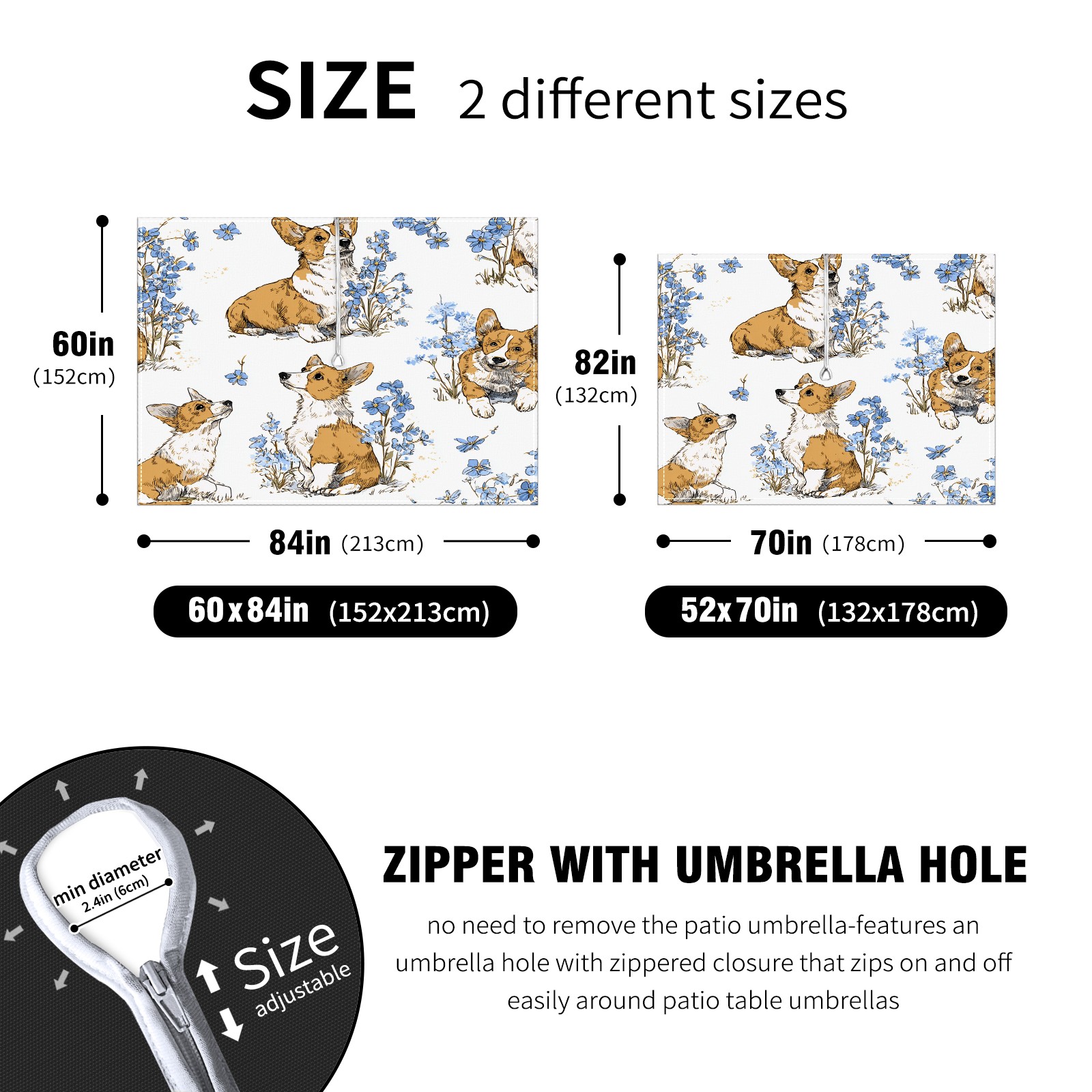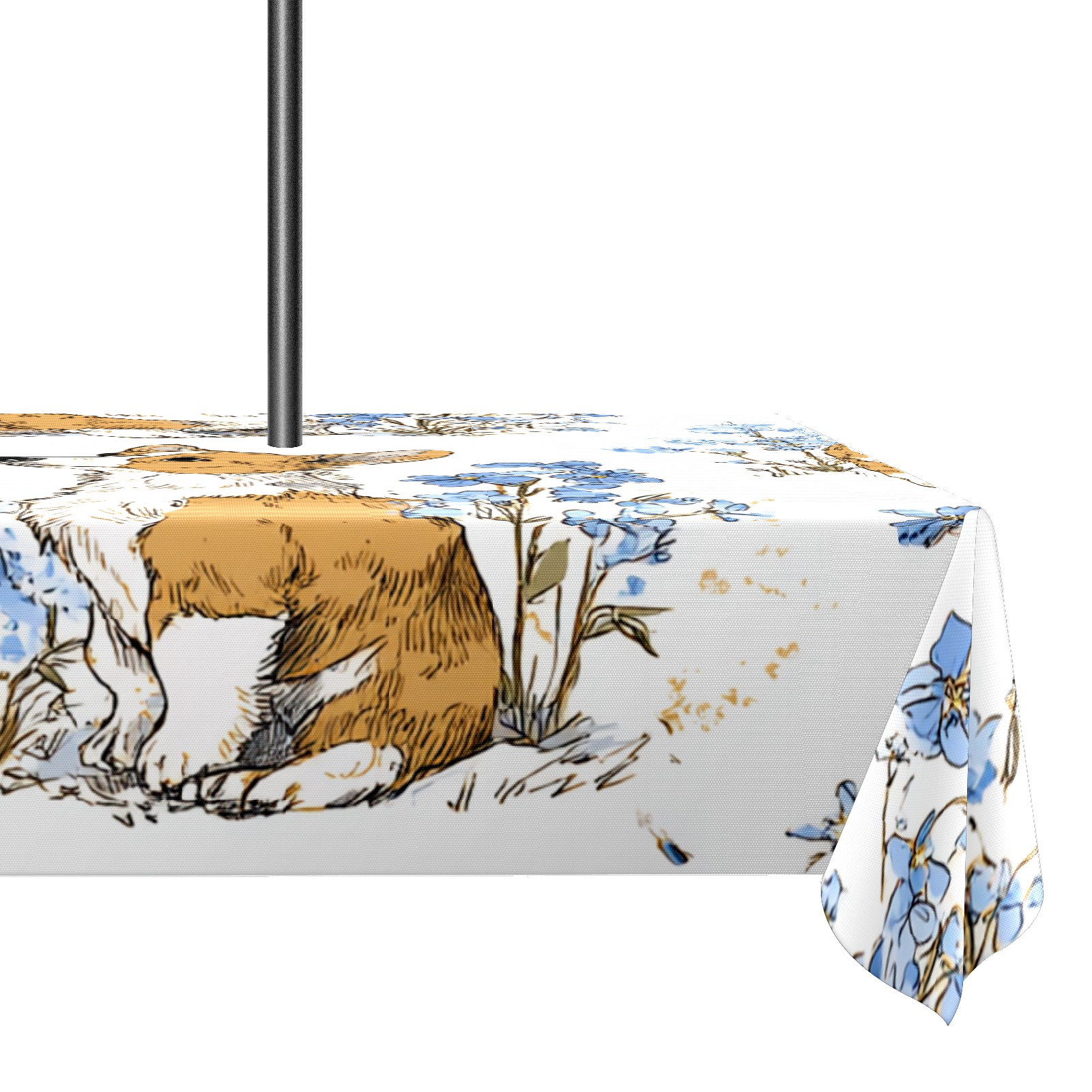 Square Umbrella Hole Tablecloth with Zipper, White Corgis Waterproof Outdoor Patio Table Cover for Rectangular Table, 52x70 Inch, Fits 6-8 Seater, Easy Setup Without Removing Umbrella
