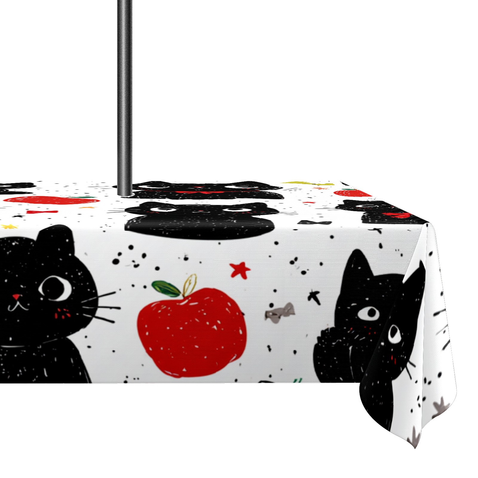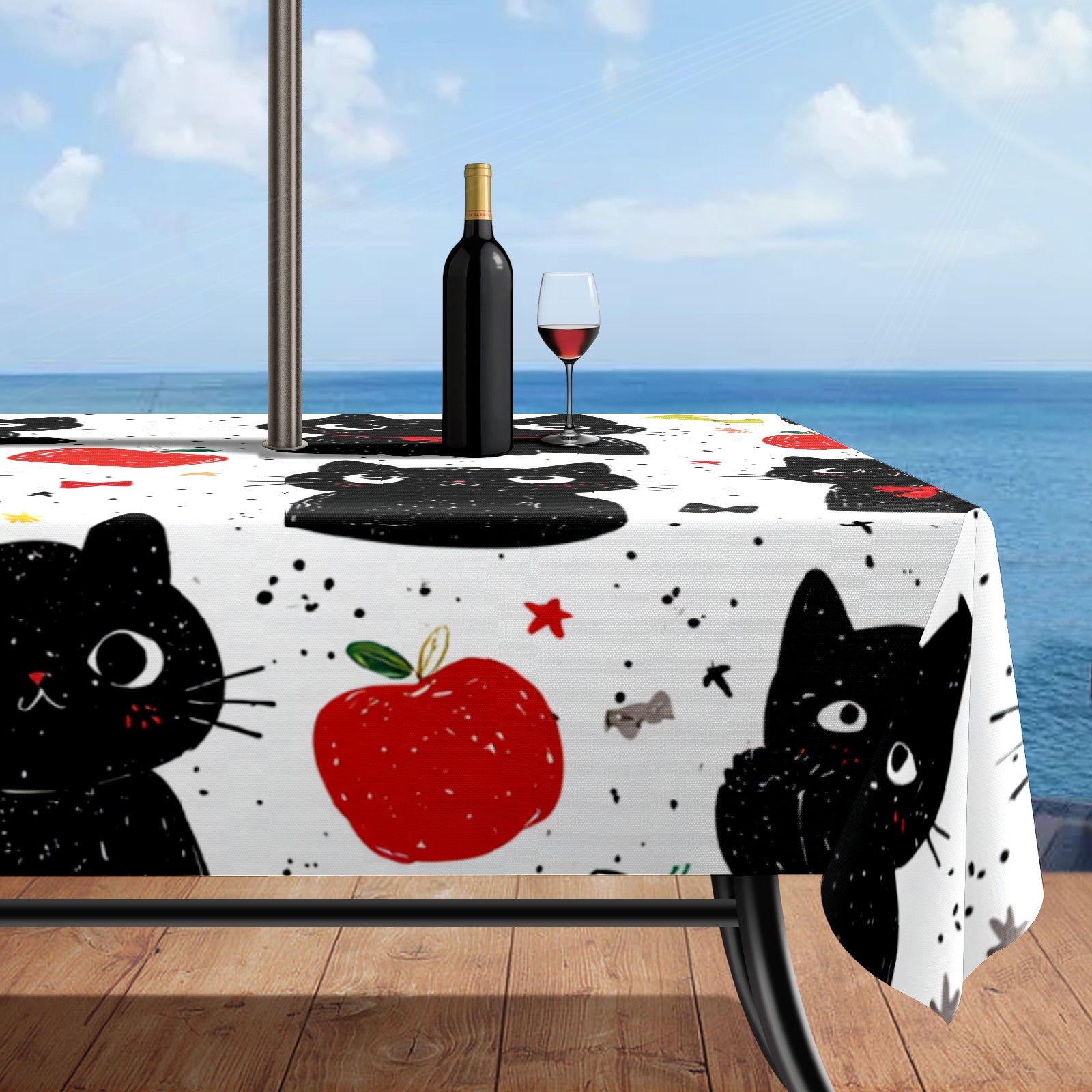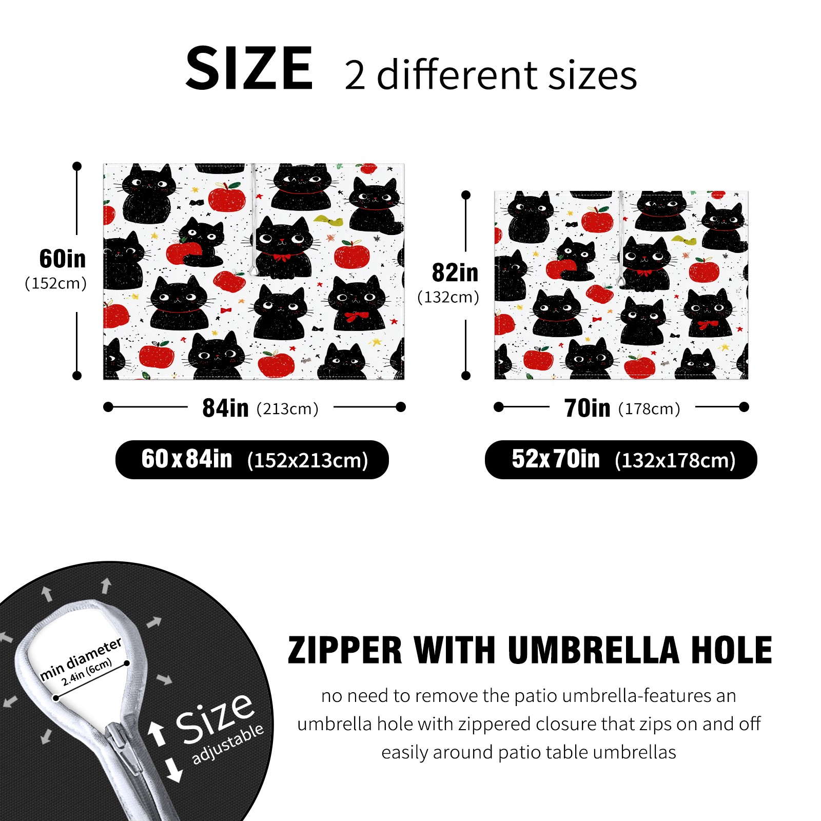 Square Umbrella Hole Tablecloth with Zipper, Black Cats Red Apples Waterproof Outdoor Patio Table Cover for Rectangular Table, 52x70 Inch, Fits 6-8 Seater, Easy Setup Without Removing Umbrella