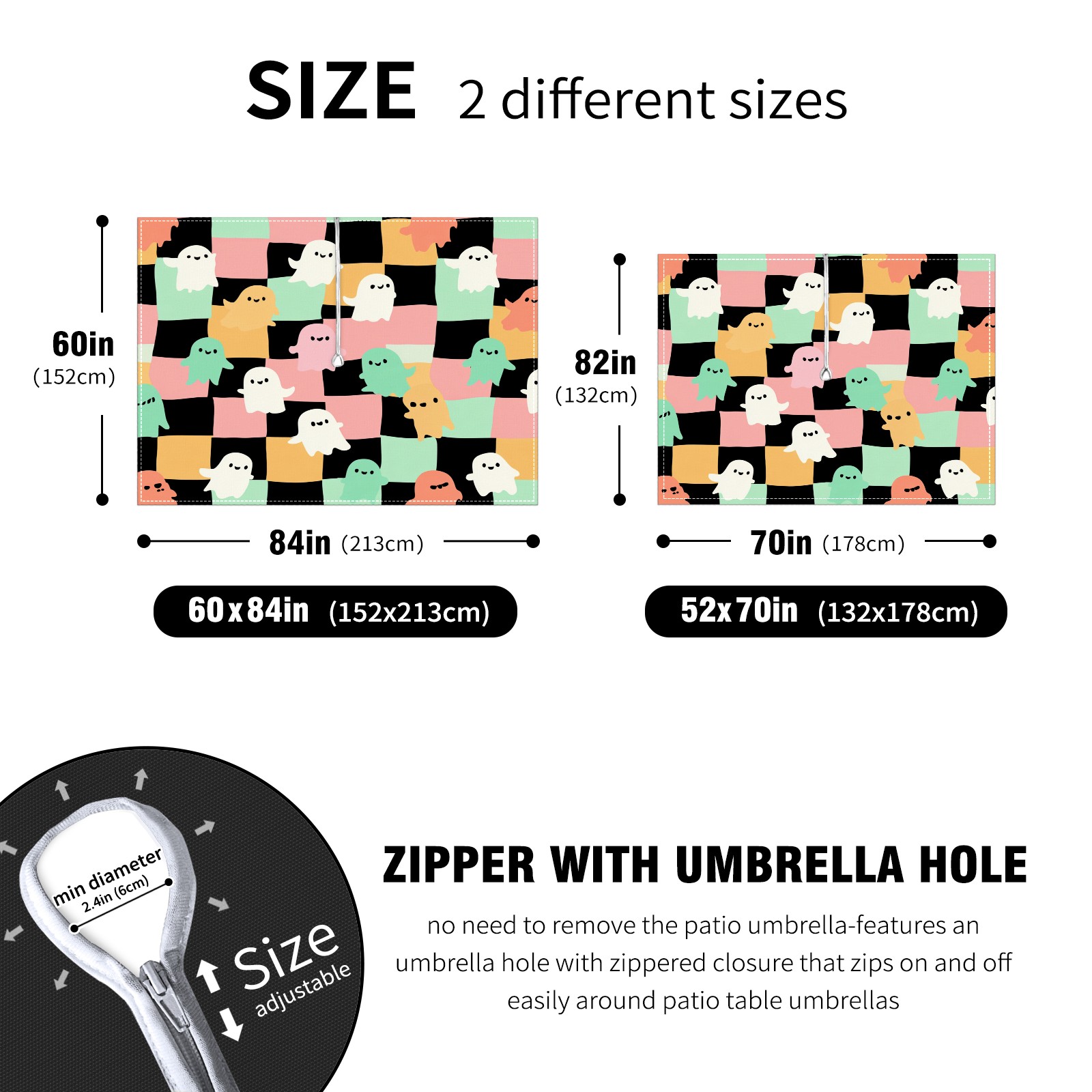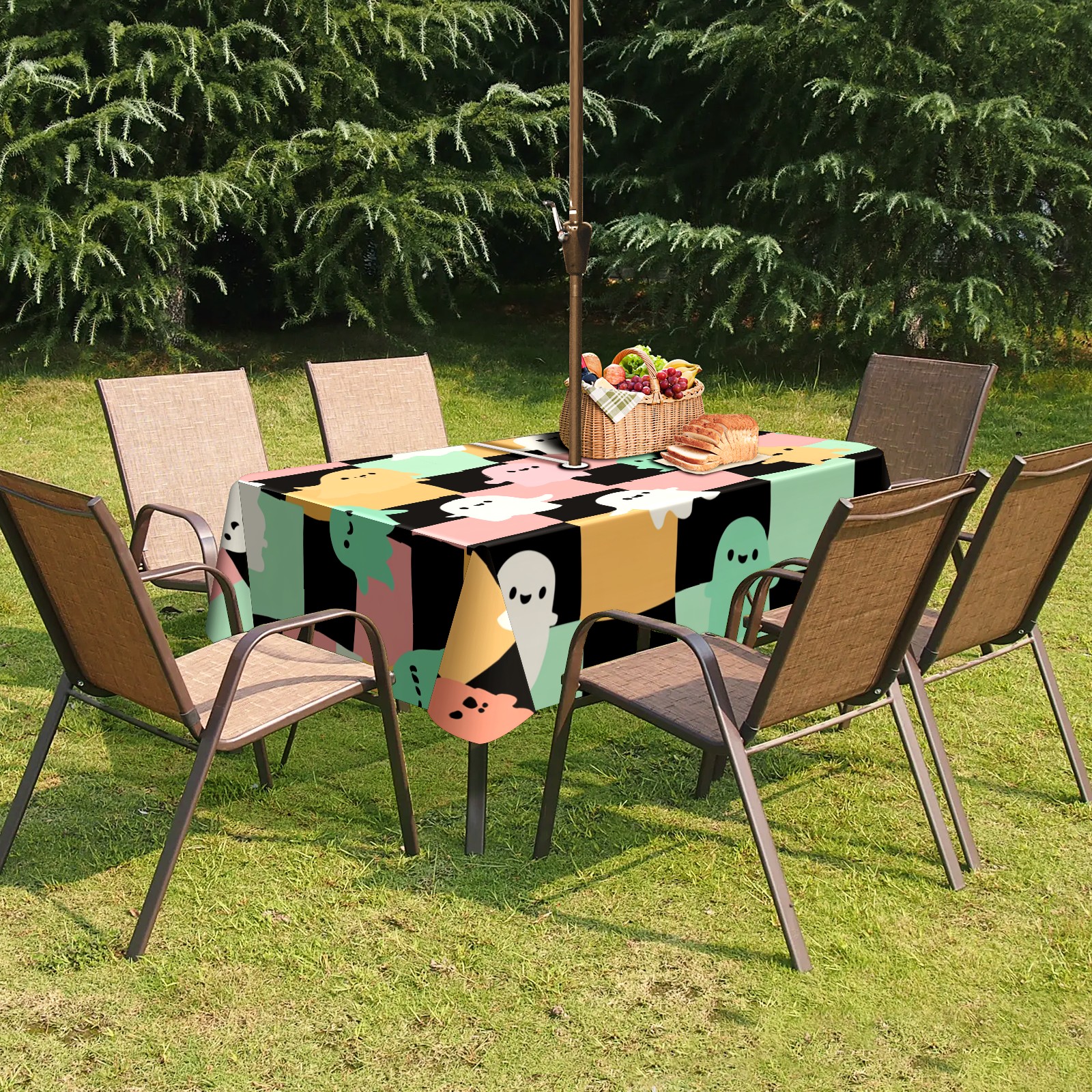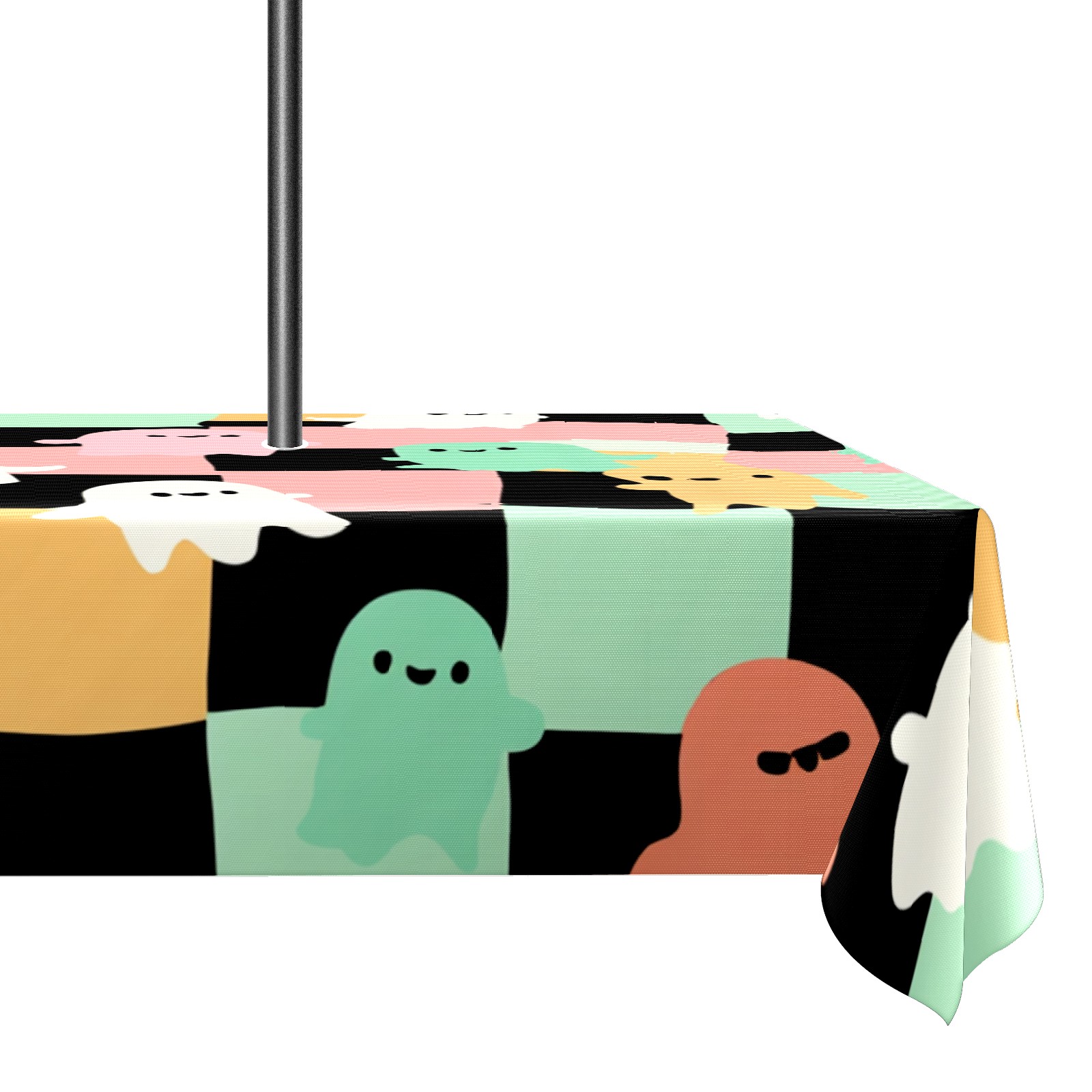 Square Umbrella Hole Tablecloth with Zipper, Colorful Checker Ghost Waterproof Outdoor Patio Table Cover for Rectangular Table, 52x70 Inch, Fits 6-8 Seater, Easy Setup Without Removing Umbrella