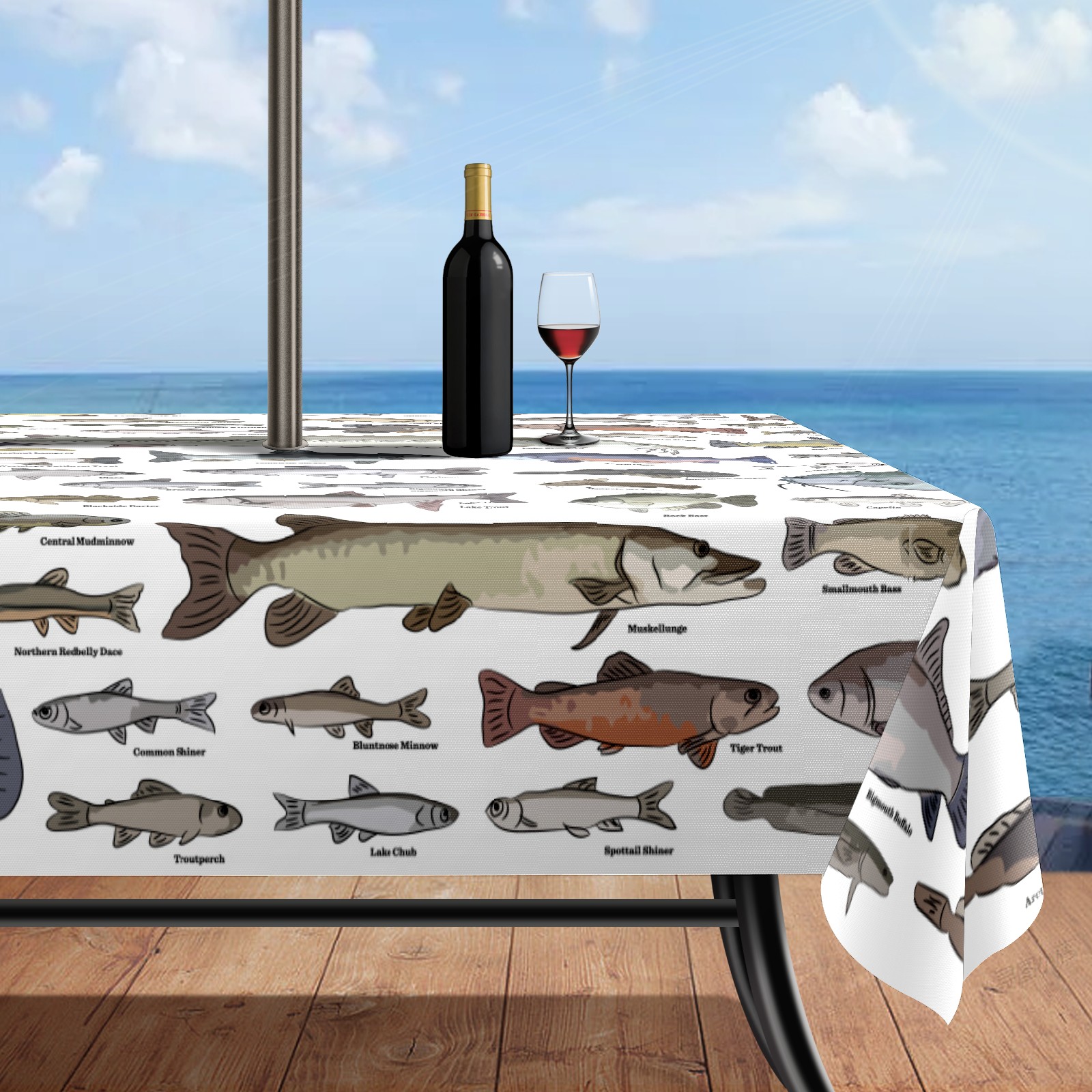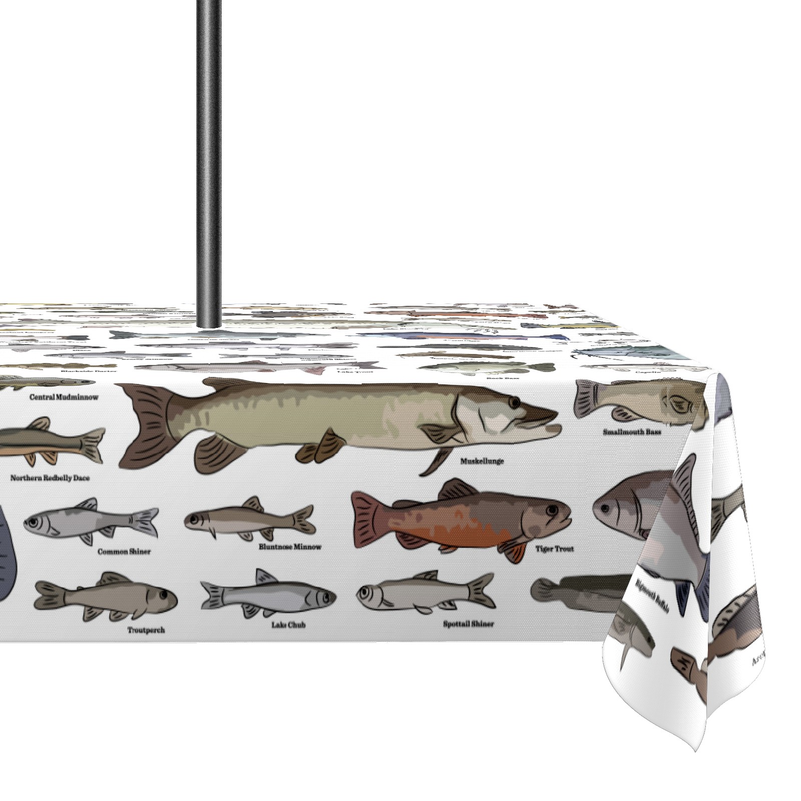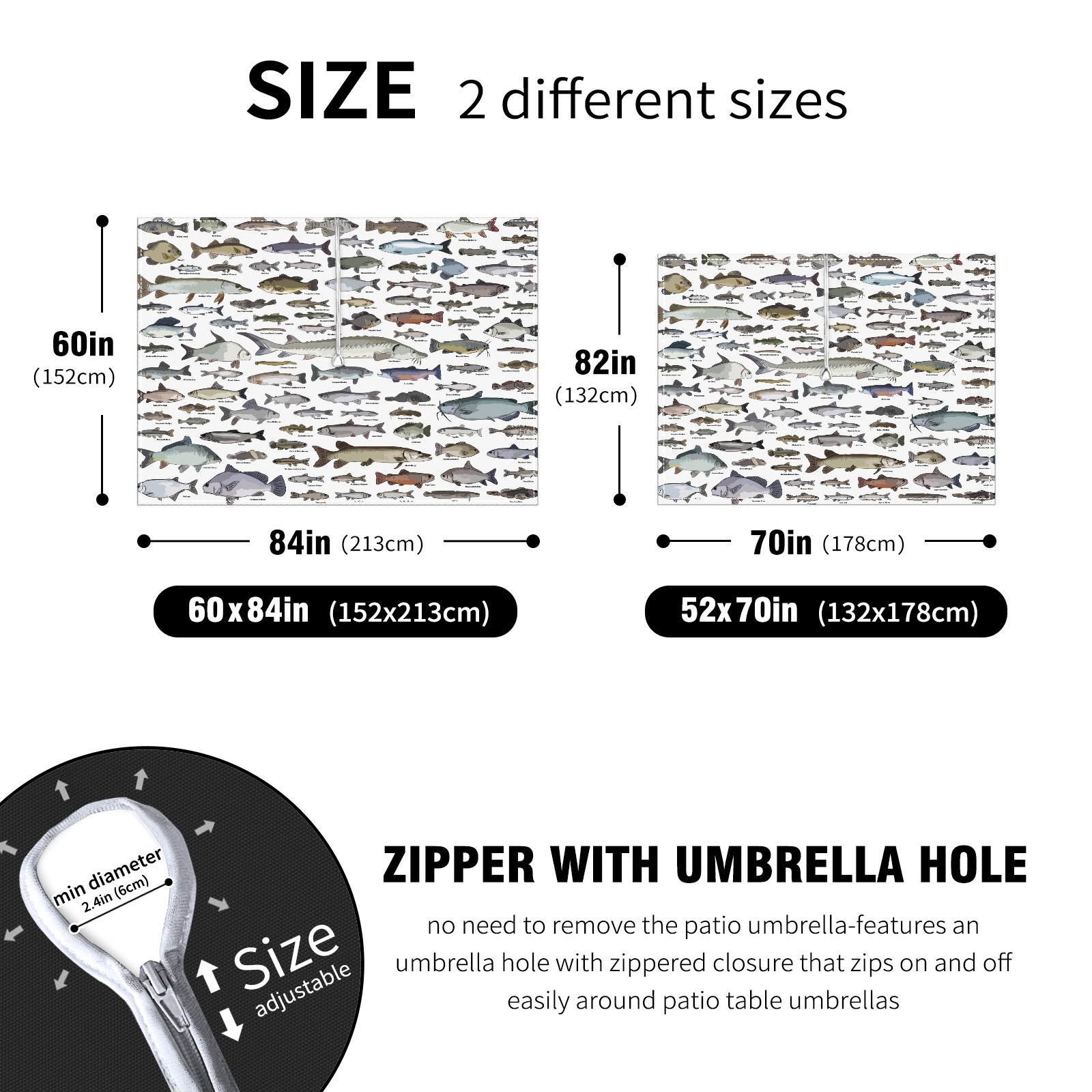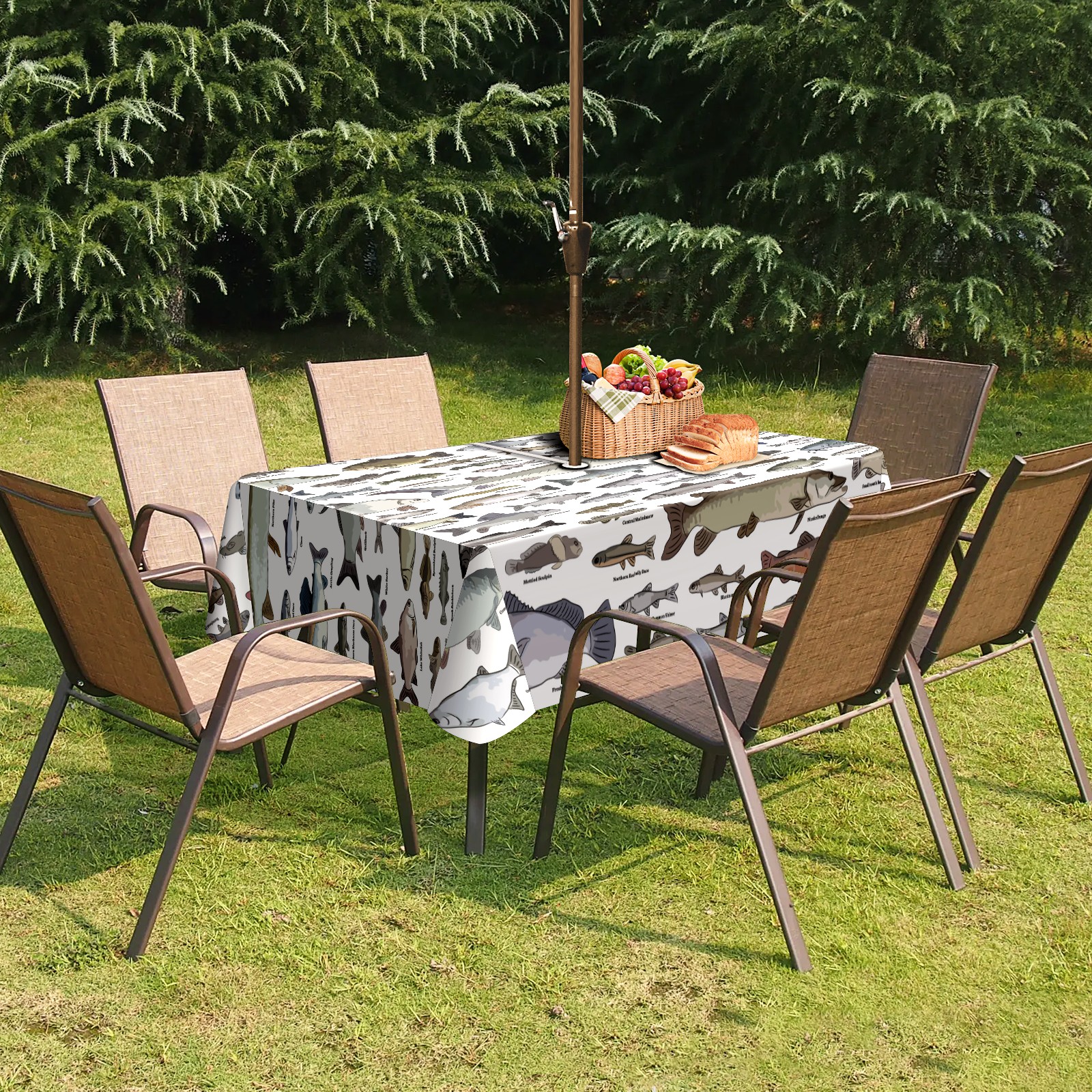 Square Umbrella Hole Tablecloth with Zipper, Sea Fish Pattern Waterproof Outdoor Patio Table Cover for Rectangular Table, 52x70 Inch, Fits 6-8 Seater, Easy Setup Without Removing Umbrella