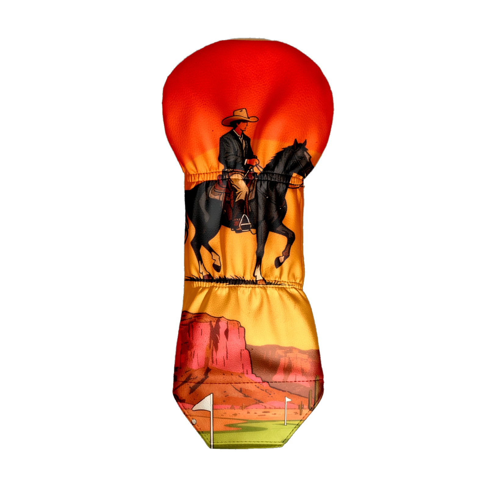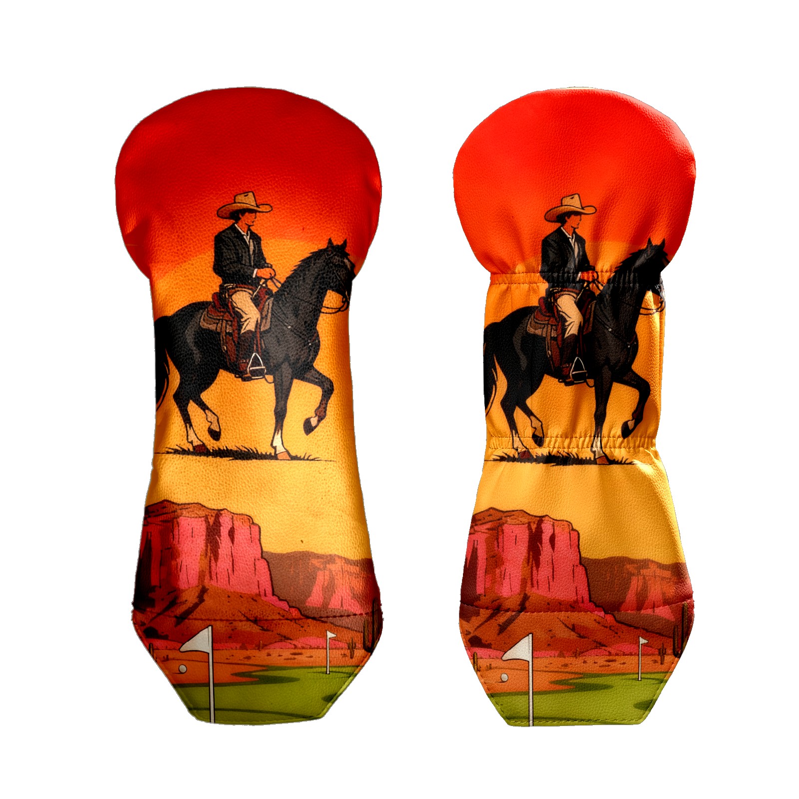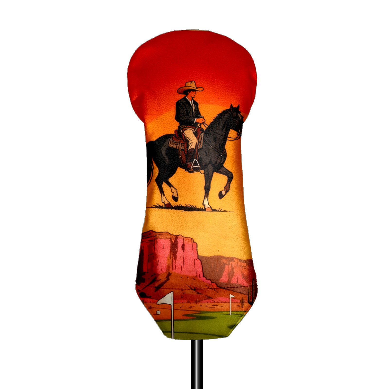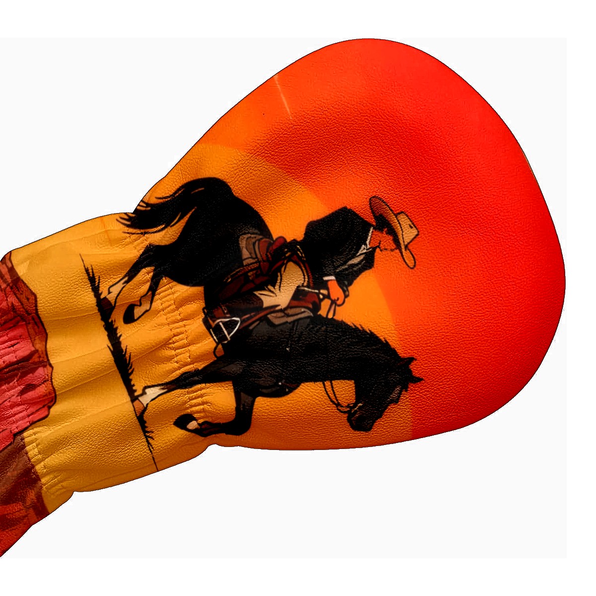Jimeng-2025-10-20-4492-参考图1的复古插画风格和构图,牛仔骑手戴着宽边帽,骑在黑色马匹上,背景天空改为橙...