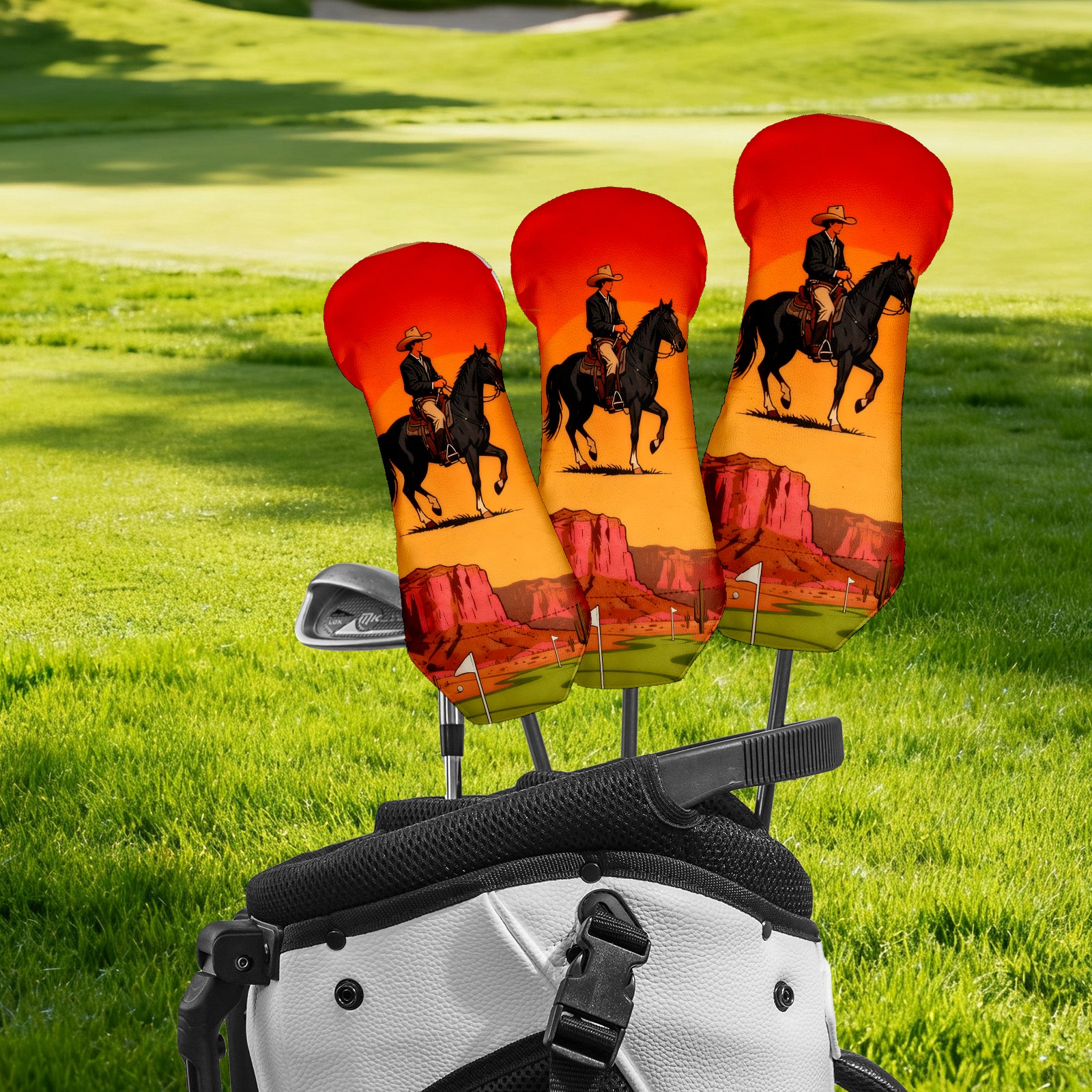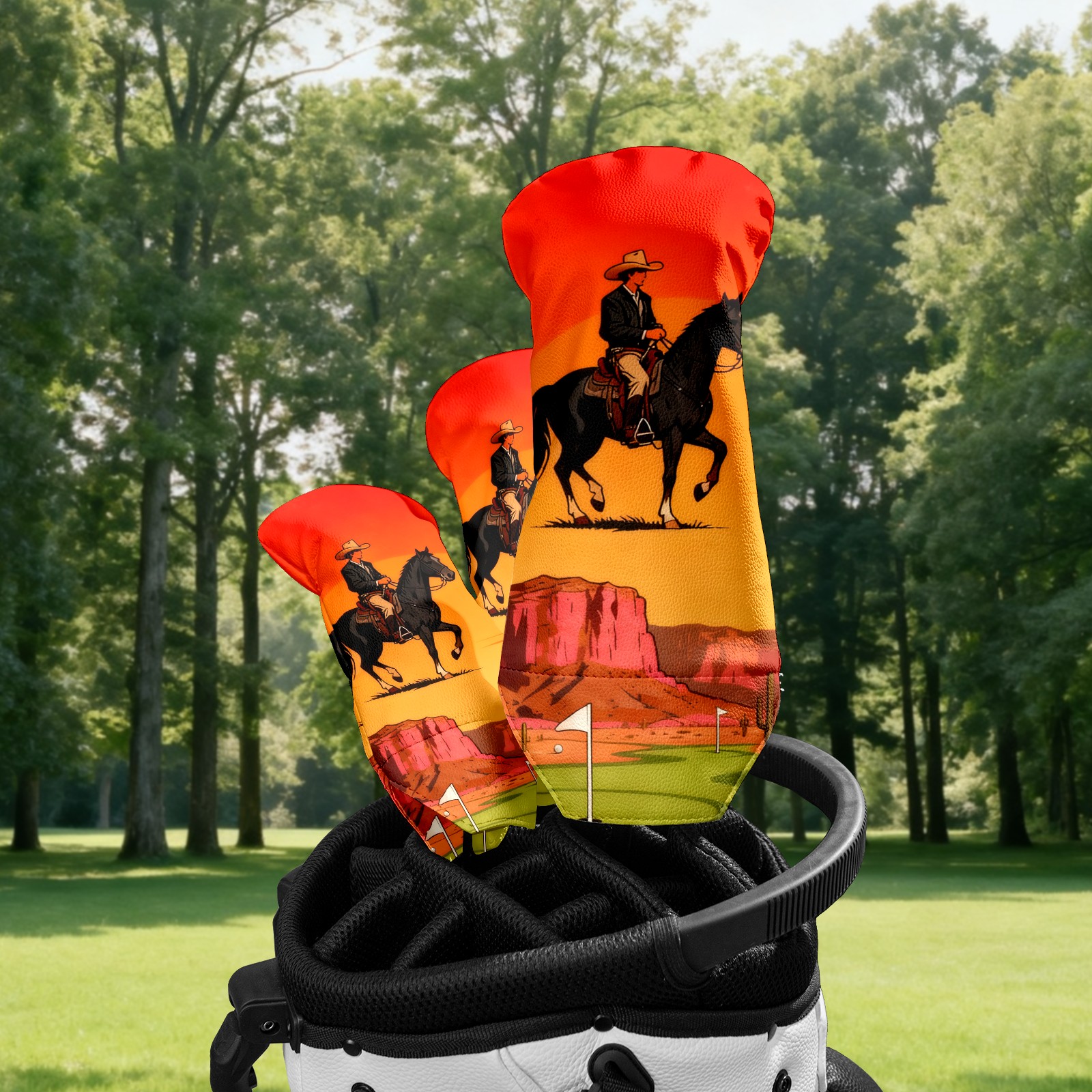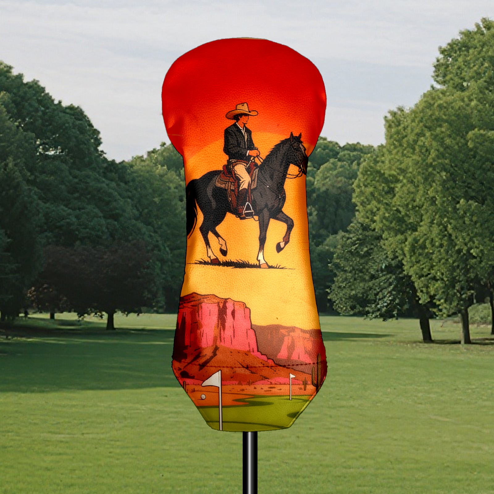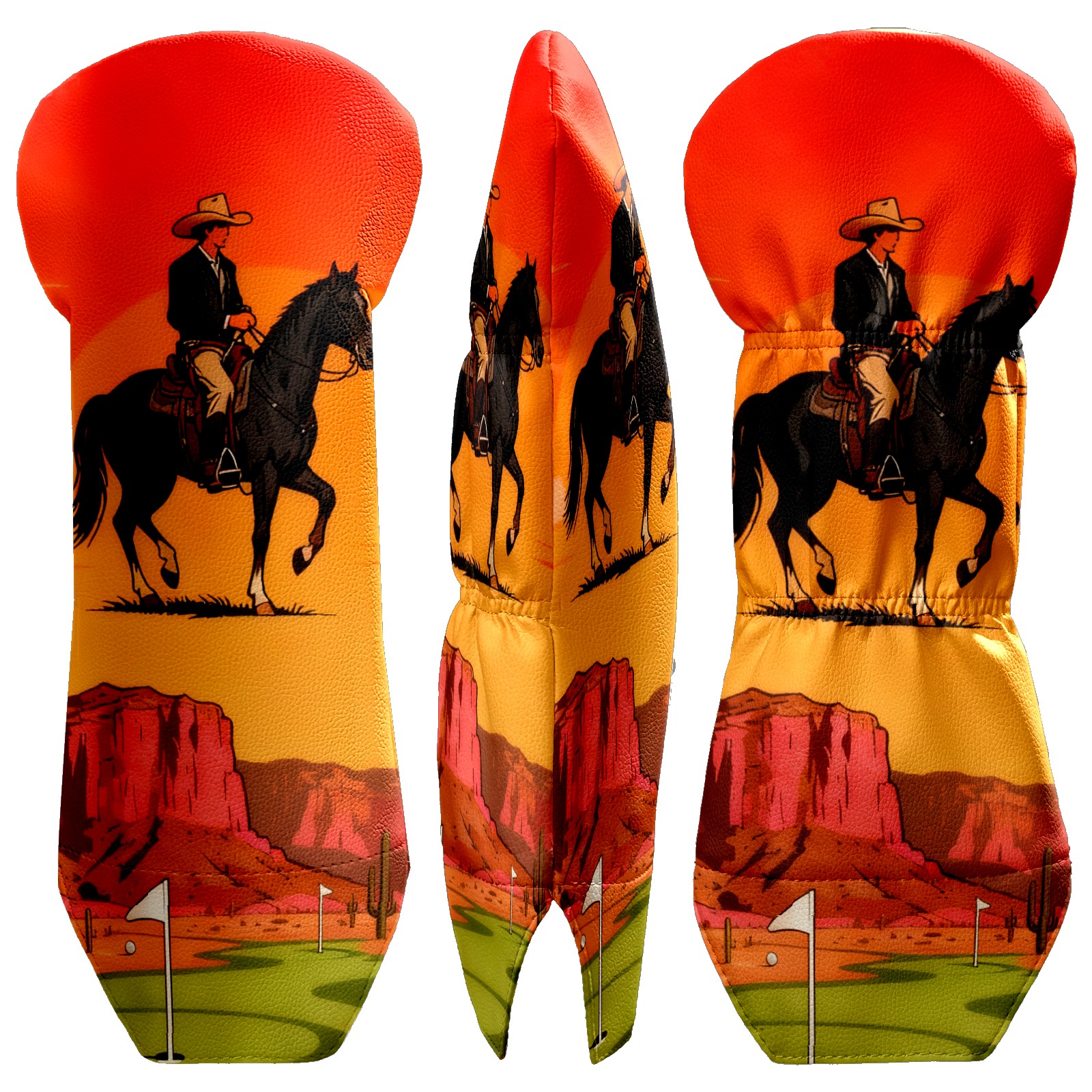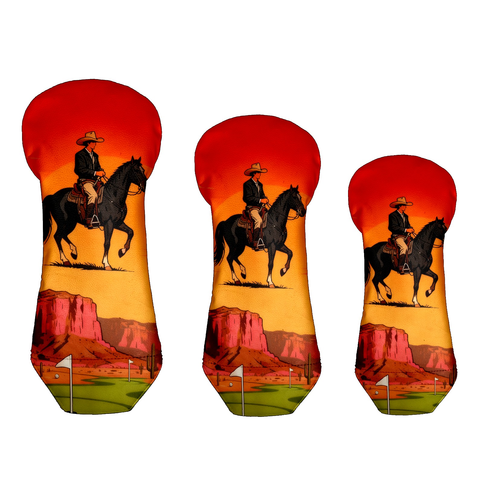 Jimeng-2025-10-20-4492-参考图1的复古插画风格和构图,牛仔骑手戴着宽边帽,骑在黑色马匹上,背景天空改为橙...