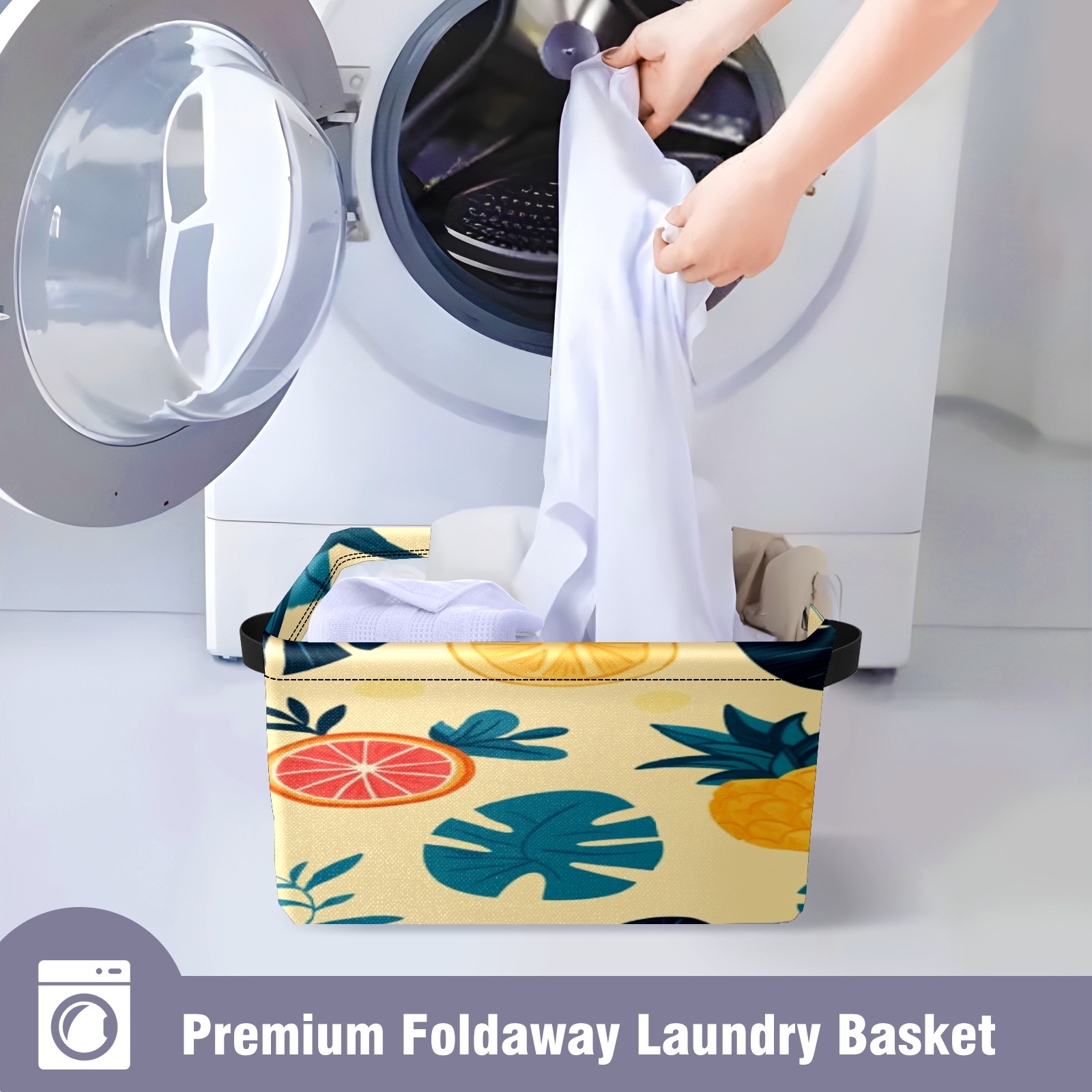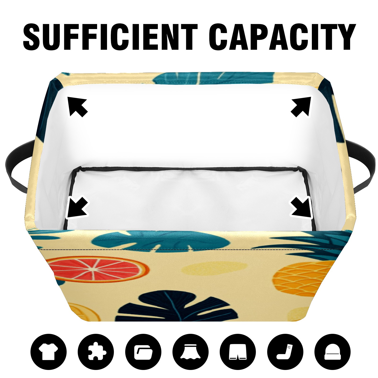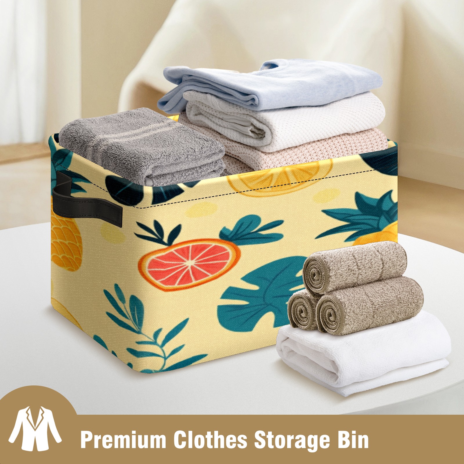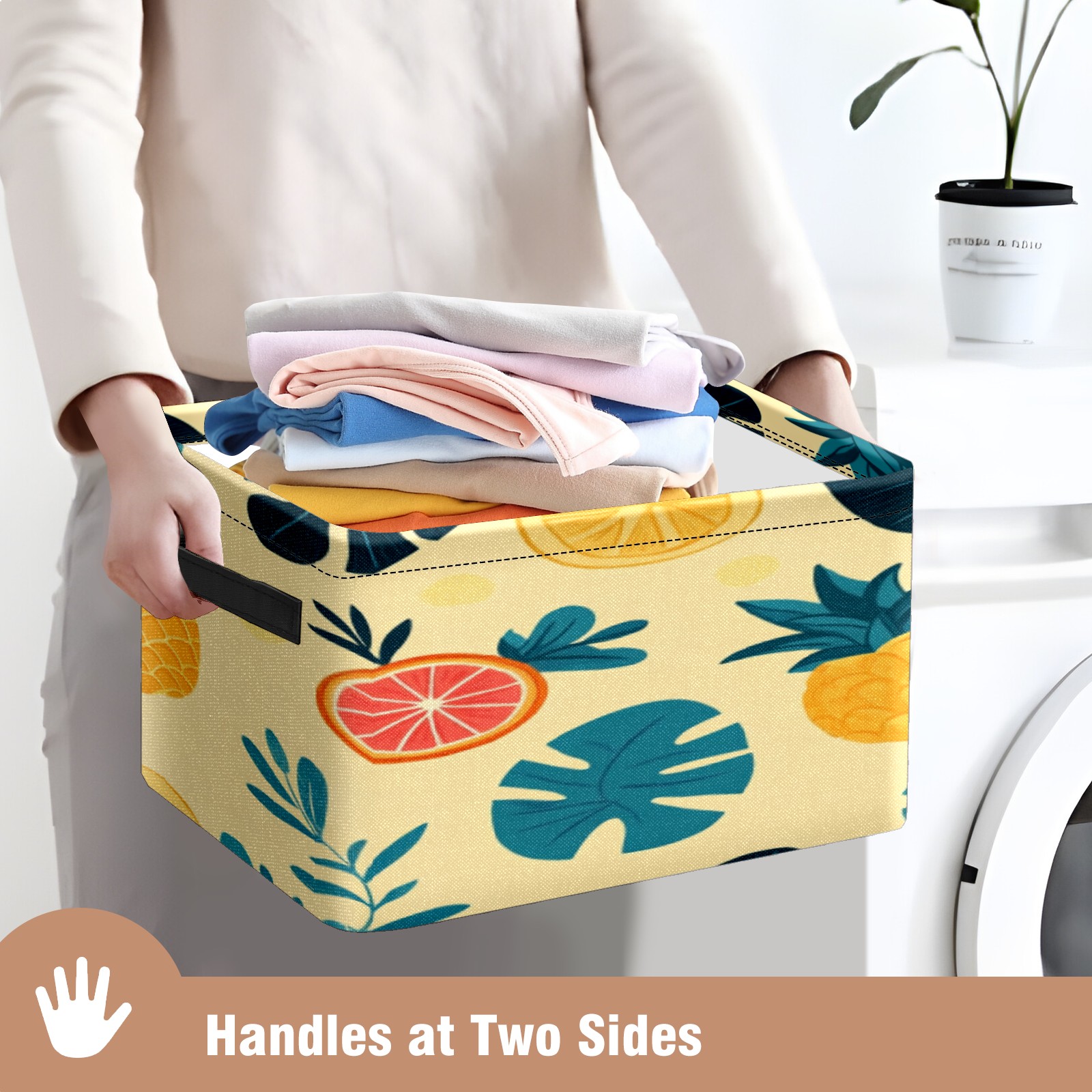 Foldable and Stackable Fabric Storage Basket for Home Organization with Handles, Decorative Closet Bins for Shelves, Laundry, and Toy Storage( Pineapples Tropical Leaves)