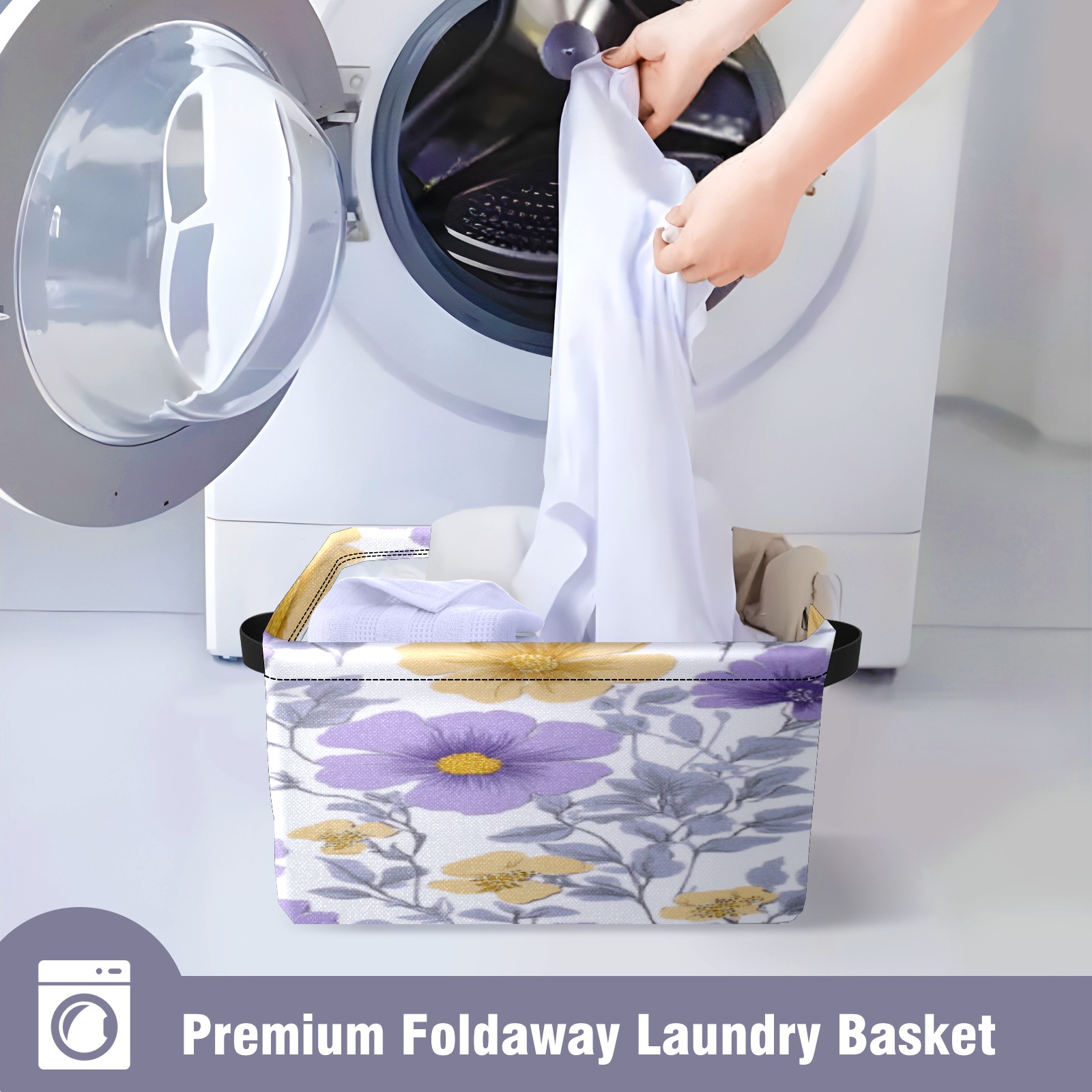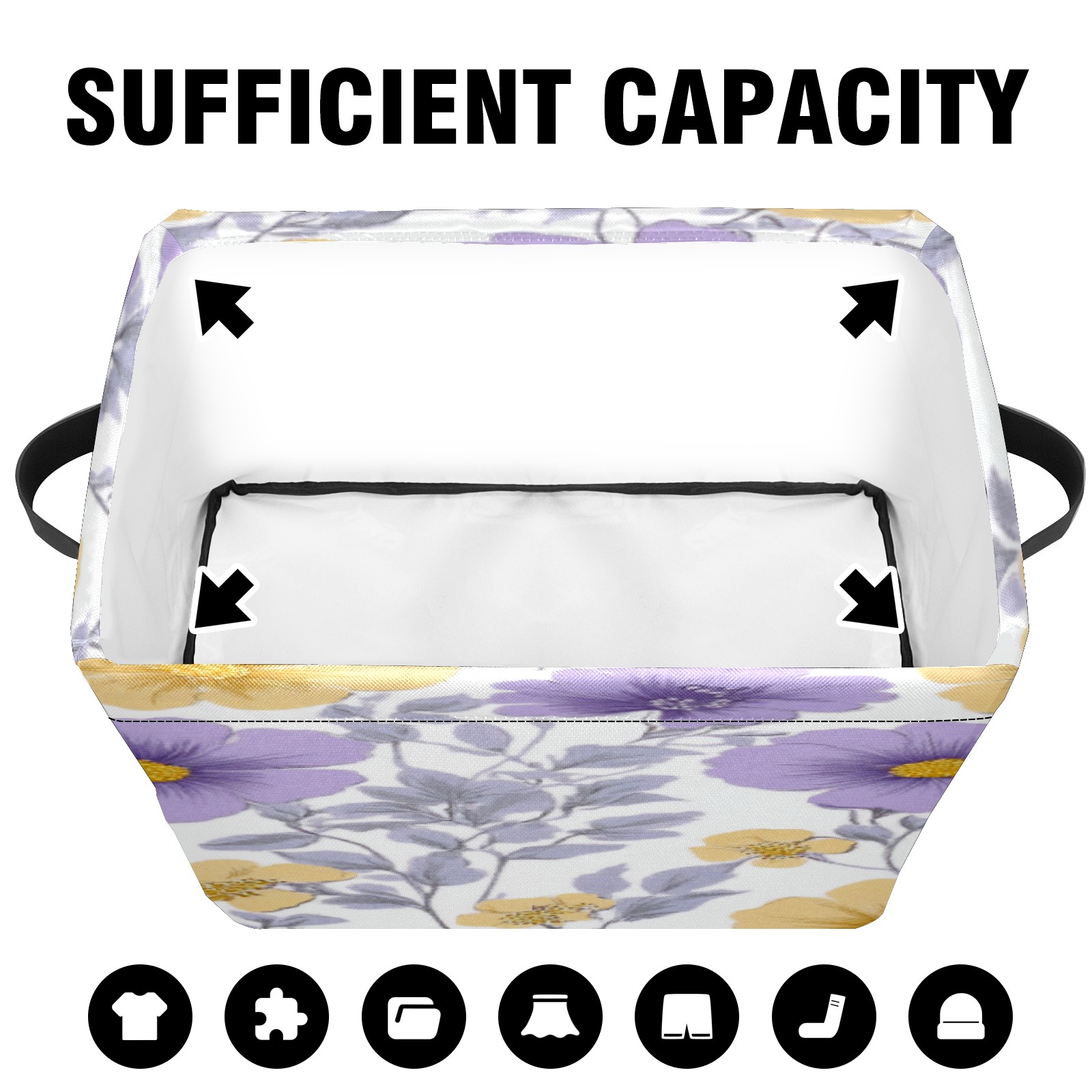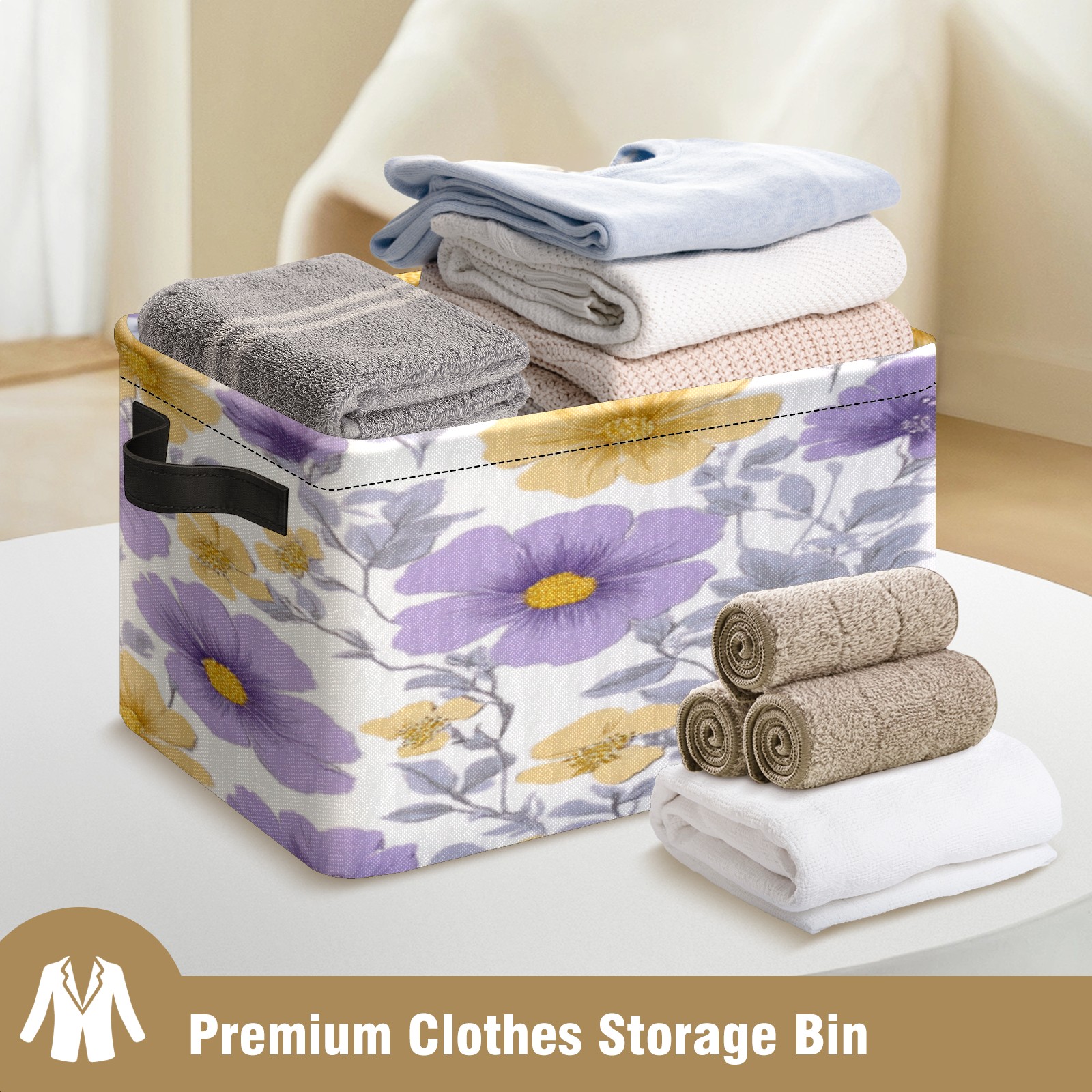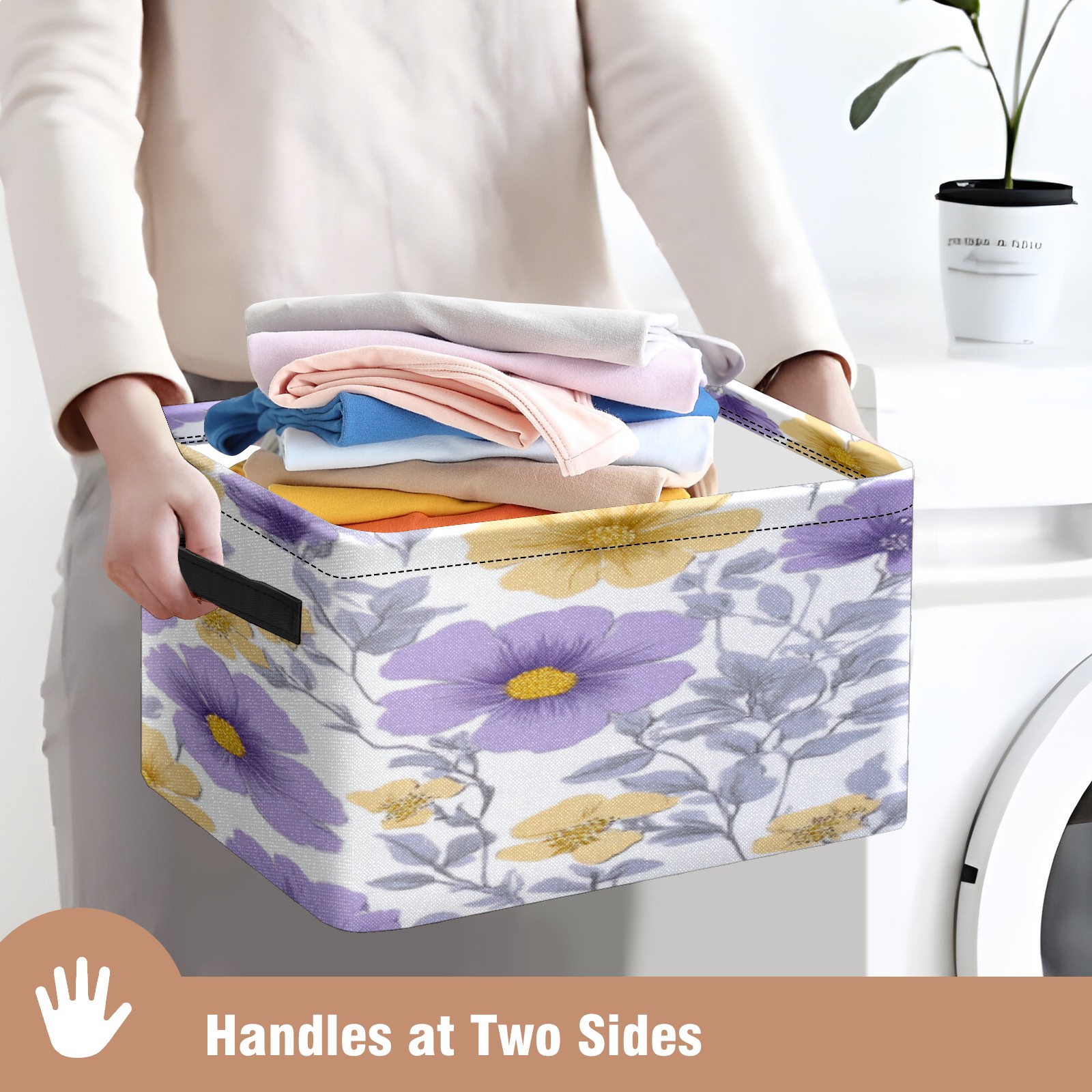 Foldable and Stackable Fabric Storage Basket for Home Organization with Handles, Decorative Closet Bins for Shelves, Laundry, and Toy Storage( Purple Yellow Flowers)