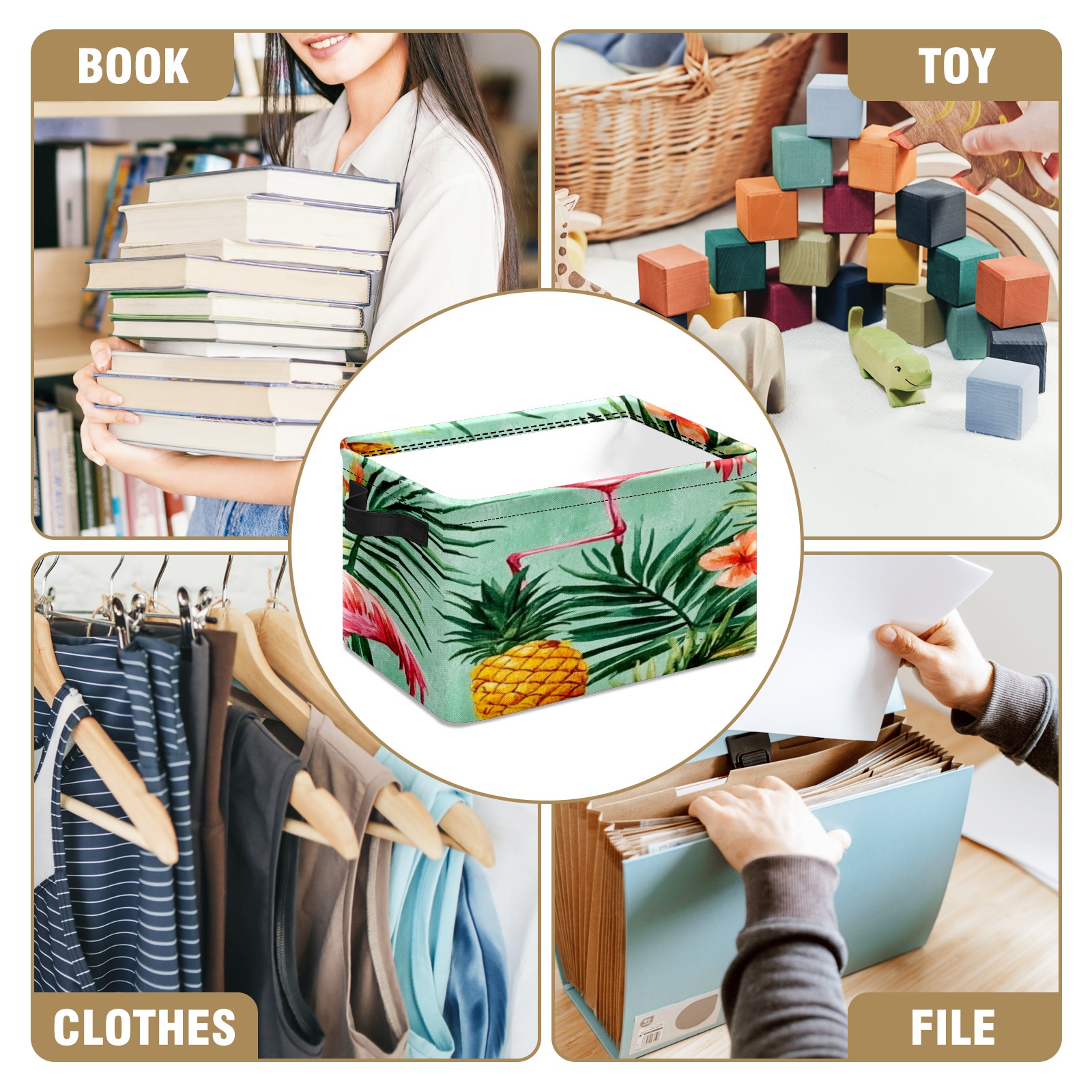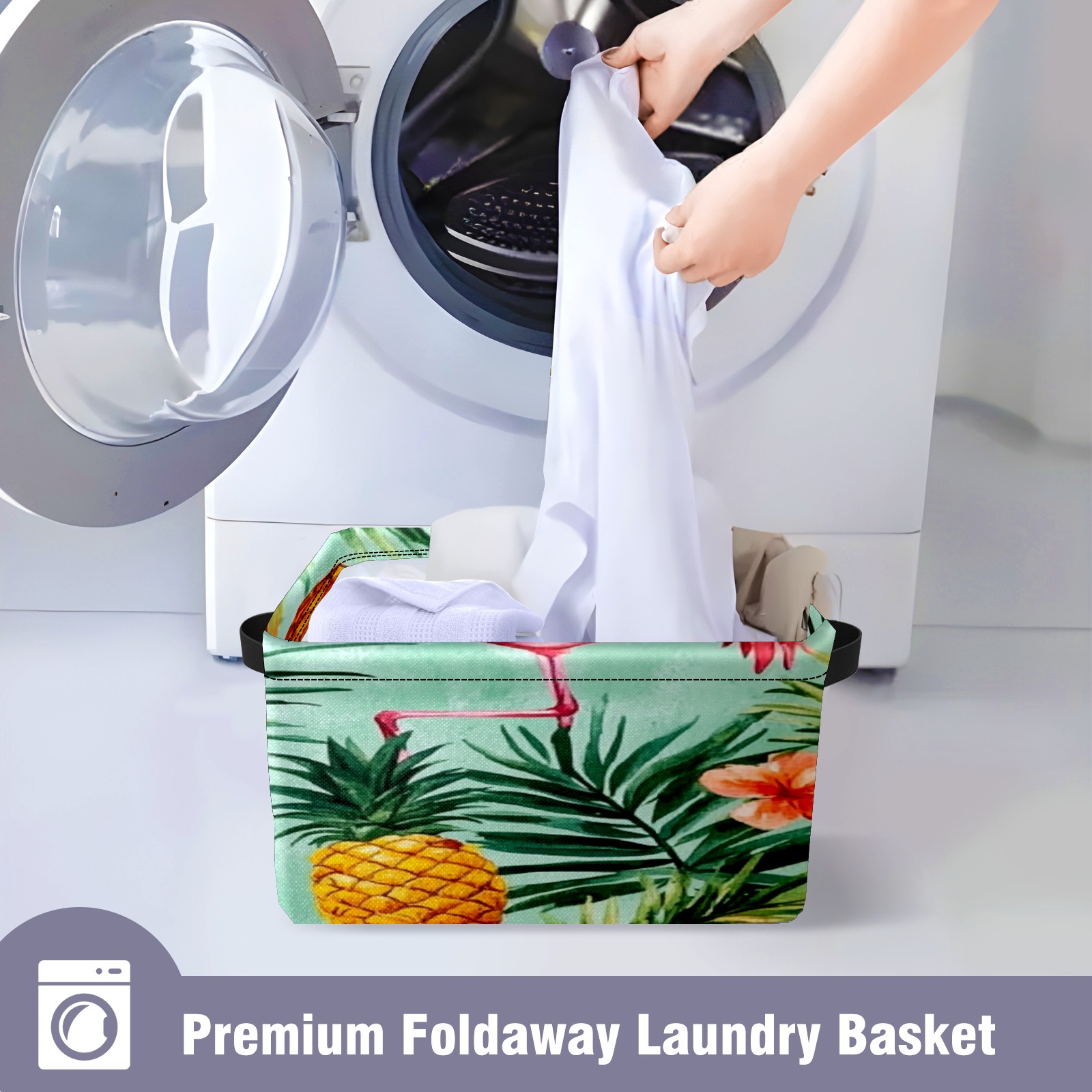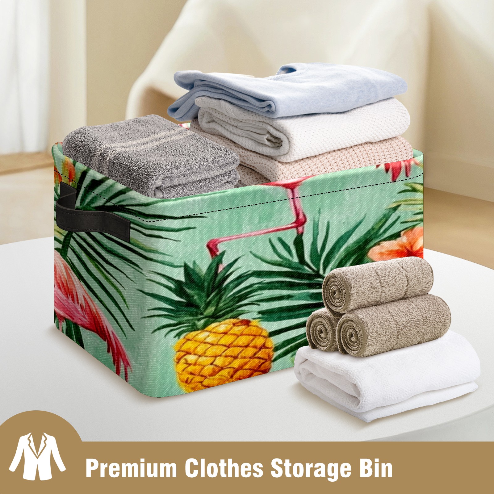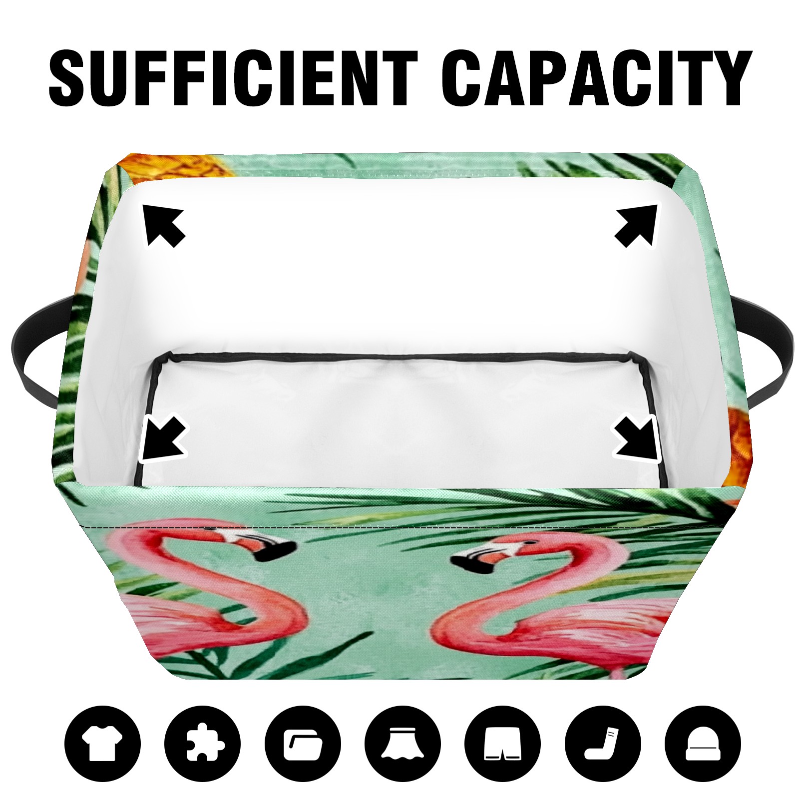Foldable and Stackable Fabric Storage Basket for Home Organization with Handles, Decorative Closet Bins for Shelves, Laundry, and Toy Storage( Watercolor Pink Flamingos Pineapples)