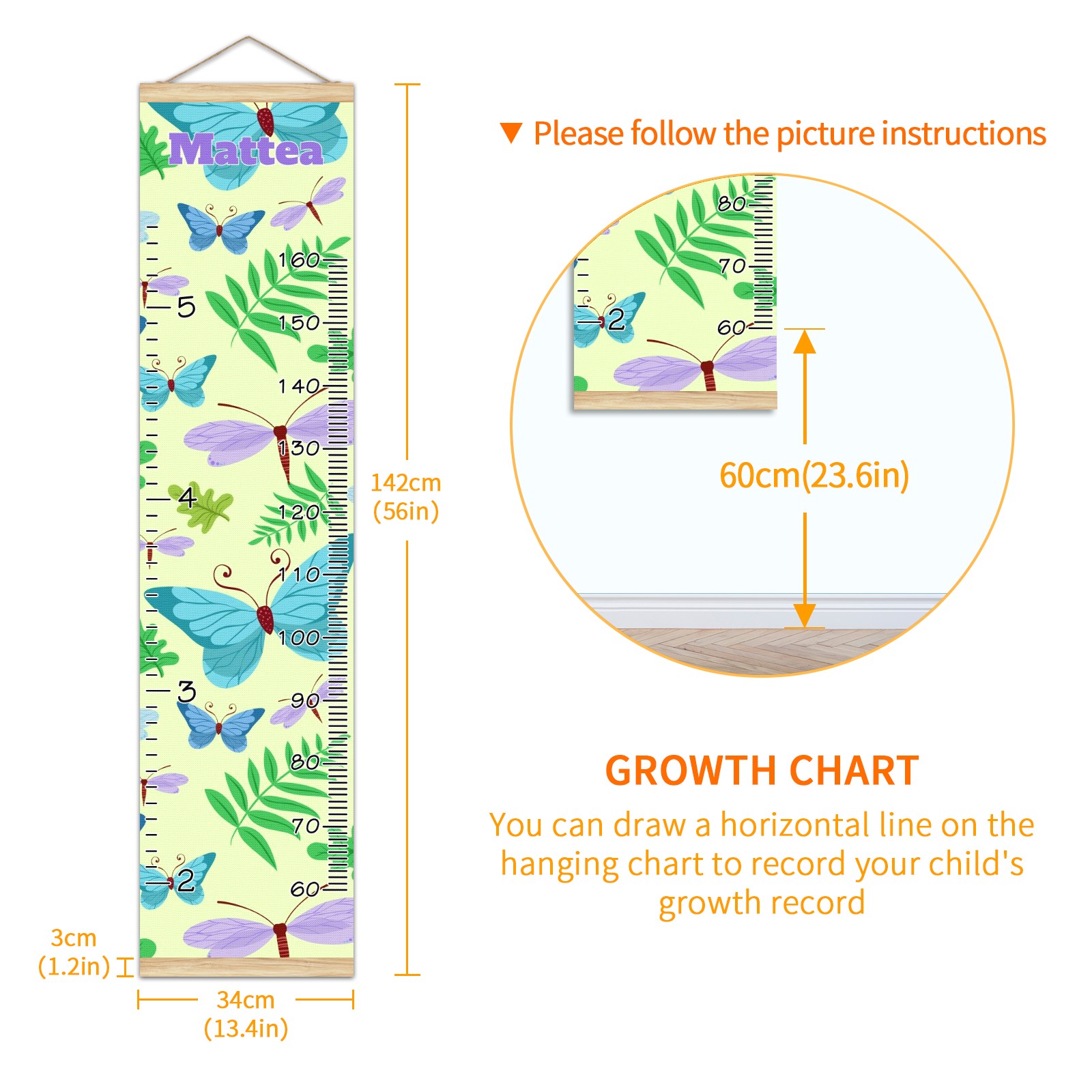 <p><b>Features:</b></p> <p>Rope for Hanging</p> <p>Material: Linen + Wood</p> <p>Dimensions: 13.4x56 inches</p> <p>Package Included: 1 * Baby Growth Chart</p> <p><b>Baby height growth chart can be used anywhere</b></p> <p>Ideal for kids nursery decoration, kids bedroom, interior walls or windows, playroom, living room, homedecoration.Add name and make the growth chart special!</p> <p><b>Easy to fold and carry</b></p> <p>With rope at the top of the growth chart, it is easy to install and remove.You can fold it and unfold any time any where.</p> <p><b>Perfect Gift Idea for Kids</b></p> <p>Environmental and non-toxic for kids use, it must be a perfect gift for baby, kids, girls, and boys.This is a best choice for your friend who have kids or baby as a popular gift.</p> <p><b>Easy to read</b></p> <p>Measurement accrate with 2 scales, Centimeters and feet. The letters are big enough, very easy to read.</p> <p><b>60cm(23.6inch) Over Ground Design</b></p> <p>Not only can protect from dust and other damage, but also will not interfere in floor cleaning.</p>