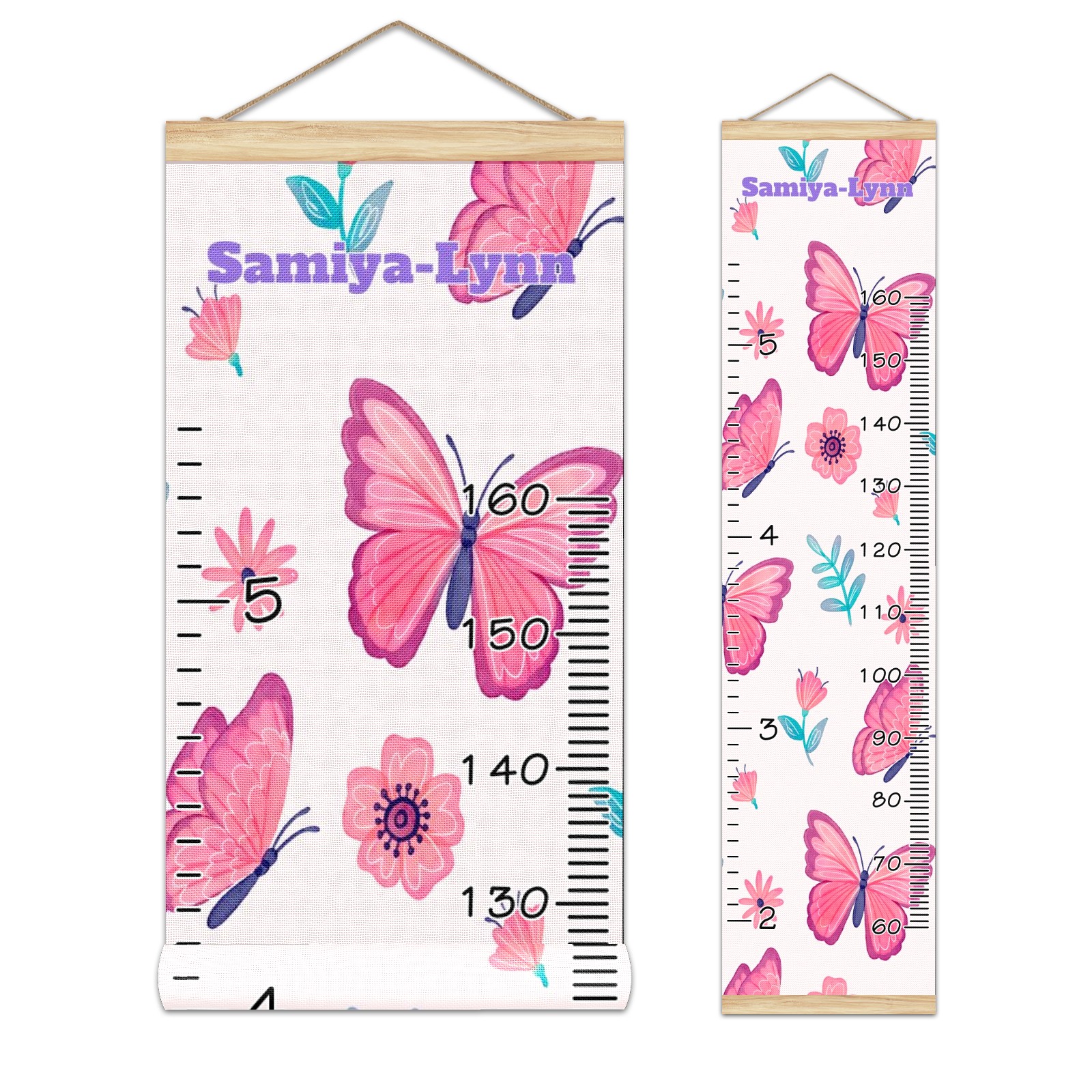 Personalized Kids Name Growth Chart Ruler for Wall Wood Frame Canvas Height Measure Chart 13.4x56 in Hanging Growth Chart Pink Butterfly & Flower10.27-1 Boys Girls Room Decor