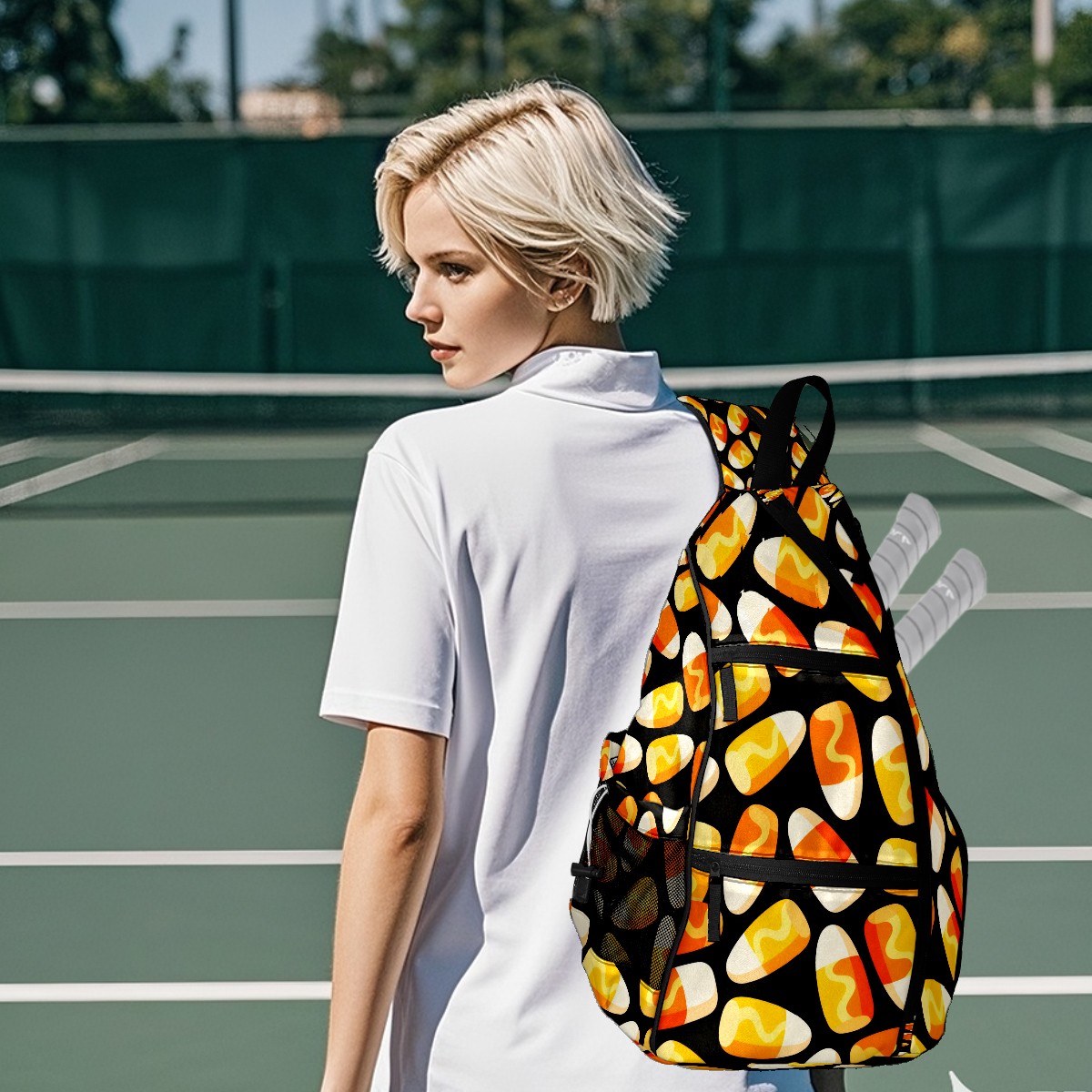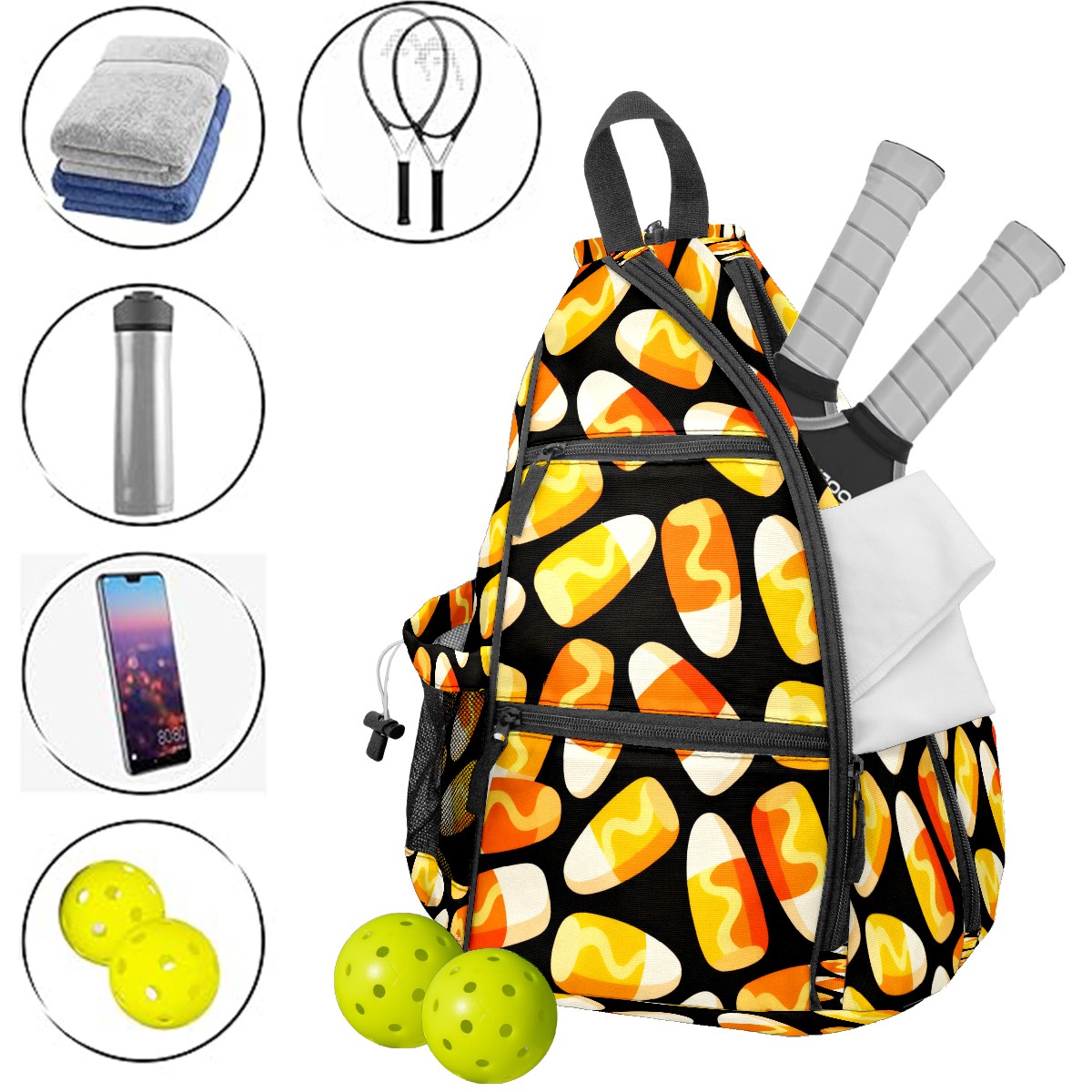 Pickleball Sling Bag for Women and Men - Backpack with Nylon Fabric/Woven Strap/Mesh Pocket/Fence Hook/Large Capacity/Adjustable Sling Bag Delicious Candy