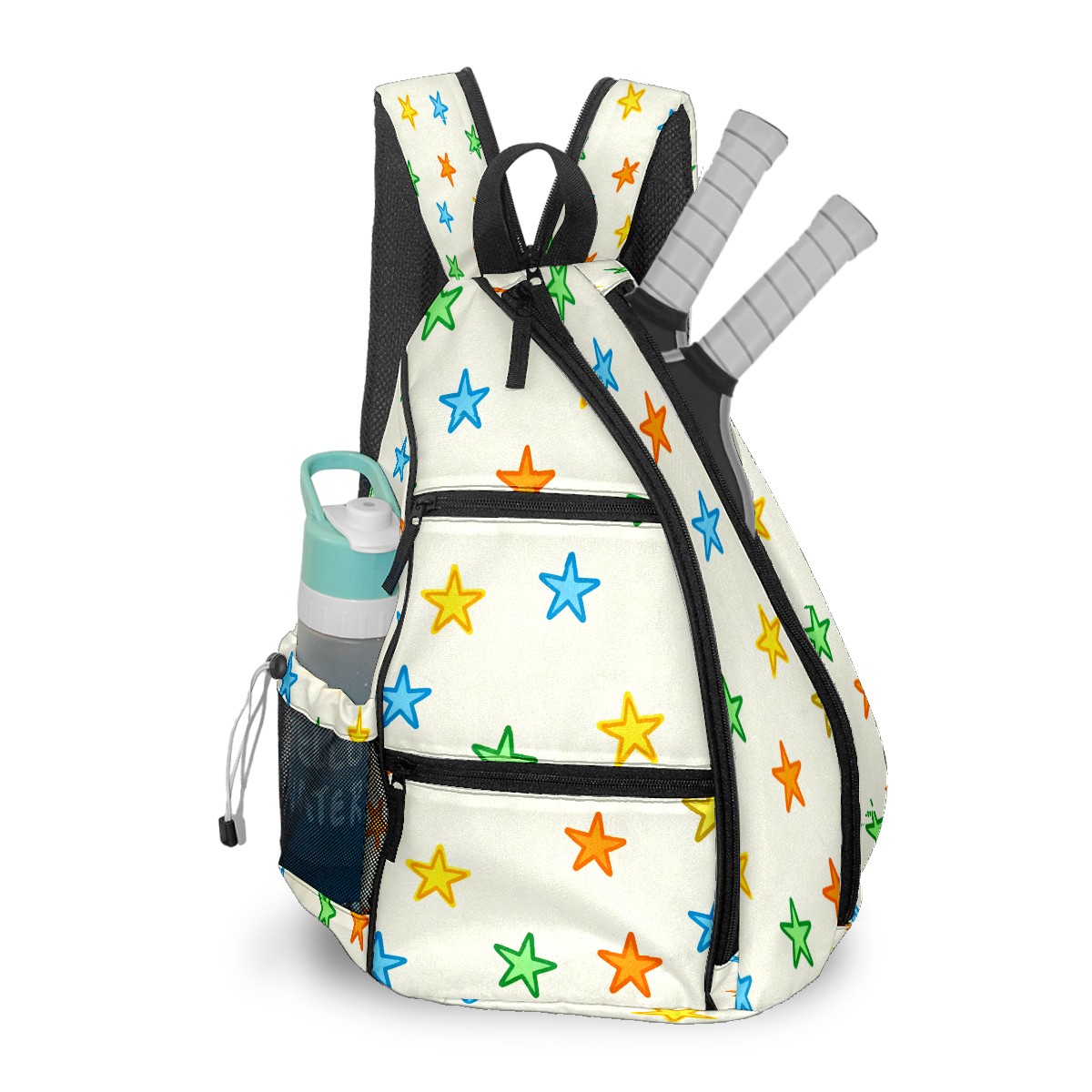 Pickleball Sling Bag for Women and Men - Backpack with Nylon Fabric/Woven Strap/Mesh Pocket/Fence Hook/Large Capacity/Adjustable Sling Bag Colorful Star