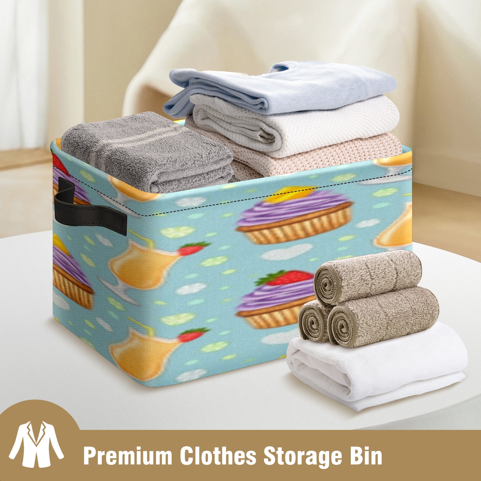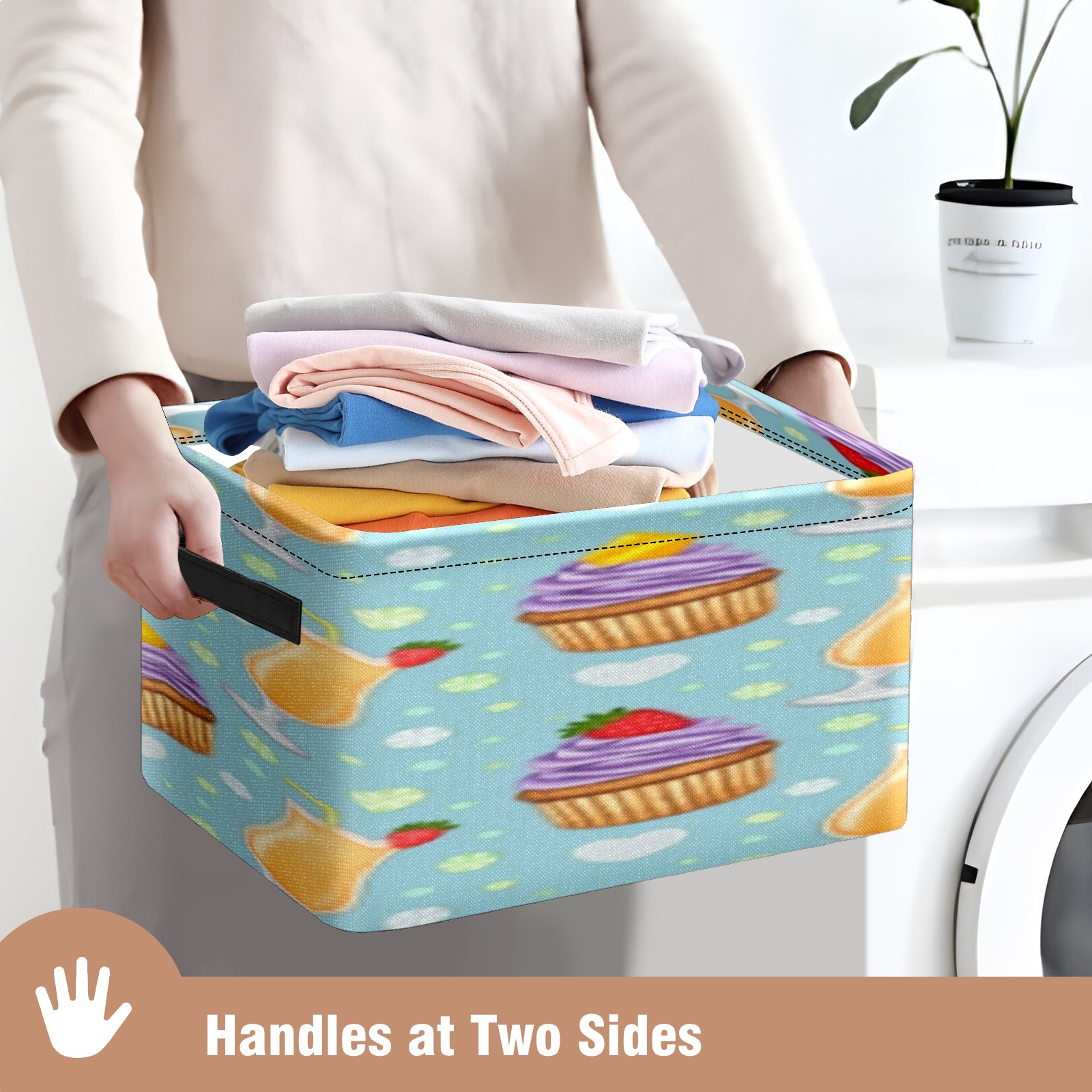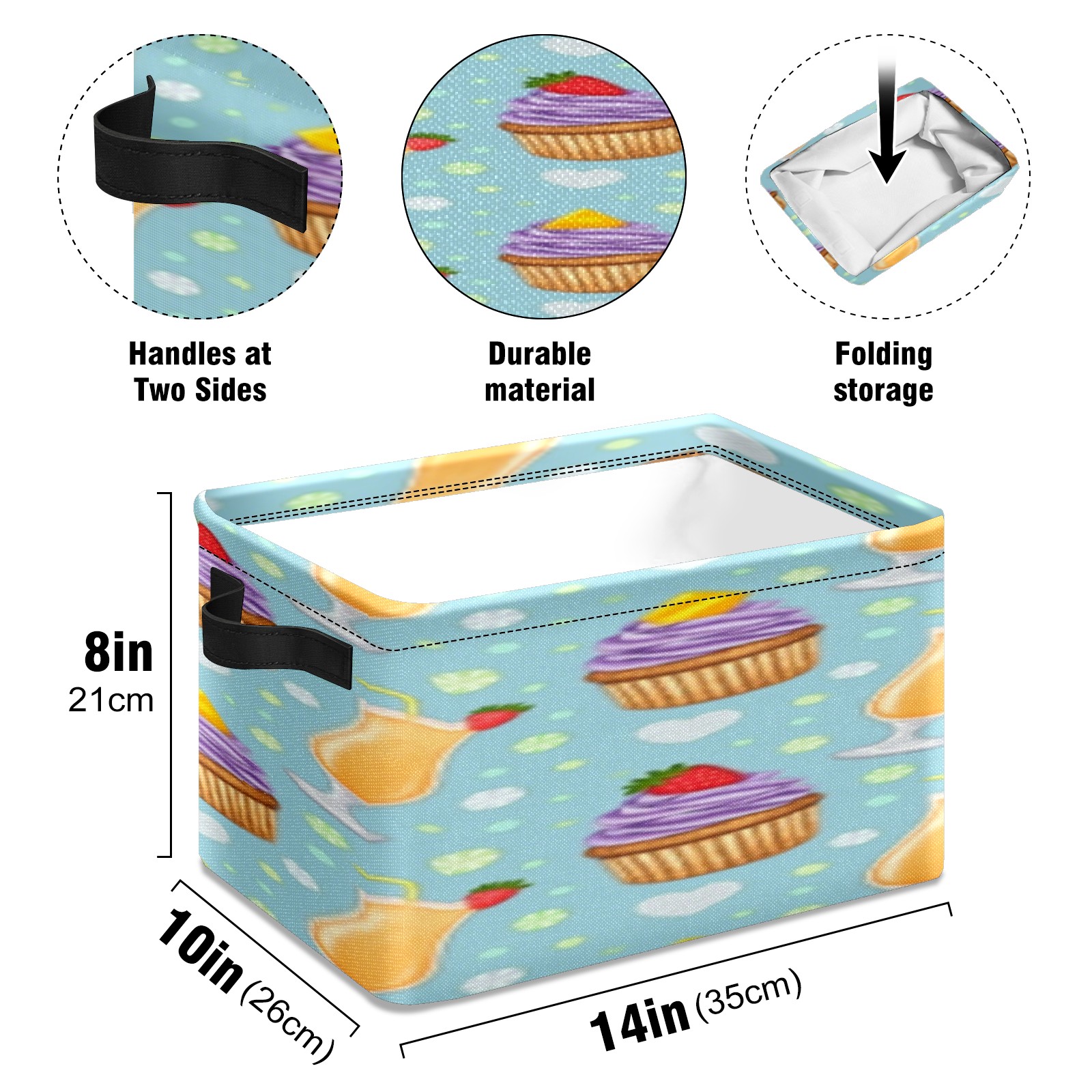 Foldable and Stackable Fabric Storage Basket for Home Organization with Handles, Decorative Closet Bins for Shelves, Laundry, and Toy Storage( Juice And Cupcake)