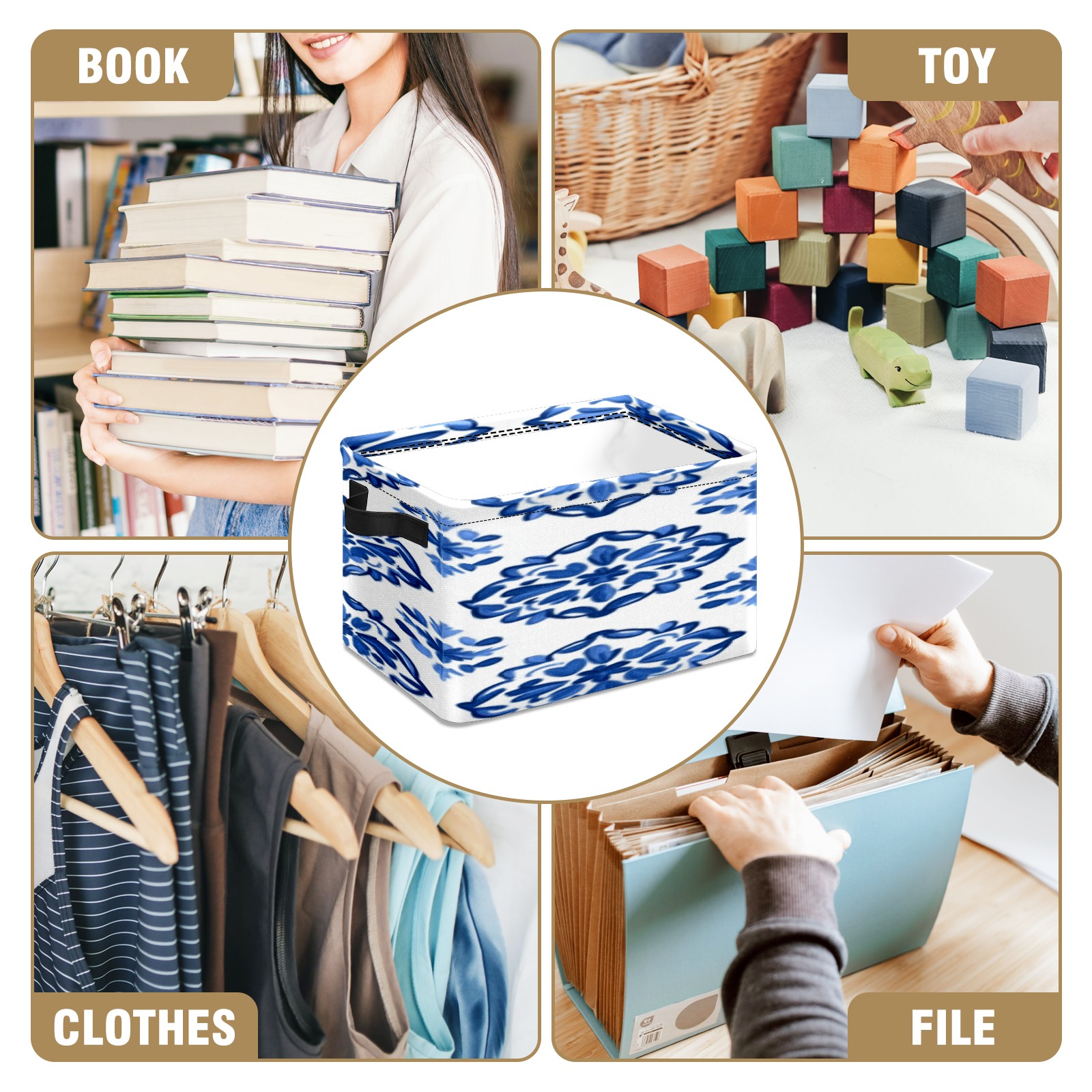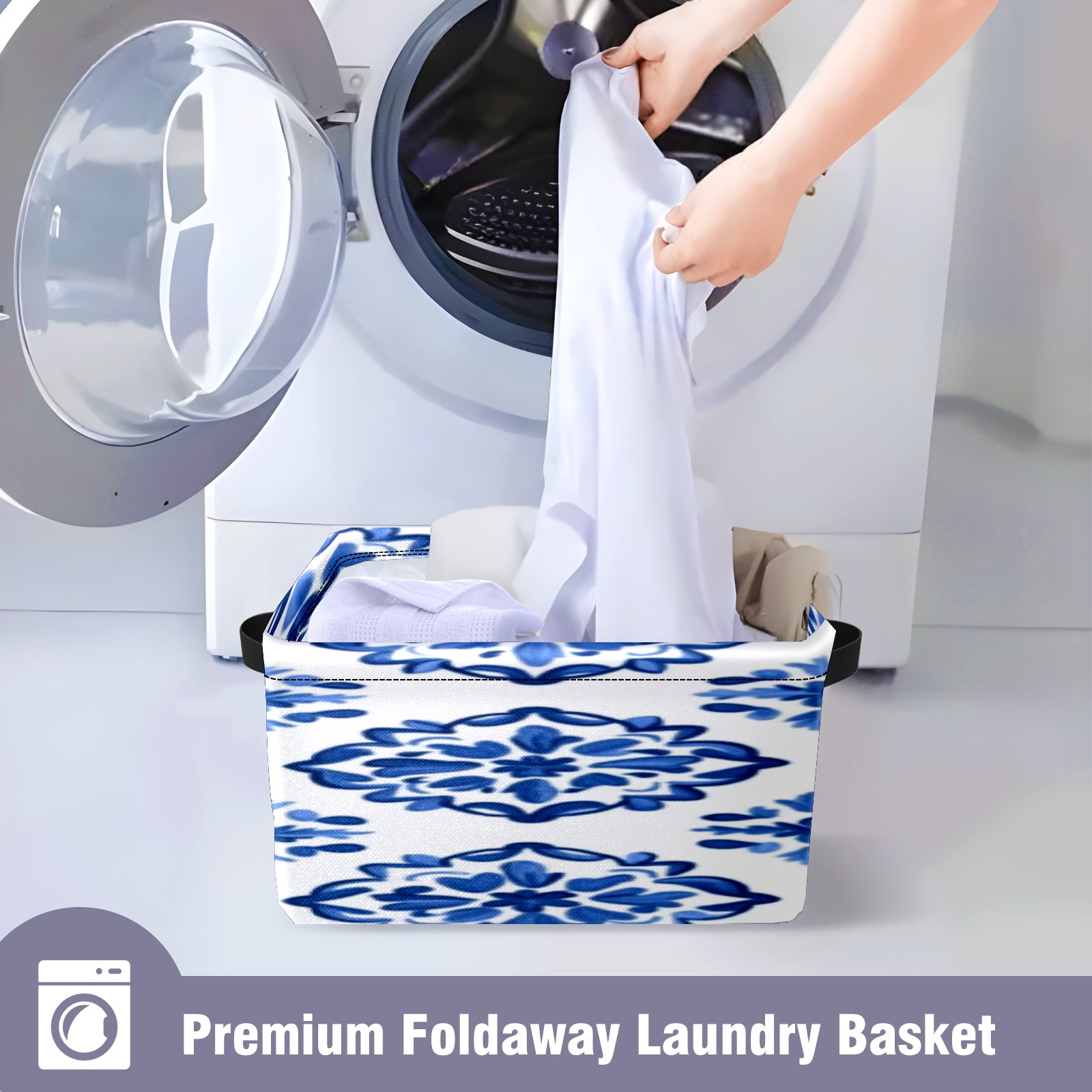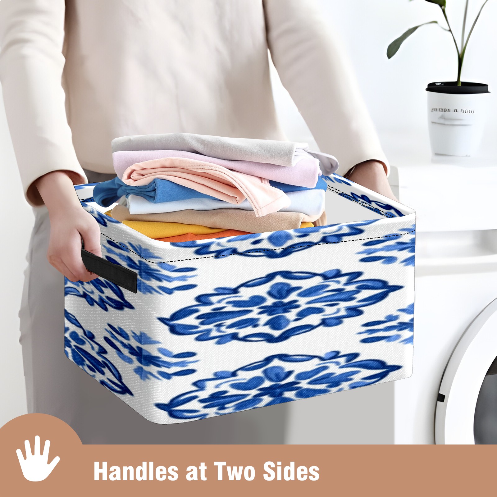 Foldable and Stackable Fabric Storage Basket for Home Organization with Handles, Decorative Closet Bins for Shelves, Laundry, and Toy Storage( Blue And White Tile)