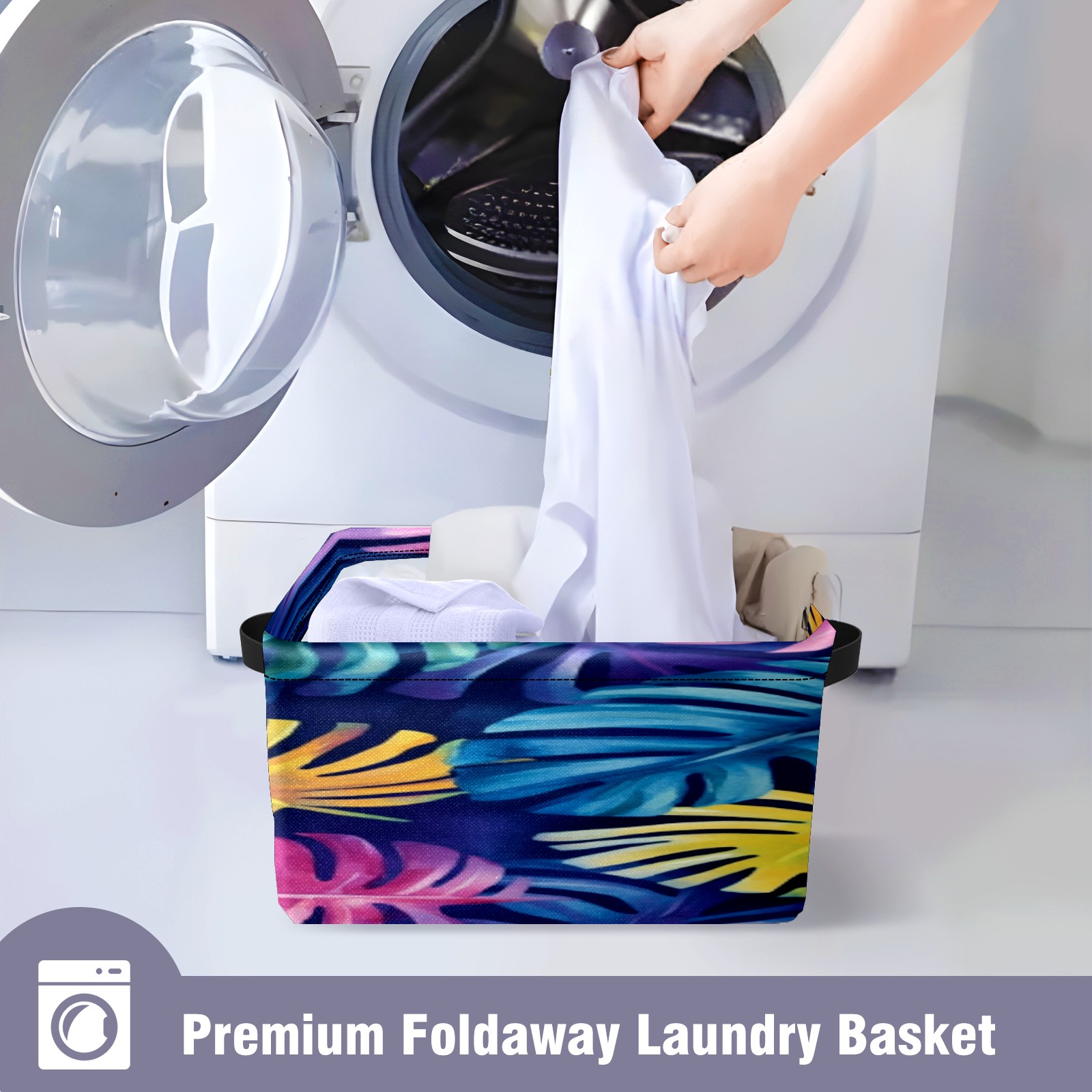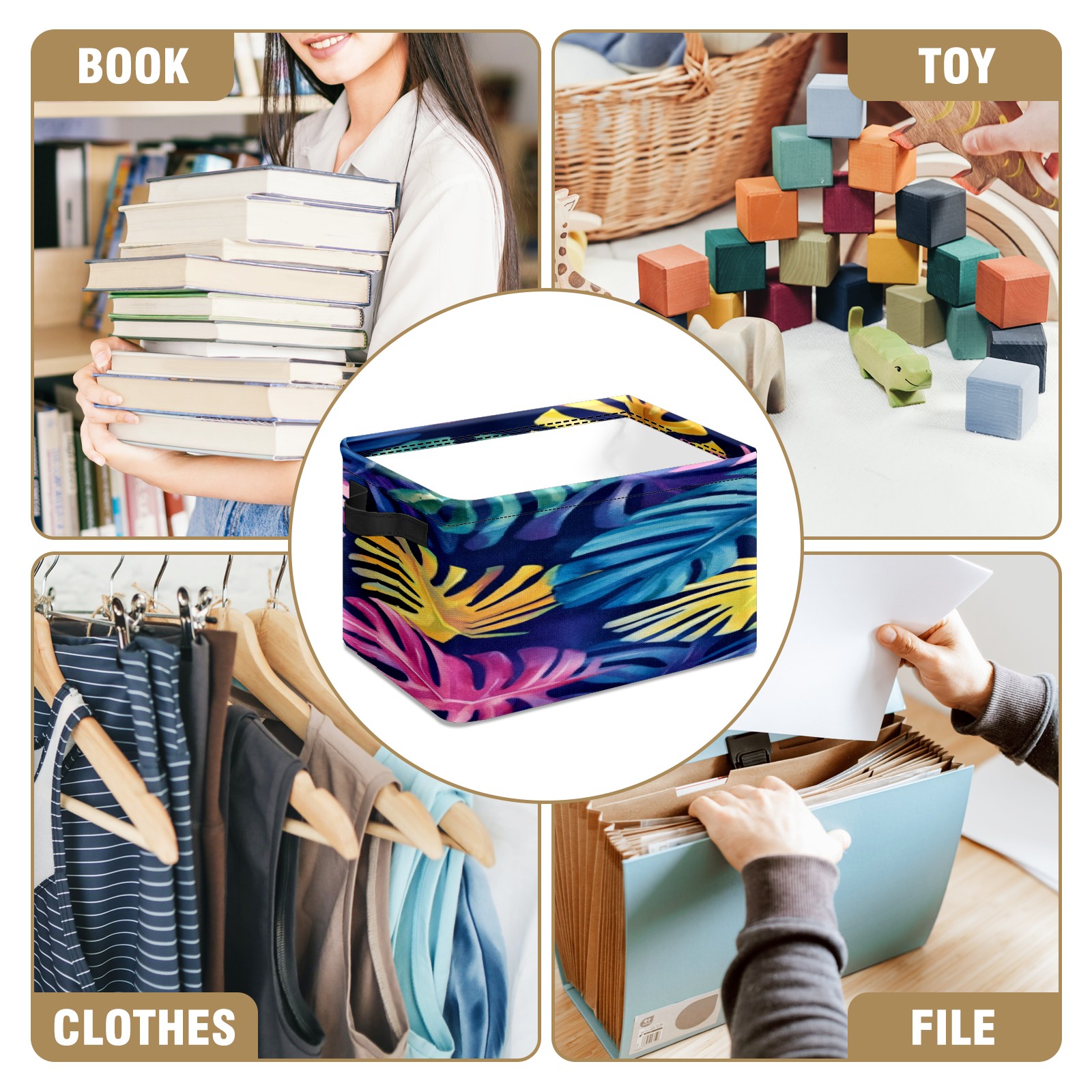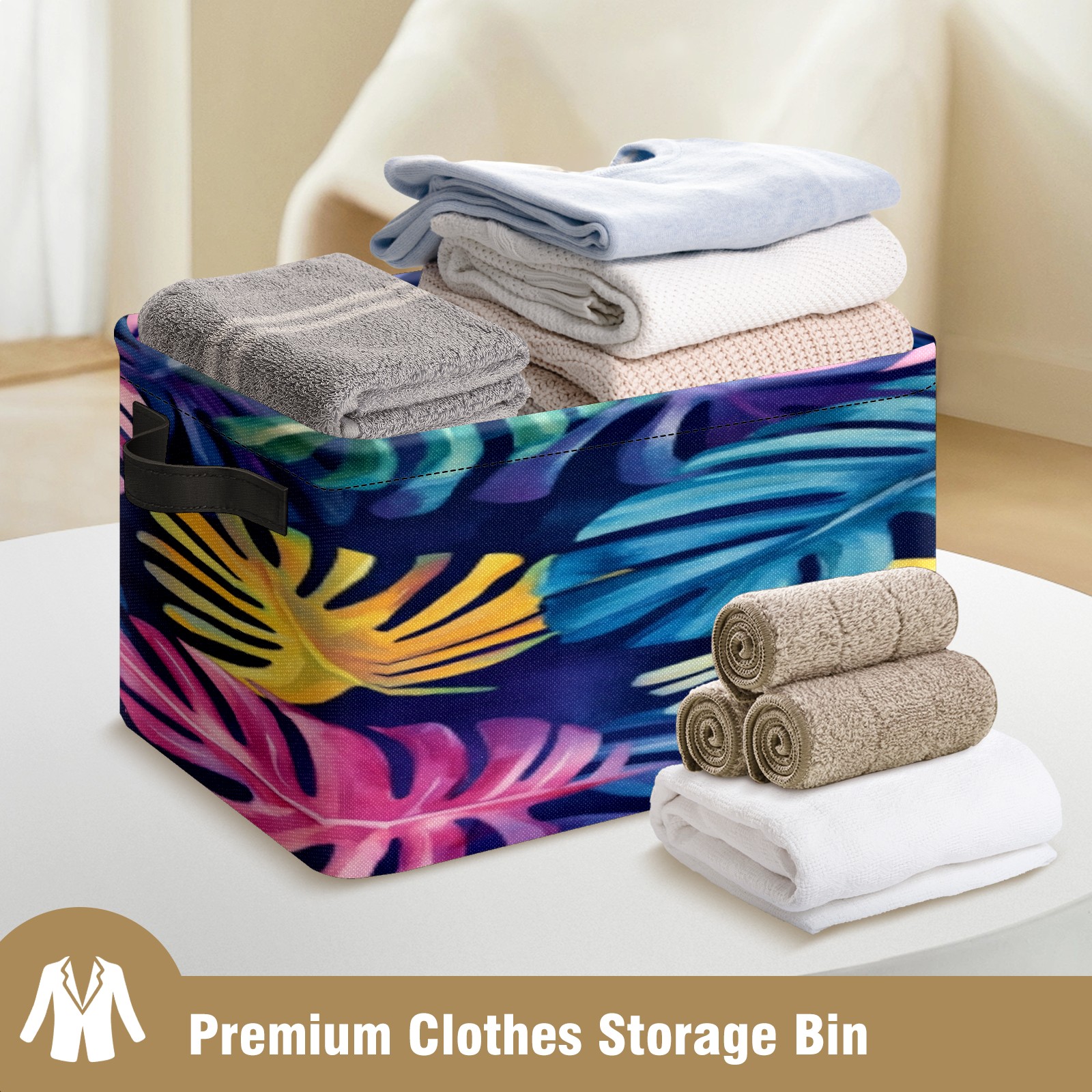 Foldable and Stackable Fabric Storage Basket for Home Organization with Handles, Decorative Closet Bins for Shelves, Laundry, and Toy Storage( Watercolor Tropical Leaves)