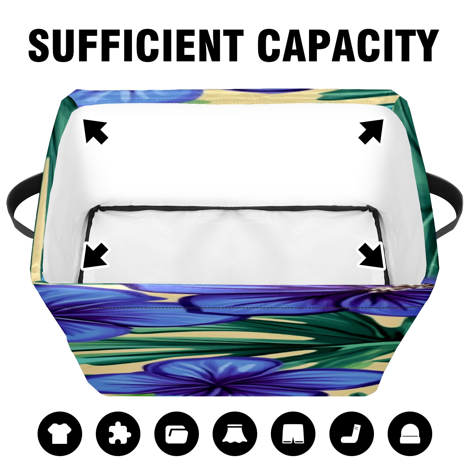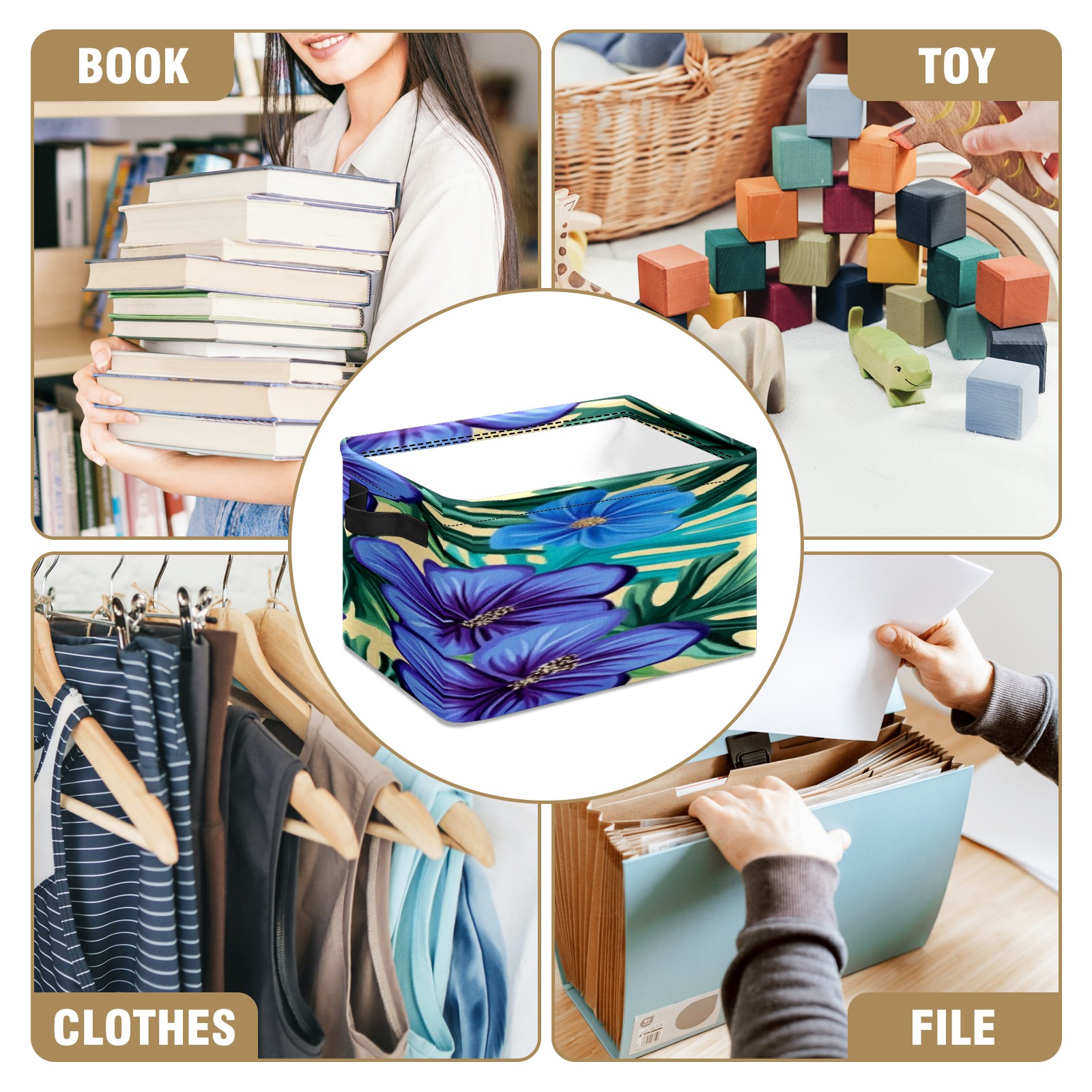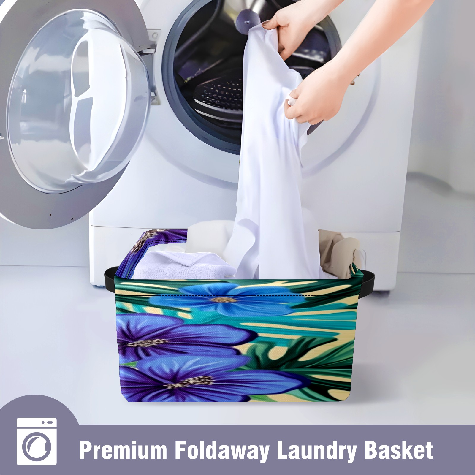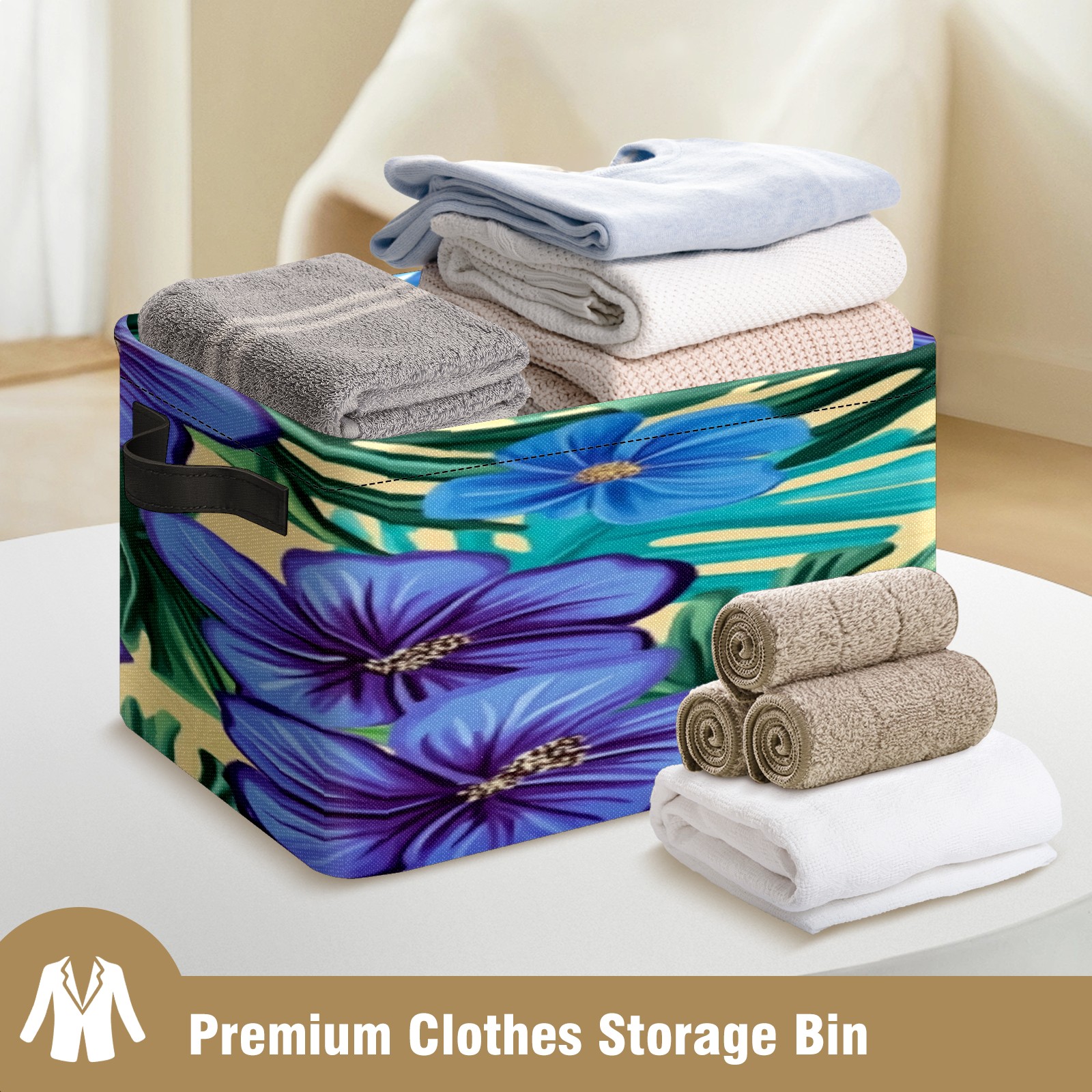 Foldable and Stackable Fabric Storage Basket for Home Organization with Handles, Decorative Closet Bins for Shelves, Laundry, and Toy Storage( Blue Hibiscus Flowers)