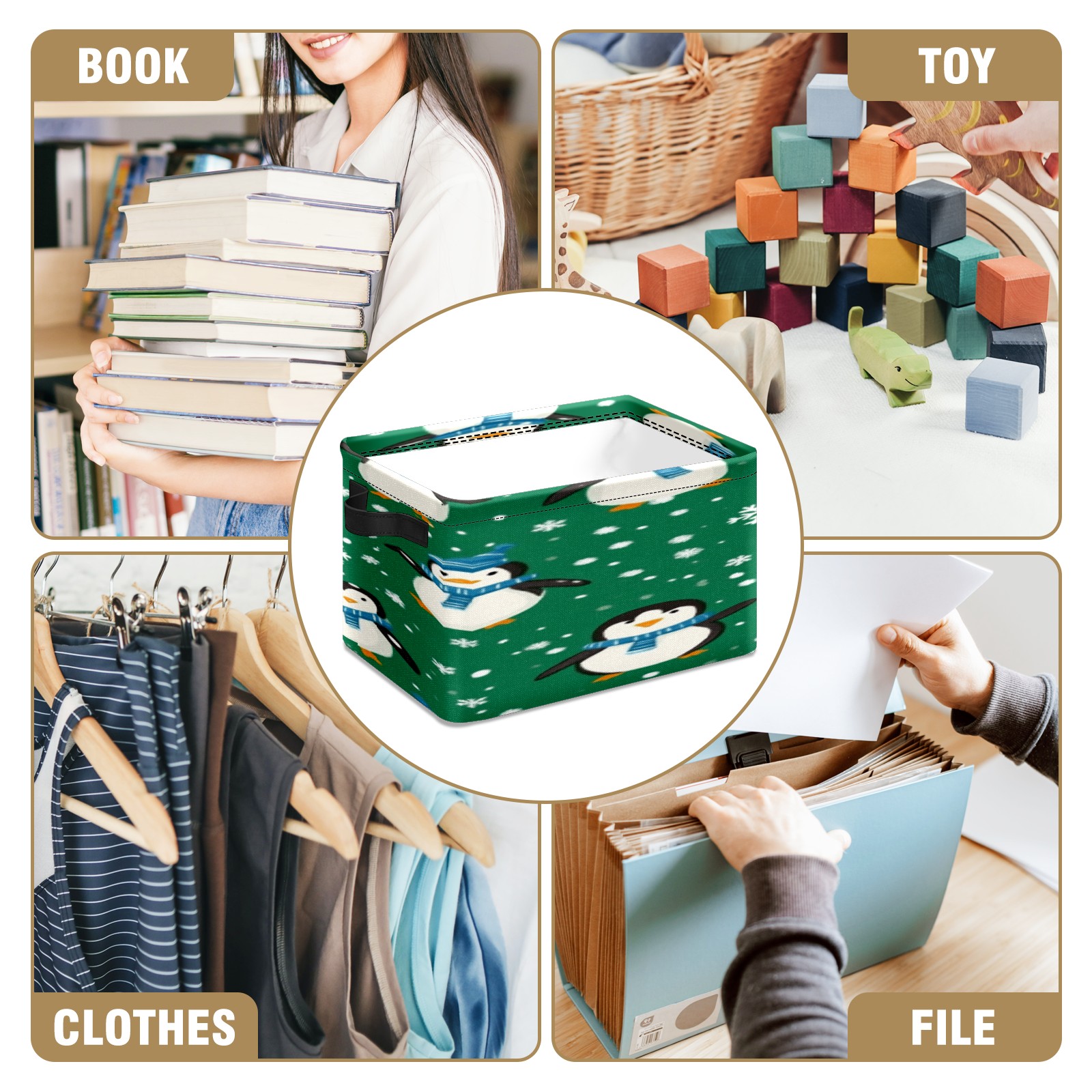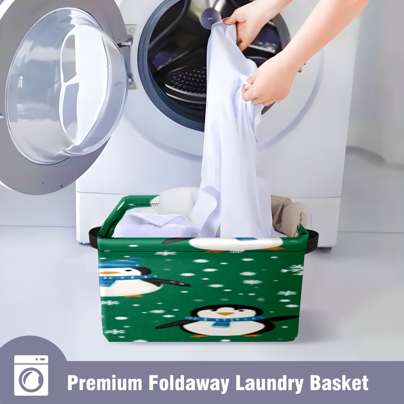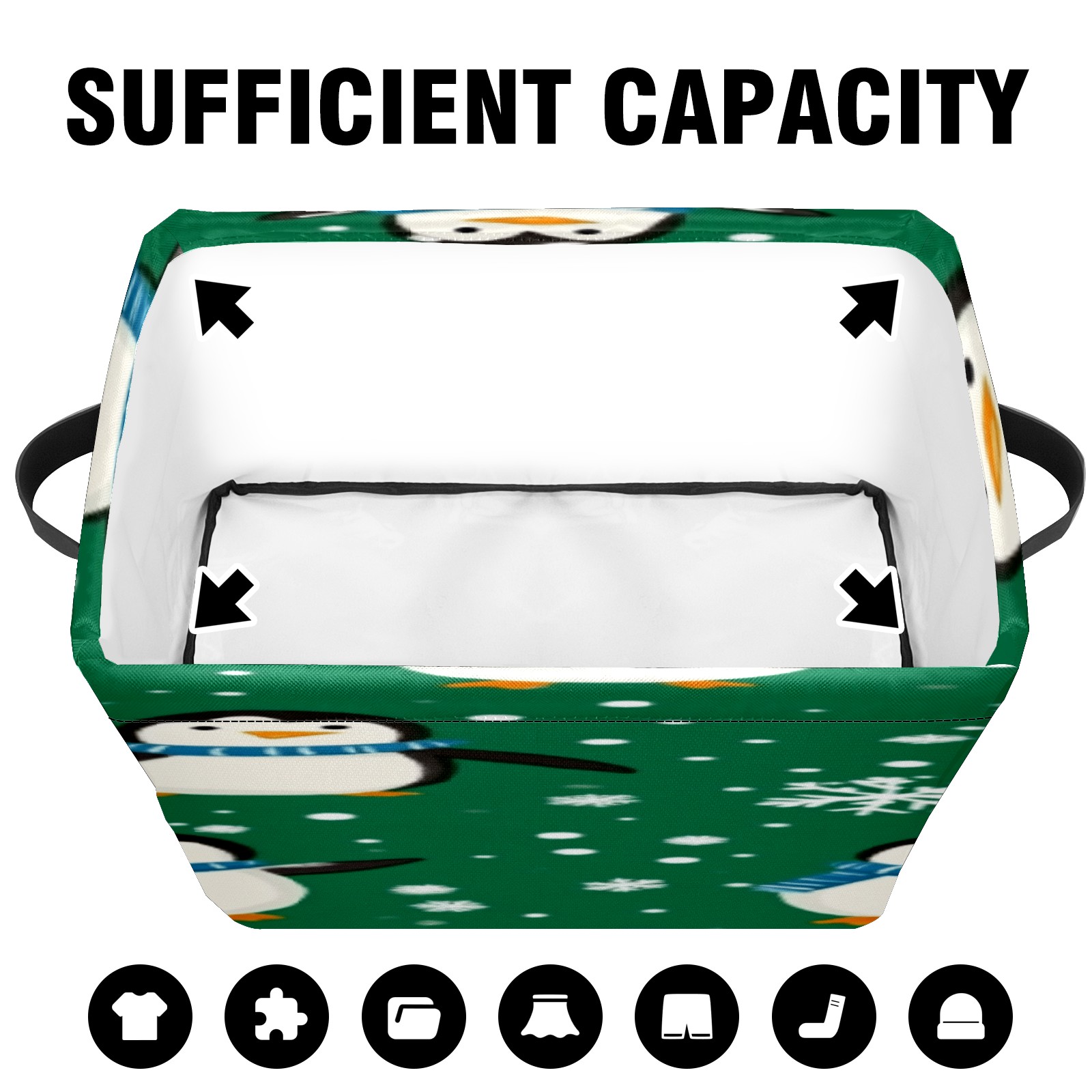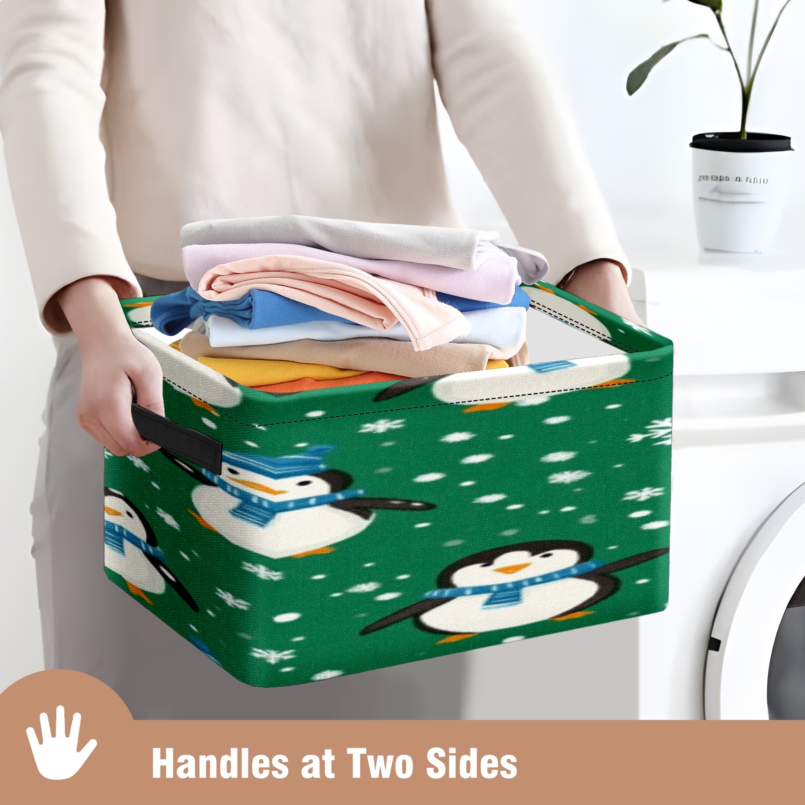Foldable and Stackable Fabric Storage Basket for Home Organization with Handles, Decorative Closet Bins for Shelves, Laundry, and Toy Storage( Penguins And Snowmen)