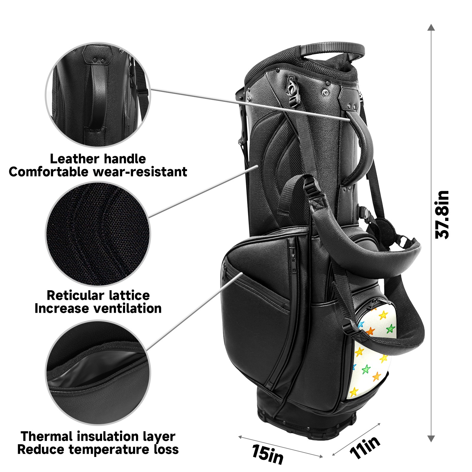 • <p>This golf bag combines versatility, durability, and quality, providing comprehensive protection and easy access for your golf clubs. Its precise dimensions of 130 x 37 x 31 cm (with rain cover) and 90 x 31 x 37 cm (without rain cover) strike the perfect balance between portability and storage capacity.The five-way head frame (with five-way top compartments) allows for strategic compartmentalization, allowing you to neatly organize your various clubs and separate them to protect them from bumps, scratches, and scuffs. Its versatile compartmental design features a spacious five-compartment structure, including a separate, full-size club compartment, to fully accommodate your clubs while protecting their integrity.This bag features a versatile storage system with multiple waterproof zippered pockets for securely storing golf accessories, as well as a dedicated insulated cooler pocket with excellent insulation to keep your drinks cold. The built-in rain cover effectively repels moisture, ensuring your clubs remain dry and protected even in wet weather. For enhanced carrying comfort, this bag features ergonomically designed, padded, breathable, adjustable shoulder straps and an adjustable chest strap to distribute shoulder pressure for easier and more comfortable carrying. A portable rear handle makes lifting and carrying easier.Quality is evident in every detail: double-stitched reinforced edges enhance structural stability, smooth and durable zippers ensure long-lasting reliability, and wear-resistant bottom rivets ensure secure placement on all terrains, effectively preventing wear and tear. Crafted from classic pebbled matte PU fabric, it perfectly complements both business and casual occasions. Available in black and white, it exudes understated elegance and sophistication.This golf bag, with its sturdy plastic base, combines premium quality and durability, making it the ideal companion for every golfer, whether heading to the course for a casual round or attending a business golf event.</p>