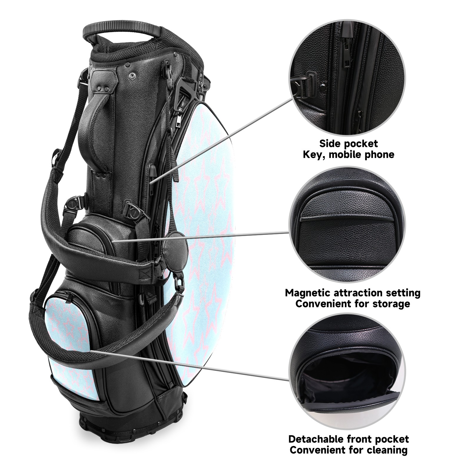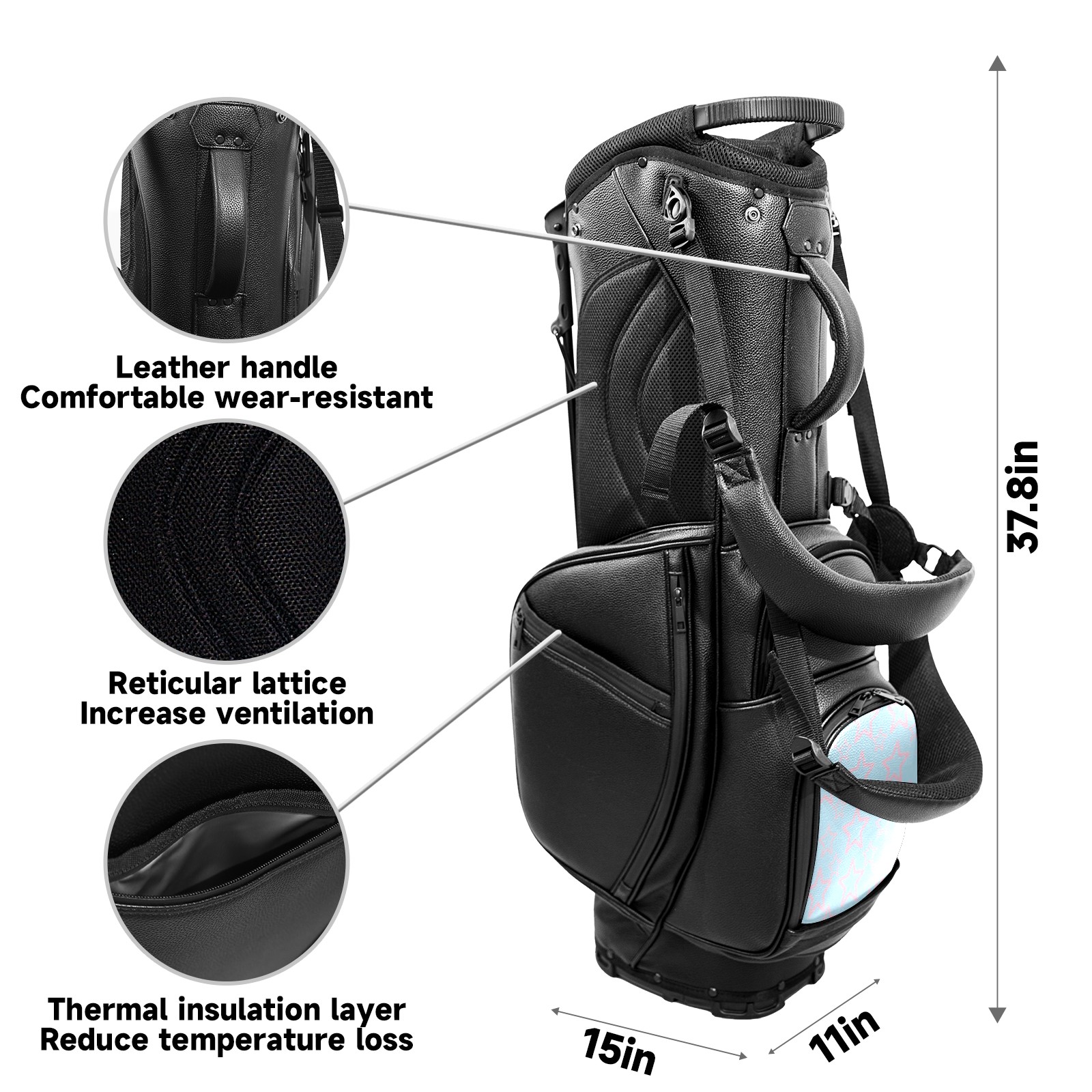 <p>This golf bag combines versatility, durability, and quality, providing comprehensive protection and easy access for your golf clubs. Its precise dimensions of 130 x 37 x 31 cm (with rain cover) and 90 x 31 x 37 cm (without rain cover) strike the perfect balance between portability and storage capacity.The five-way head frame (with five-way top compartments) allows for strategic compartmentalization, allowing you to neatly organize your various clubs and separate them to protect them from bumps, scratches, and scuffs. Its versatile compartmental design features a spacious five-compartment structure, including a separate, full-size club compartment, to fully accommodate your clubs while protecting their integrity.This bag features a versatile storage system with multiple waterproof zippered pockets for securely storing golf accessories, as well as a dedicated insulated cooler pocket with excellent insulation to keep your drinks cold. The built-in rain cover effectively repels moisture, ensuring your clubs remain dry and protected even in wet weather. For enhanced carrying comfort, this bag features ergonomically designed, padded, breathable, adjustable shoulder straps and an adjustable chest strap to distribute shoulder pressure for easier and more comfortable carrying. A portable rear handle makes lifting and carrying easier.Quality is evident in every detail: double-stitched reinforced edges enhance structural stability, smooth and durable zippers ensure long-lasting reliability, and wear-resistant bottom rivets ensure secure placement on all terrains, effectively preventing wear and tear. Crafted from classic pebbled matte PU fabric, it perfectly complements both business and casual occasions. Available in black and white, it exudes understated elegance and sophistication.This golf bag, with its sturdy plastic base, combines premium quality and durability, making it the ideal companion for every golfer, whether heading to the course for a casual round or attending a business golf event.</p>