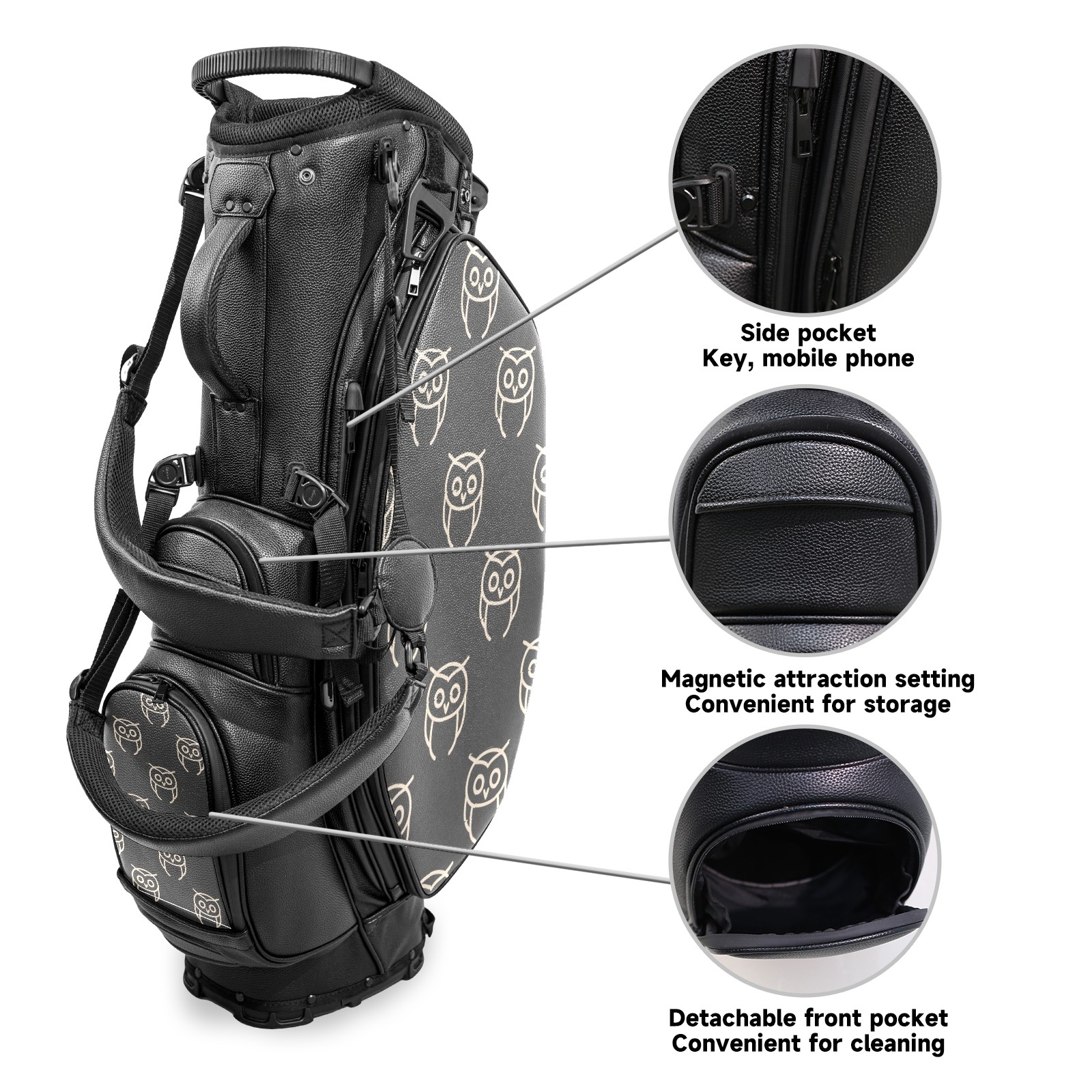 <p>This golf bag combines versatility, durability, and quality, providing comprehensive protection and easy access for your golf clubs. Its precise dimensions of 130 x 37 x 31 cm (with rain cover) and 90 x 31 x 37 cm (without rain cover) strike the perfect balance between portability and storage capacity.The five-way head frame (with five-way top compartments) allows for strategic compartmentalization, allowing you to neatly organize your various clubs and separate them to protect them from bumps, scratches, and scuffs. Its versatile compartmental design features a spacious five-compartment structure, including a separate, full-size club compartment, to fully accommodate your clubs while protecting their integrity.This bag features a versatile storage system with multiple waterproof zippered pockets for securely storing golf accessories, as well as a dedicated insulated cooler pocket with excellent insulation to keep your drinks cold. The built-in rain cover effectively repels moisture, ensuring your clubs remain dry and protected even in wet weather. For enhanced carrying comfort, this bag features ergonomically designed, padded, breathable, adjustable shoulder straps and an adjustable chest strap to distribute shoulder pressure for easier and more comfortable carrying. A portable rear handle makes lifting and carrying easier.Quality is evident in every detail: double-stitched reinforced edges enhance structural stability, smooth and durable zippers ensure long-lasting reliability, and wear-resistant bottom rivets ensure secure placement on all terrains, effectively preventing wear and tear. Crafted from classic pebbled matte PU fabric, it perfectly complements both business and casual occasions. Available in black and white, it exudes understated elegance and sophistication.This golf bag, with its sturdy plastic base, combines premium quality and durability, making it the ideal companion for every golfer, whether heading to the course for a casual round or attending a business golf event.</p>