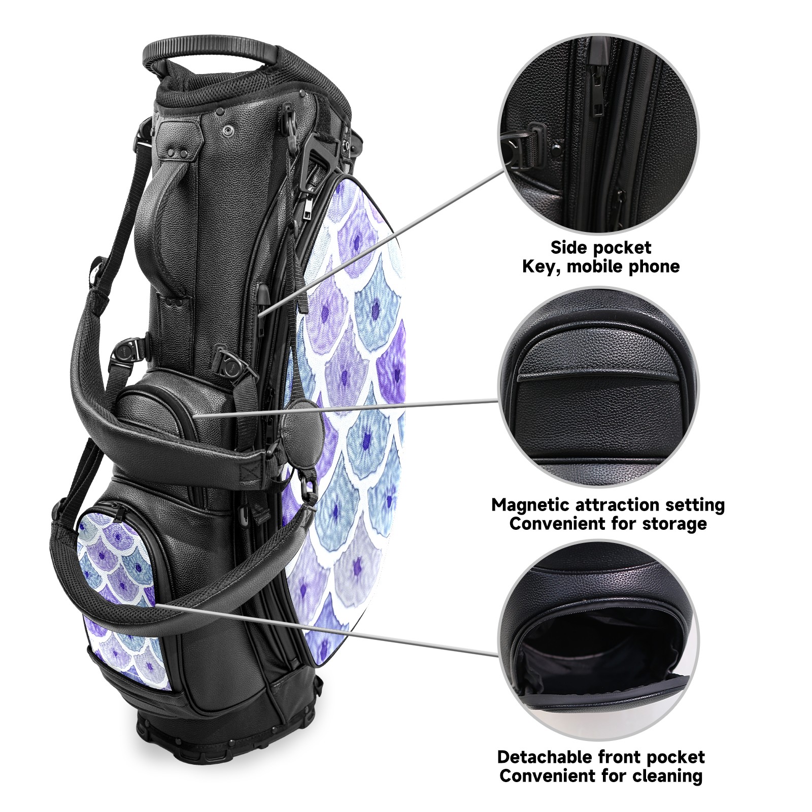 • <p>This golf bag combines versatility, durability, and quality, providing comprehensive protection and easy access for your golf clubs. Its precise dimensions of 130 x 37 x 31 cm (with rain cover) and 90 x 31 x 37 cm (without rain cover) strike the perfect balance between portability and storage capacity.The five-way head frame (with five-way top compartments) allows for strategic compartmentalization, allowing you to neatly organize your various clubs and separate them to protect them from bumps, scratches, and scuffs. Its versatile compartmental design features a spacious five-compartment structure, including a separate, full-size club compartment, to fully accommodate your clubs while protecting their integrity.This bag features a versatile storage system with multiple waterproof zippered pockets for securely storing golf accessories, as well as a dedicated insulated cooler pocket with excellent insulation to keep your drinks cold. The built-in rain cover effectively repels moisture, ensuring your clubs remain dry and protected even in wet weather. For enhanced carrying comfort, this bag features ergonomically designed, padded, breathable, adjustable shoulder straps and an adjustable chest strap to distribute shoulder pressure for easier and more comfortable carrying. A portable rear handle makes lifting and carrying easier.Quality is evident in every detail: double-stitched reinforced edges enhance structural stability, smooth and durable zippers ensure long-lasting reliability, and wear-resistant bottom rivets ensure secure placement on all terrains, effectively preventing wear and tear. Crafted from classic pebbled matte PU fabric, it perfectly complements both business and casual occasions. Available in black and white, it exudes understated elegance and sophistication.This golf bag, with its sturdy plastic base, combines premium quality and durability, making it the ideal companion for every golfer, whether heading to the course for a casual round or attending a business golf event.</p>