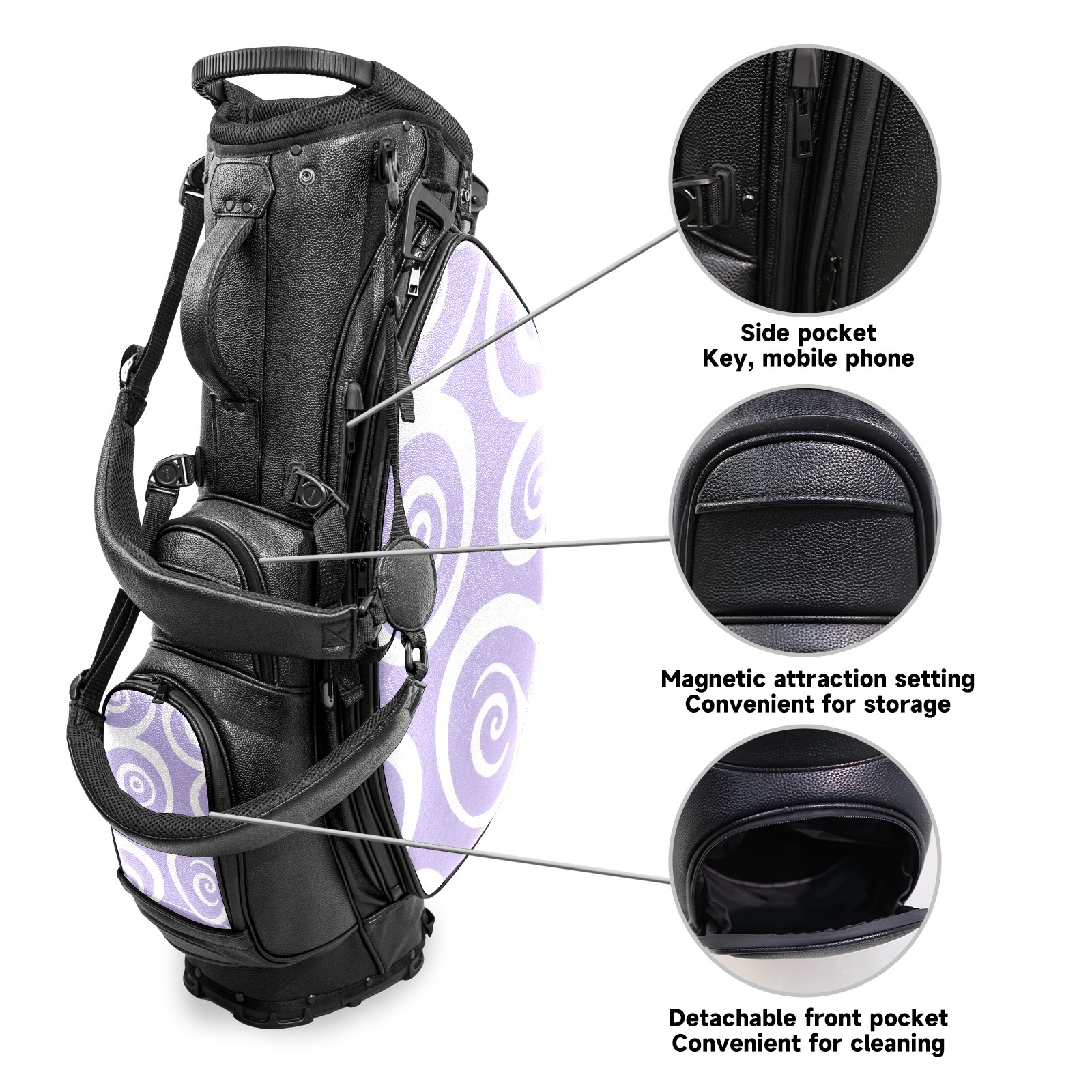 • <p>This golf bag combines versatility, durability, and quality, providing comprehensive protection and easy access for your golf clubs. Its precise dimensions of 130 x 37 x 31 cm (with rain cover) and 90 x 31 x 37 cm (without rain cover) strike the perfect balance between portability and storage capacity.The five-way head frame (with five-way top compartments) allows for strategic compartmentalization, allowing you to neatly organize your various clubs and separate them to protect them from bumps, scratches, and scuffs. Its versatile compartmental design features a spacious five-compartment structure, including a separate, full-size club compartment, to fully accommodate your clubs while protecting their integrity.This bag features a versatile storage system with multiple waterproof zippered pockets for securely storing golf accessories, as well as a dedicated insulated cooler pocket with excellent insulation to keep your drinks cold. The built-in rain cover effectively repels moisture, ensuring your clubs remain dry and protected even in wet weather. For enhanced carrying comfort, this bag features ergonomically designed, padded, breathable, adjustable shoulder straps and an adjustable chest strap to distribute shoulder pressure for easier and more comfortable carrying. A portable rear handle makes lifting and carrying easier.Quality is evident in every detail: double-stitched reinforced edges enhance structural stability, smooth and durable zippers ensure long-lasting reliability, and wear-resistant bottom rivets ensure secure placement on all terrains, effectively preventing wear and tear. Crafted from classic pebbled matte PU fabric, it perfectly complements both business and casual occasions. Available in black and white, it exudes understated elegance and sophistication.This golf bag, with its sturdy plastic base, combines premium quality and durability, making it the ideal companion for every golfer, whether heading to the course for a casual round or attending a business golf event.</p>