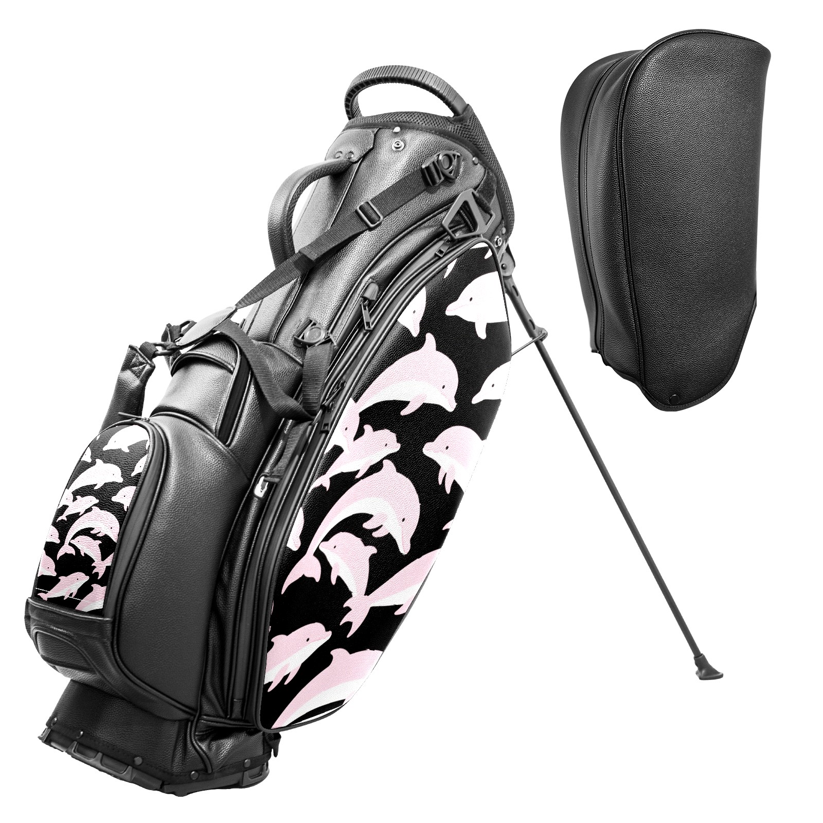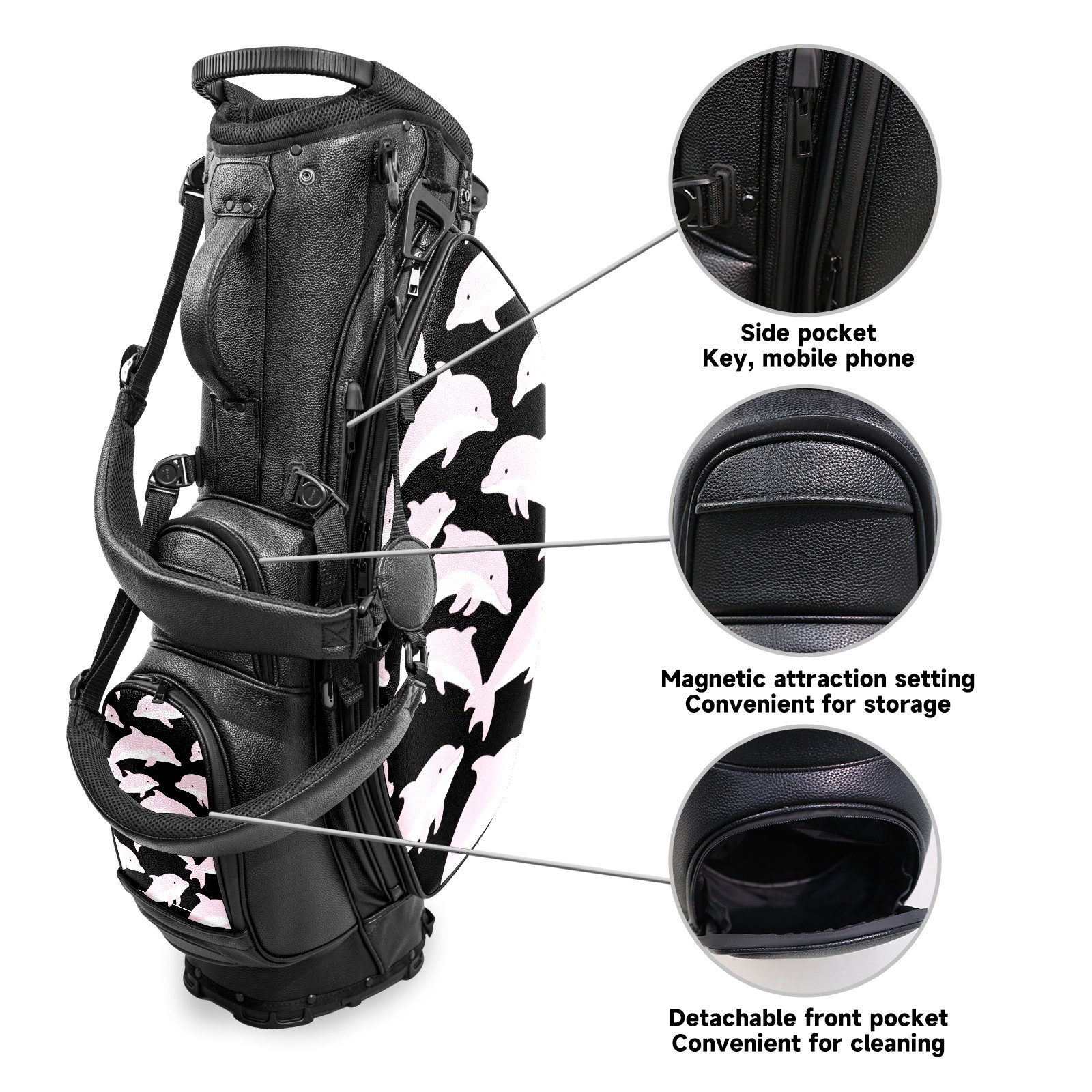• <p>This golf bag combines versatility, durability, and quality, providing comprehensive protection and easy access for your golf clubs. Its precise dimensions of 130 x 37 x 31 cm (with rain cover) and 90 x 31 x 37 cm (without rain cover) strike the perfect balance between portability and storage capacity.The five-way head frame (with five-way top compartments) allows for strategic compartmentalization, allowing you to neatly organize your various clubs and separate them to protect them from bumps, scratches, and scuffs. Its versatile compartmental design features a spacious five-compartment structure, including a separate, full-size club compartment, to fully accommodate your clubs while protecting their integrity.This bag features a versatile storage system with multiple waterproof zippered pockets for securely storing golf accessories, as well as a dedicated insulated cooler pocket with excellent insulation to keep your drinks cold. The built-in rain cover effectively repels moisture, ensuring your clubs remain dry and protected even in wet weather. For enhanced carrying comfort, this bag features ergonomically designed, padded, breathable, adjustable shoulder straps and an adjustable chest strap to distribute shoulder pressure for easier and more comfortable carrying. A portable rear handle makes lifting and carrying easier.Quality is evident in every detail: double-stitched reinforced edges enhance structural stability, smooth and durable zippers ensure long-lasting reliability, and wear-resistant bottom rivets ensure secure placement on all terrains, effectively preventing wear and tear. Crafted from classic pebbled matte PU fabric, it perfectly complements both business and casual occasions. Available in black and white, it exudes understated elegance and sophistication.This golf bag, with its sturdy plastic base, combines premium quality and durability, making it the ideal companion for every golfer, whether heading to the course for a casual round or attending a business golf event.</p>