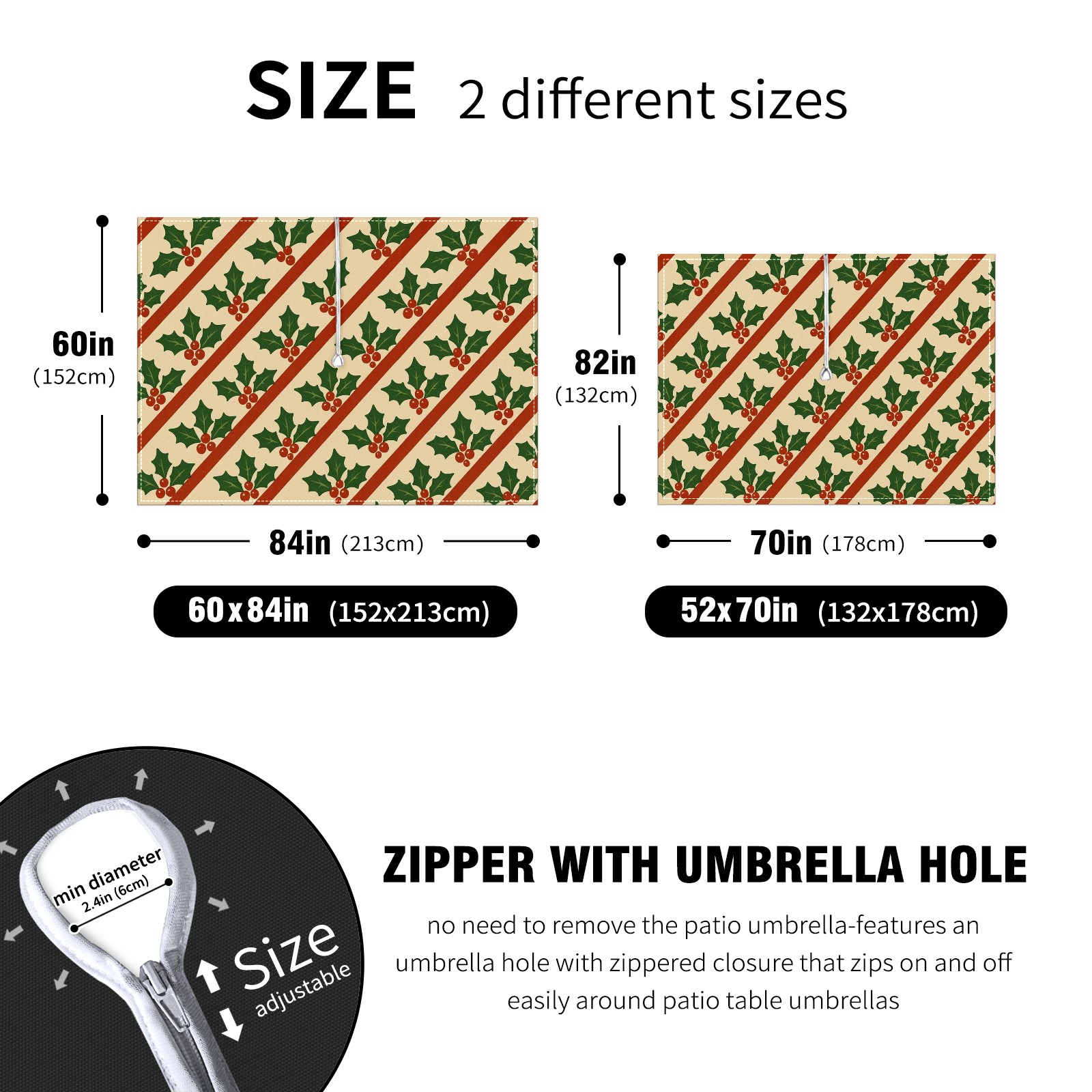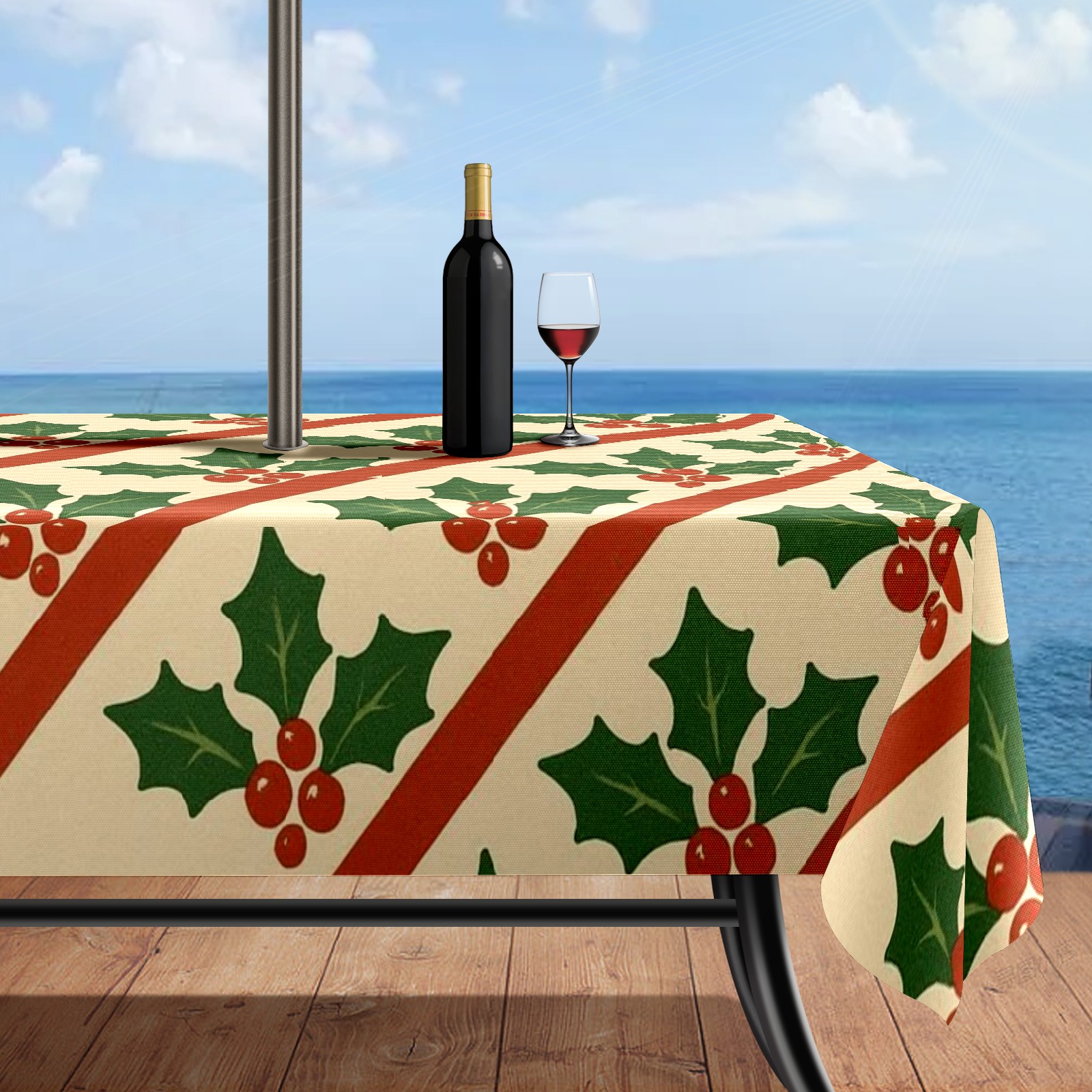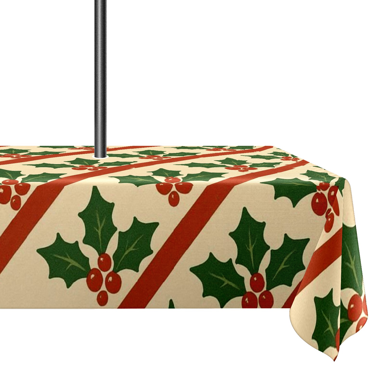 Zipper Square Tablecloth with Holly Leaf Beige Red Green Striped | Waterproof Outdoor Patio Cover for 6-8 Seater Table, 52x70 Inch, Easy to Clean & Setup