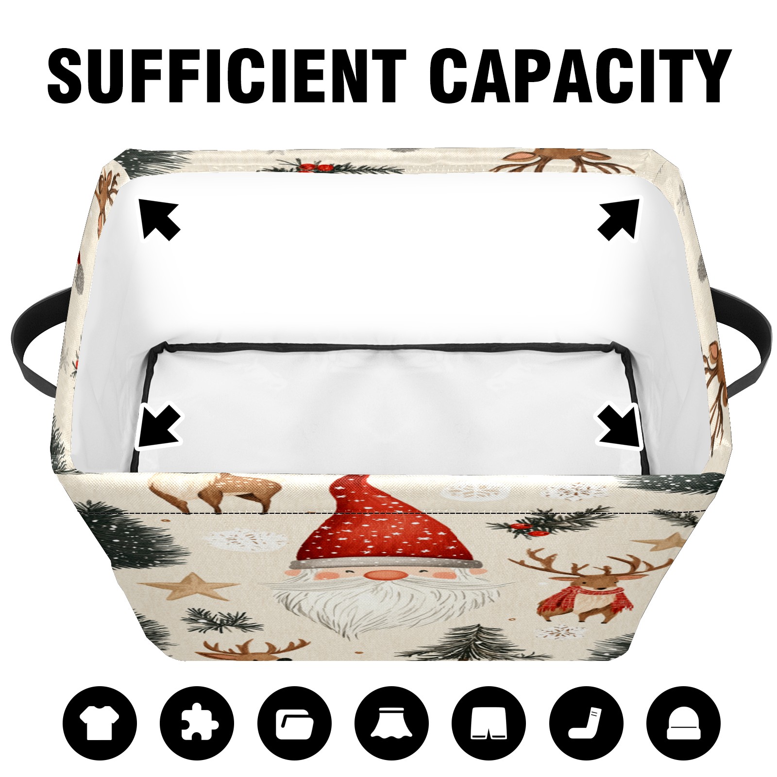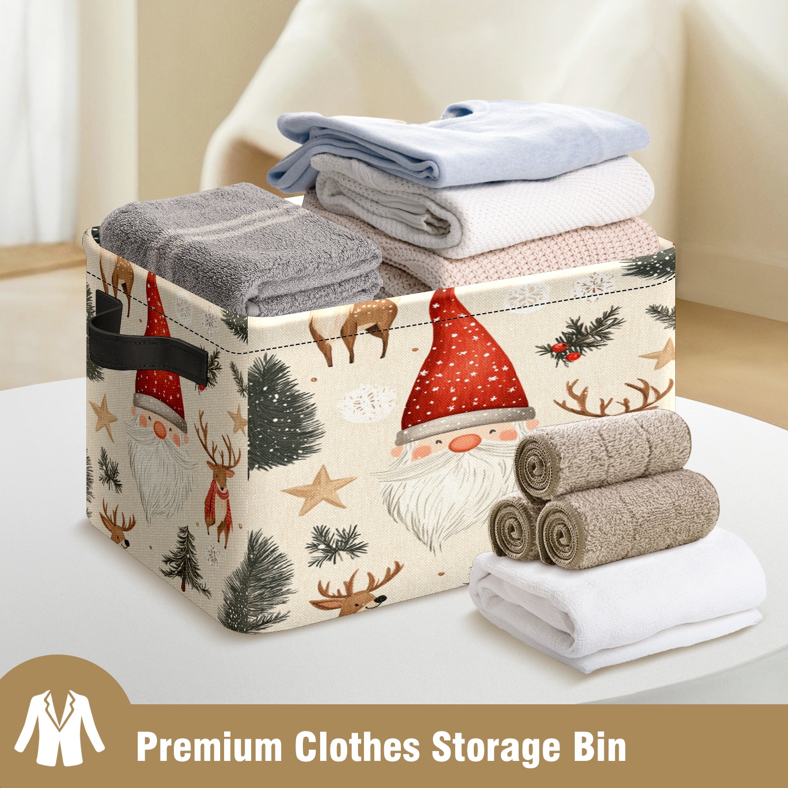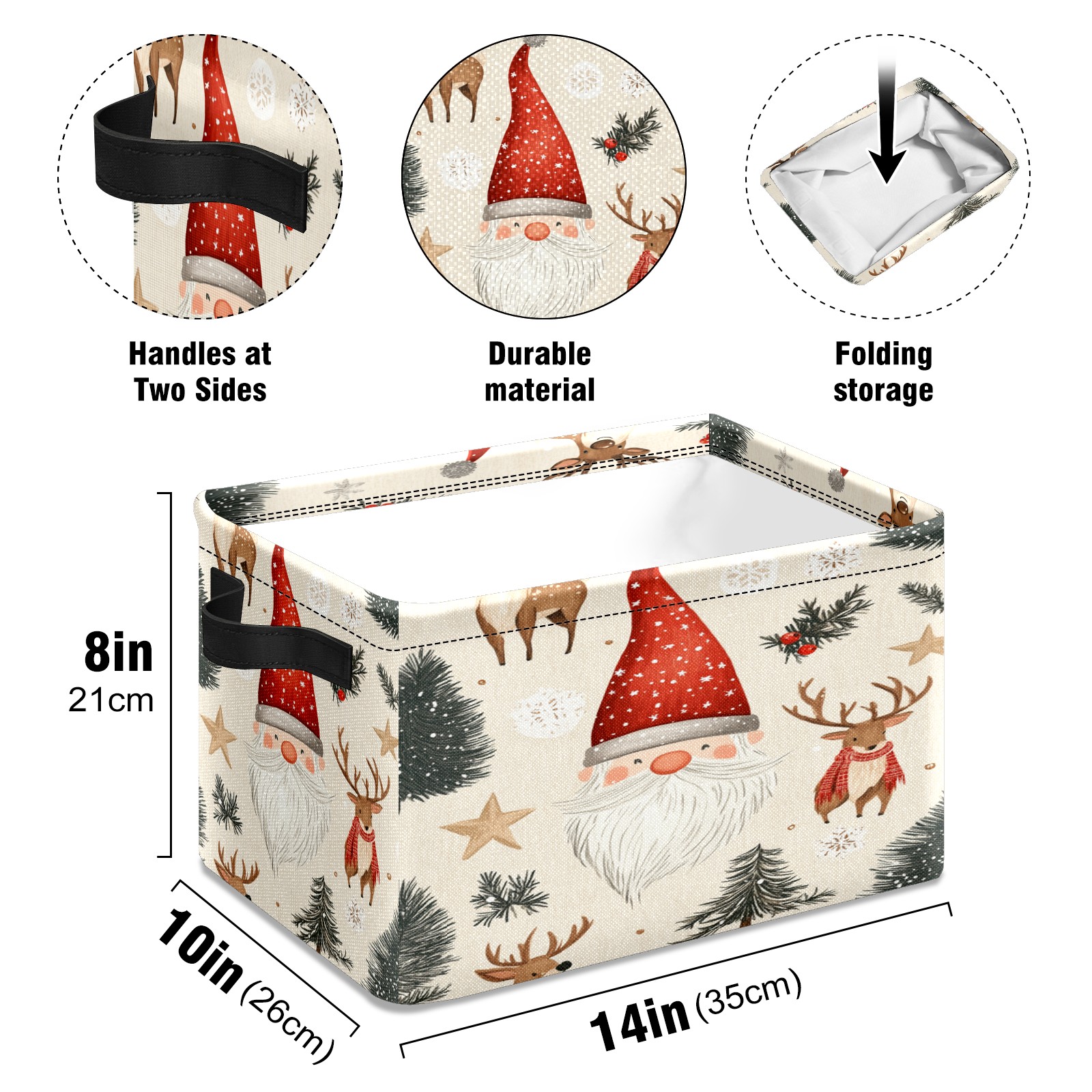 <p>This storage basket can be used for a variety of purposes, including bedroom organization baskets, laundry storage boxes, toy storage boxes, bathroom towel cube storage boxes, toilet storage containers, book and magazine storage boxes, holiday decoration storage cubes, living room storage, etc. The spacious size of 10×14×8 inches gives it ample storage capacity. This Christmas-themed storage basket is a great household item that combines practicality with a festive atmosphere! Made of easy-to-clean Oxford cloth, daily dirt can be cleaned by gently wiping with mild soapy water. With a sturdy metal frame and hard bottom support, it ensures a crisp shape when stored, but also needs to avoid machine washing to extend its service life. It is lightweight and flat after folding, taking up no space</p>